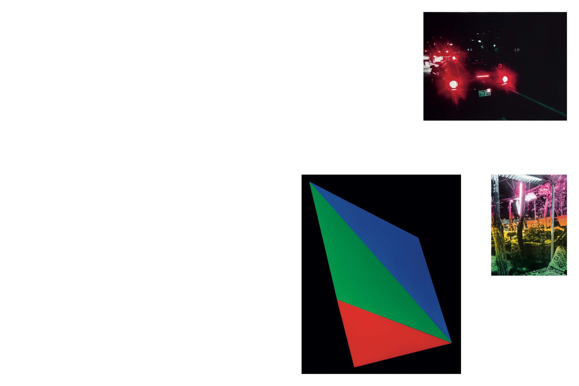 The catalogue First Things First comprises a selection of images from a number of Shirana Shahbazi’s photographic series created over the past ten years. The presentation of some fifty works is not necessarily categorically or linearly organized; rather, it appears completely free of hierarchy, with photographic styles, subjects, and techniques displayed on equal footing. First Things First emphasizes a juxtapositional approach, a dynamic and free arrangement of various subjects and styles: unspectacular landscapes are placed alongside fruit and flower still lifes; seemingly casual urban scenes sit alongside geometric shapes; colored compositions are in contrast to black-and-white images.