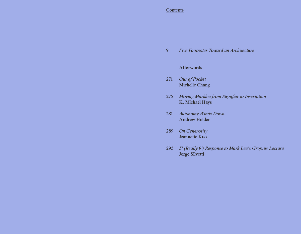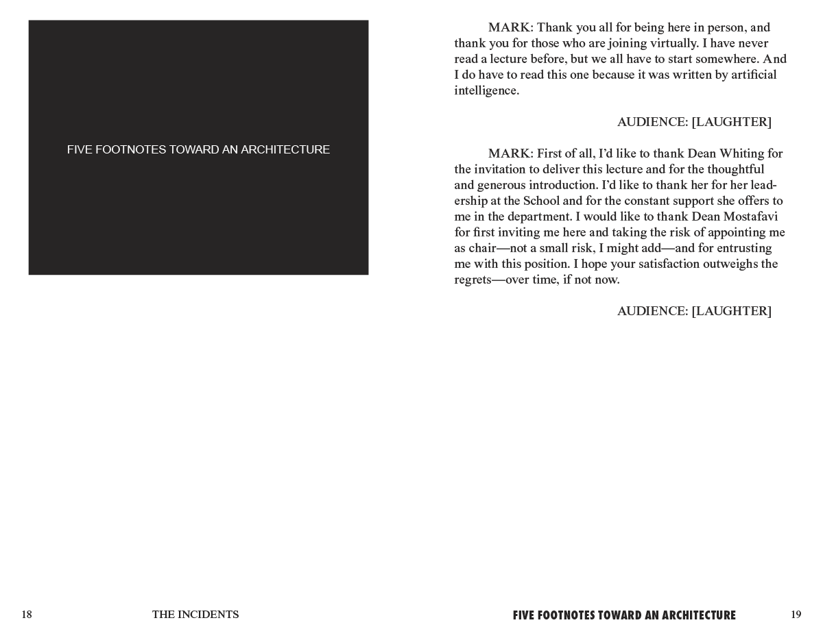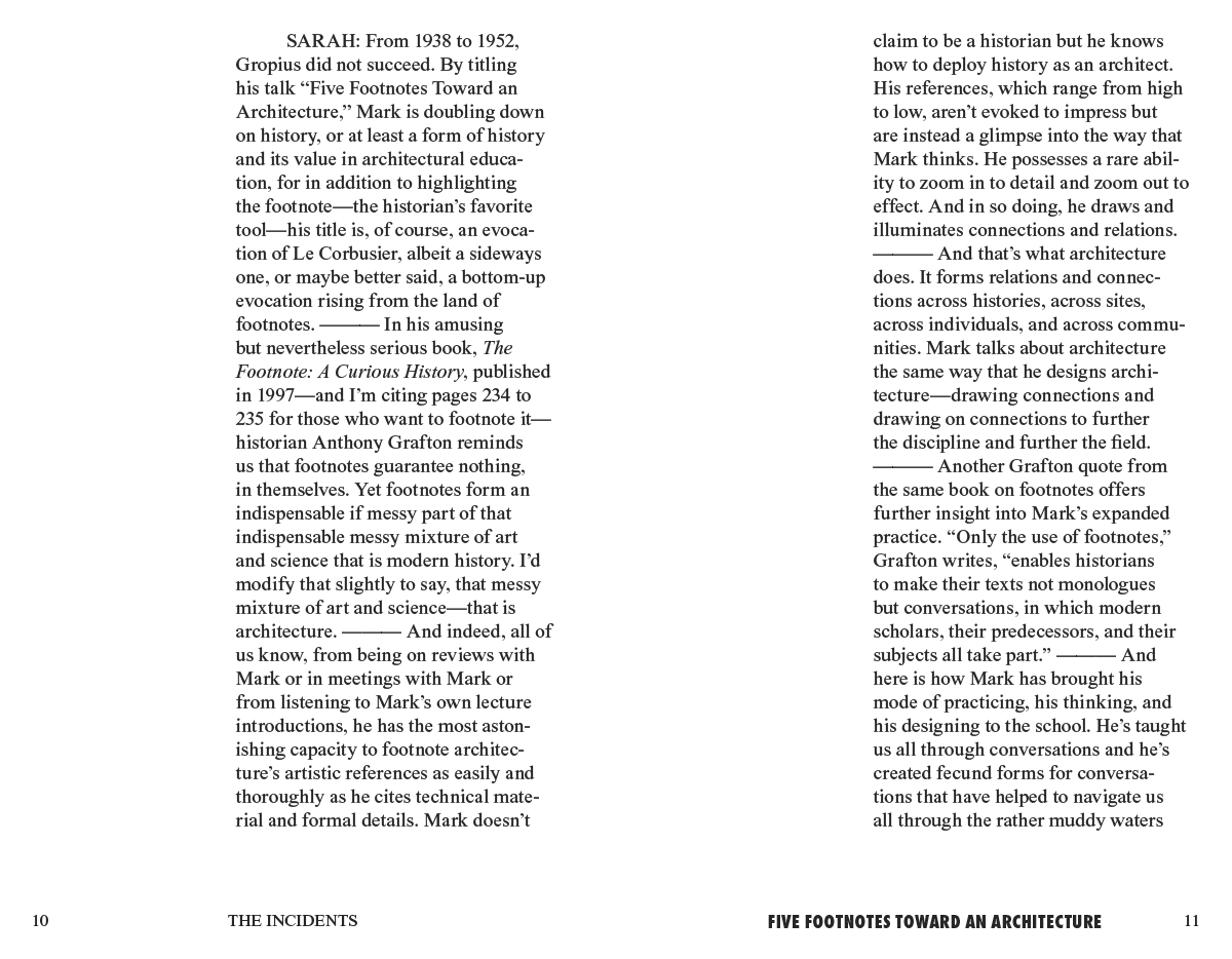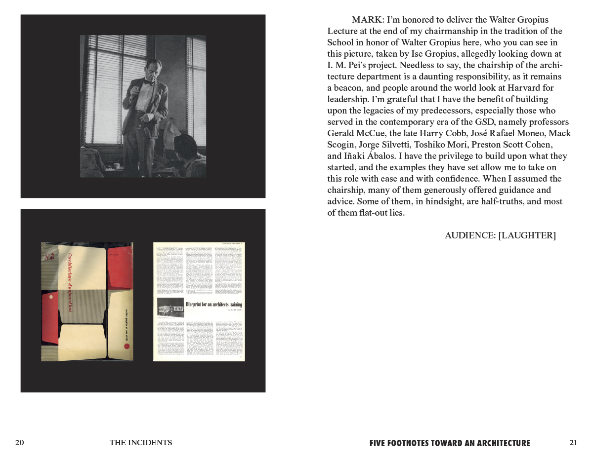On the occasion of his fifth and final year as Chair of the Department of Architecture at the Harvard University Graduate School of Design, architect and educator Mark Lee strings together five “footnotes”—on history, on cadence, on autonomy, on America, and on point—to assess the relationship between architectural education, research, and professional practice. Evoking a similar position that marked his tenure, Lee delivers a lecture that embraces dialogue, context, and precedent, and rejects the notion of a heroic manifesto in favor of the footnote: “something ancillary, something used for referencing and providing citations for metanarratives that already exist.” And why five? “It’s a ubiquitous number in the culture of architecture. Five orders, five architects, five points.”