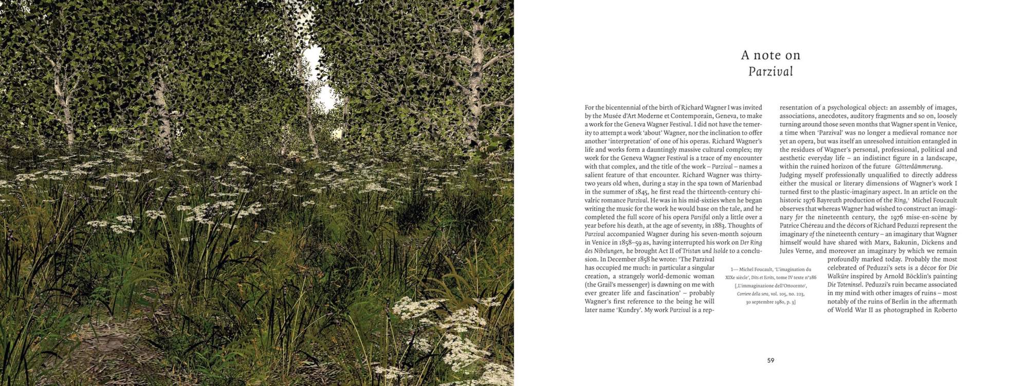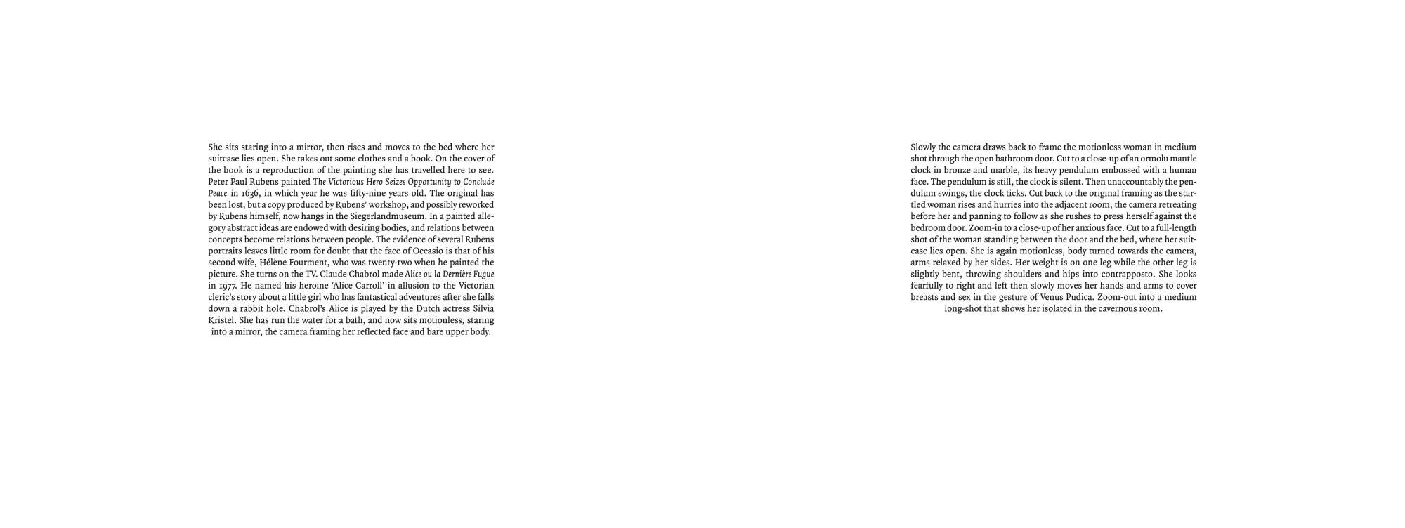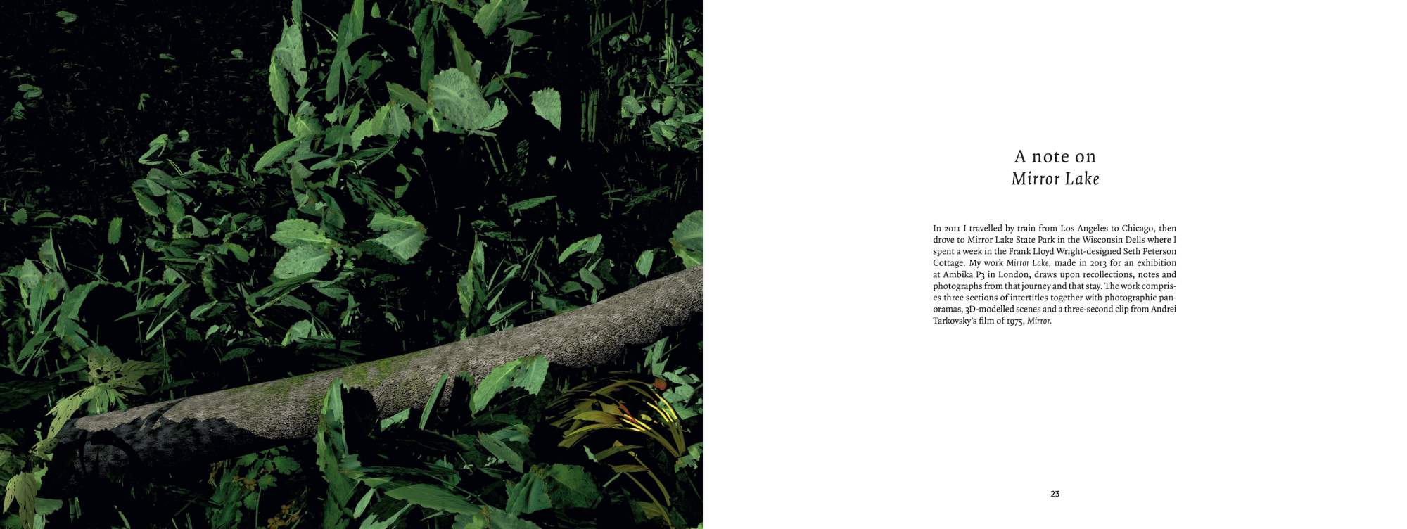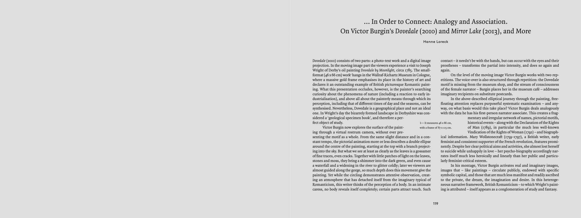 Like a visual diary, a fictional narrative, or historical document, Burgin’s projection work takes us on a journey to different places and situations. This publication too reads like a film or a moving storyline where real and imaginary images are activated and intertwined through the use of photographs, paintings, and brief textual recollections. Hanne Loreck’s detailed essay discusses some of Burgin’s digital image projections, such as Dovedale (2010) and Mirror Lake (2013), considering the visual-textual effect of Burgin’s work and the atmospheres created that trigger numerous associations in the viewer—of a book, a film, or a personal memory.