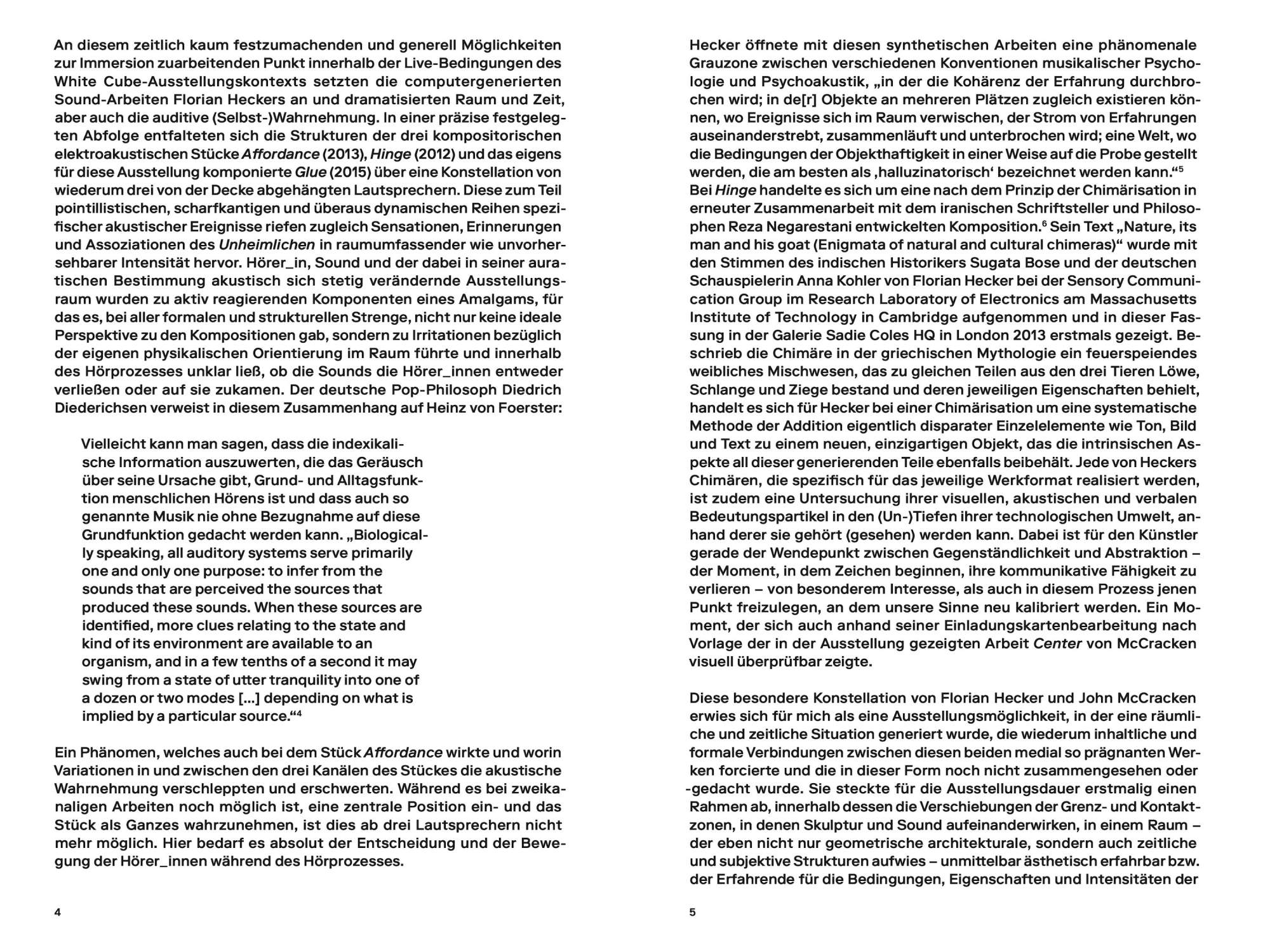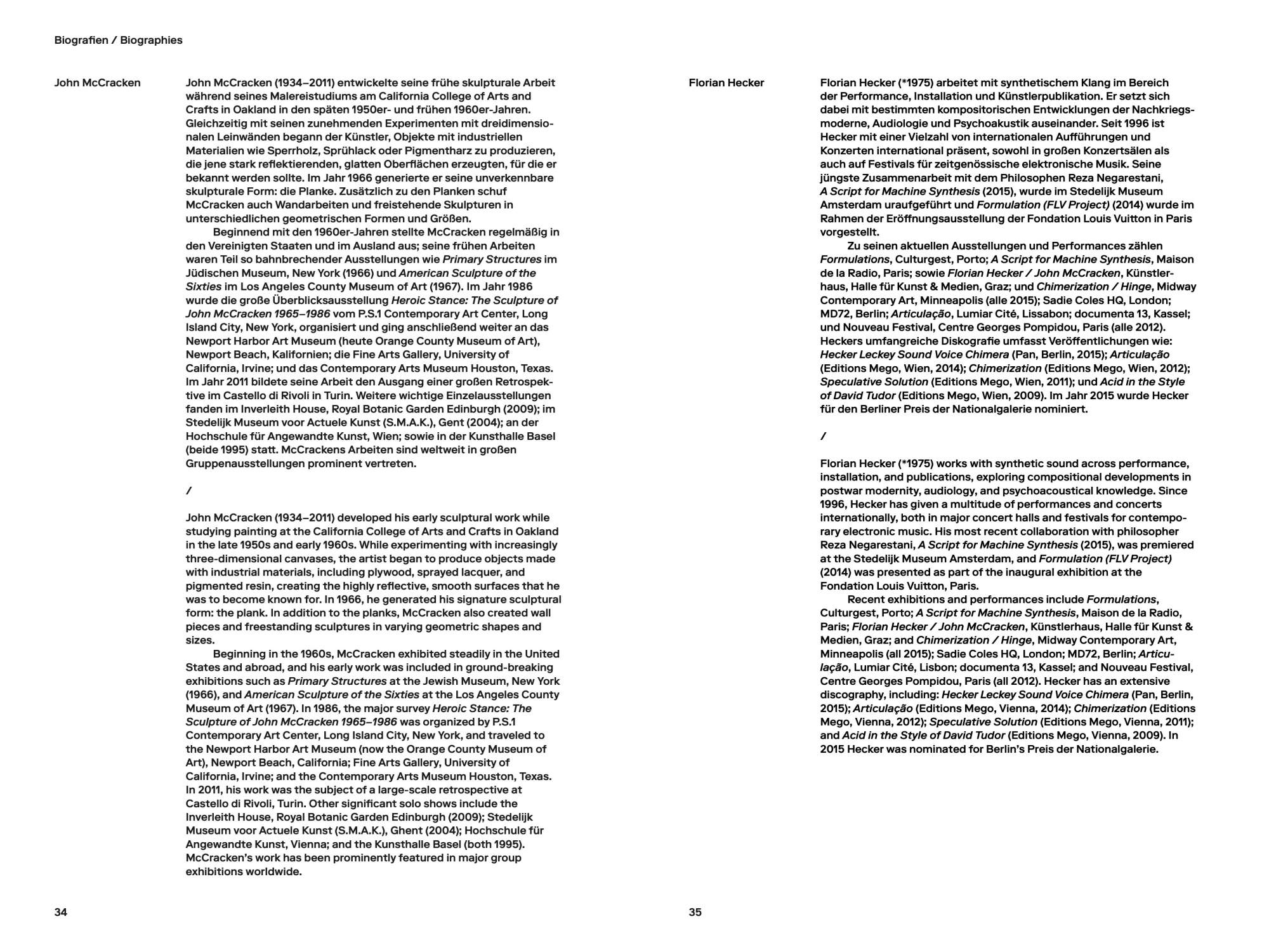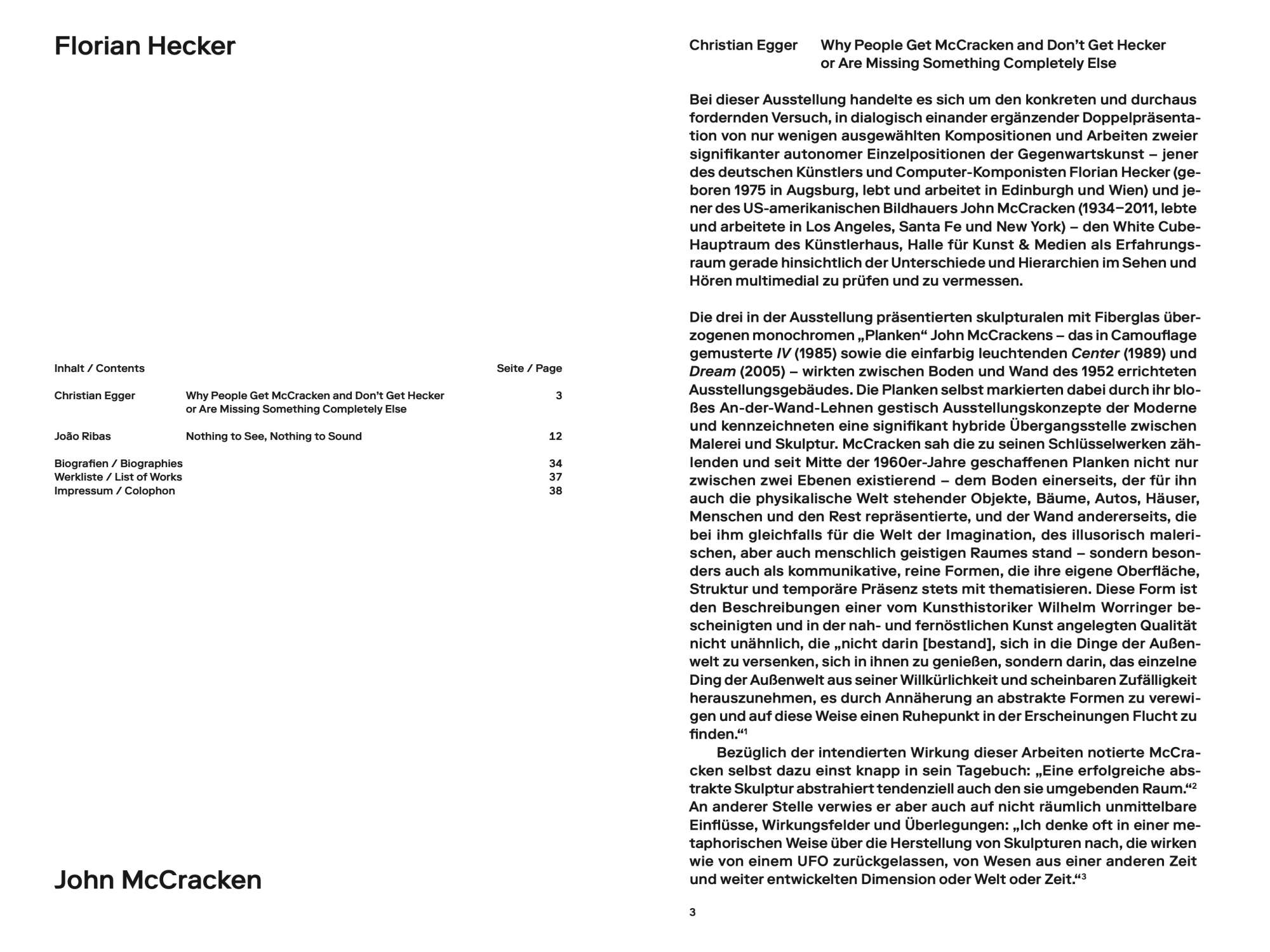 Following the 2015 exhibition “Florian Hecker/John McCracken” at Künstlerhaus, Halle für Kunst & Medien Graz, this publication probes the experimental capacity of the white-cube space of the gallery. For the exhibition, two complementary yet autonomous artists were brought into dialogue with each other: German artist and computer composer Florian Hecker, and the late American sculptor John McCracken.