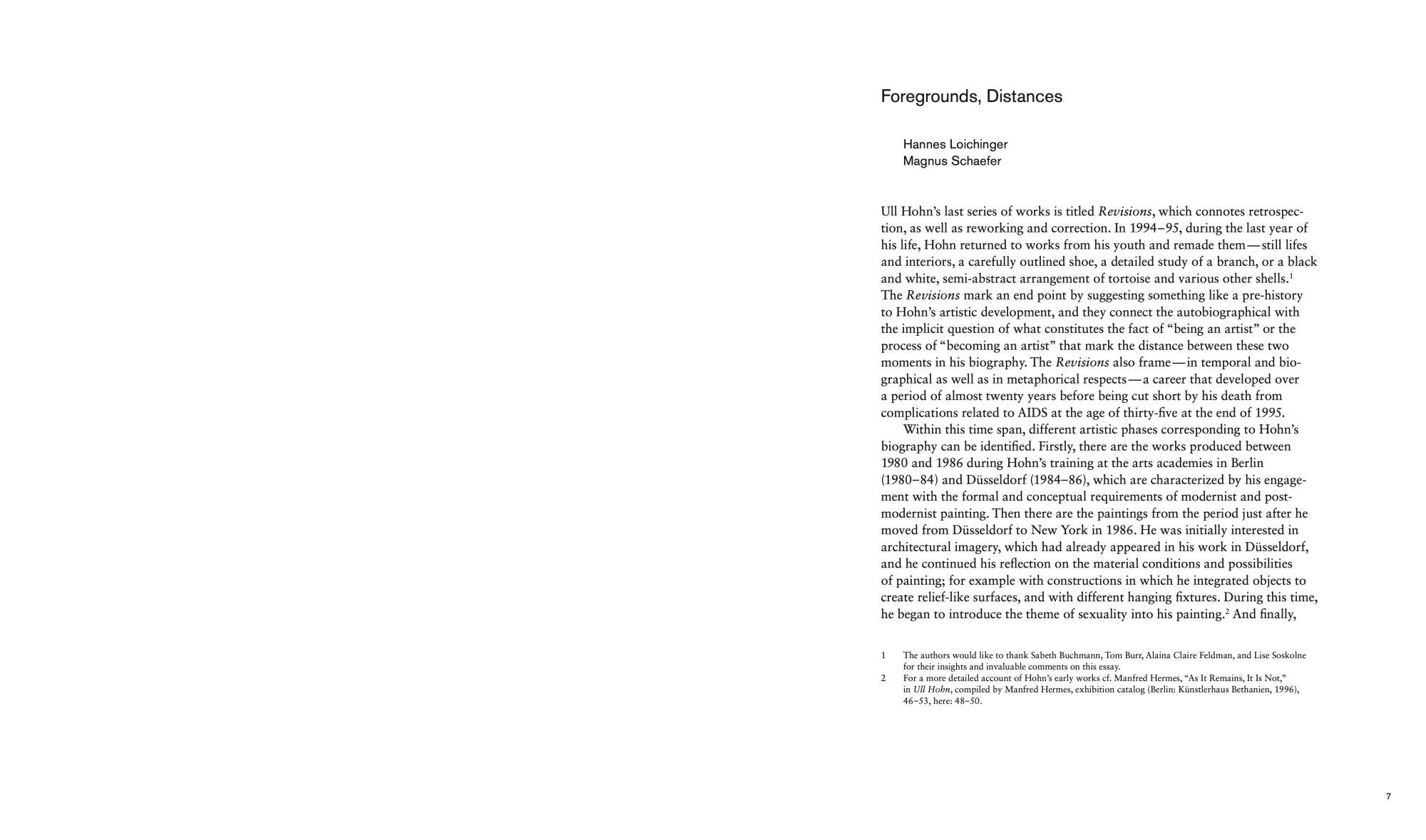 Ull Hohn: Foregrounds, Distances aims not only to offer the first comprehensive overview of his work, but also to contribute to a history of painting-based practices, which occupy a marginal place in the established narratives of the art of the 1980s and 1990s.