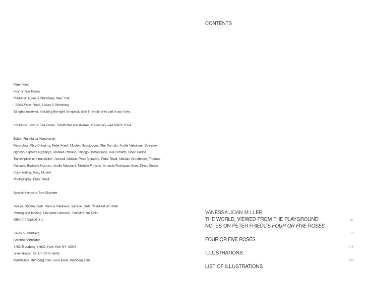 Four or Five Roses continues Friedl’s exploration of the stereotypical language of the monologue genre. The book contains some 45 children’s “monologues,” edited by the artist from numerous interviews and conversations recorded on playgrounds in South Africa. Faithfully transcribed and translated into English from different South African languages (Afrikaans, Northern and Southern Suthu, Zulu, Xhosa ...), the “edited monologue” then becomes a hybrid genre, both fictionalised speech and serious counter-voice. What is ultimately at stake is how discursive strategies operate as a political tool, endlessly reshaped and manipulated for the sake of persuasion. The texts are accompanied by color illustrations of the actual South African playgrounds.