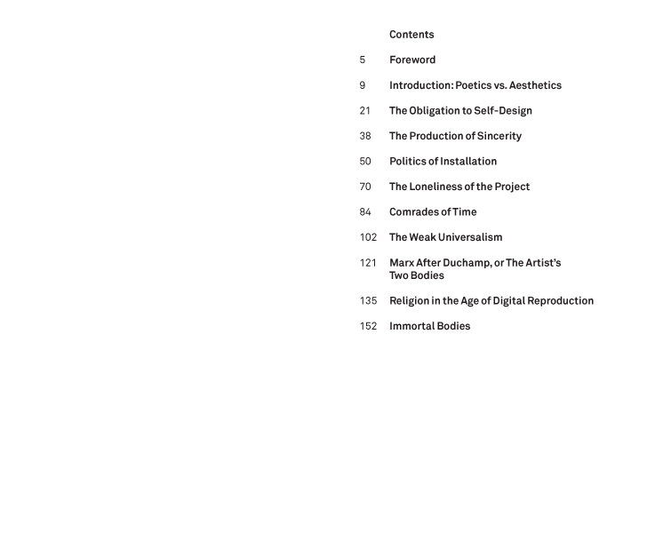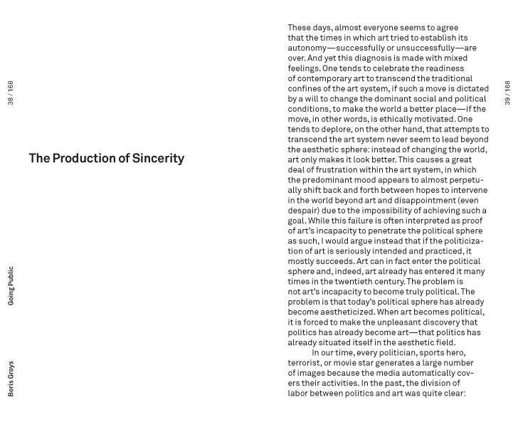 If all things in the world can be considered as sources of aesthetic experience, then art no longer holds a privileged position. Rather, art comes between the subject and the world, and any aesthetic discourse used to legitimize art must also necessarily serve to undermine it. Following his recent books Art Power and The Communist Postscript, in Going Public Boris Groys looks to escape entrenched aesthetic and sociological understandings of art—which always assume the position of the spectator, of the consumer. Let us instead consider art from the position of the producer, who does not ask what it looks like or where it comes from, but why it exists in the first place.