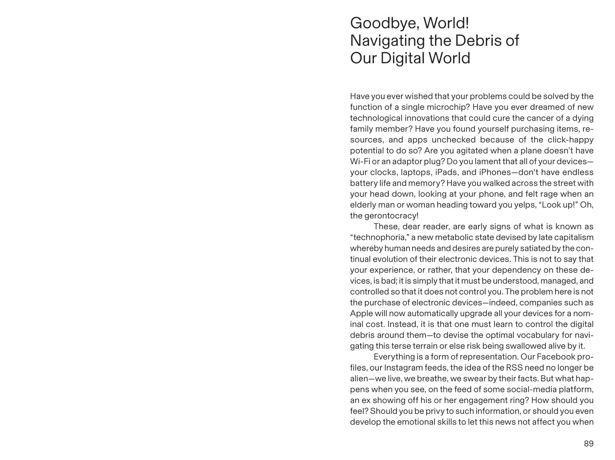 Omar Kholeif pushes forward our rapidly evolving understanding of contemporary art in the digital age. Goodbye, World! is an essential survey of the widening field of digital forms and formats and the growing number of artists that give this art its expression. Moreover, it is a fresh and necessary exploration of the very ontology of the work of art that digital movements force us to reevaluate.