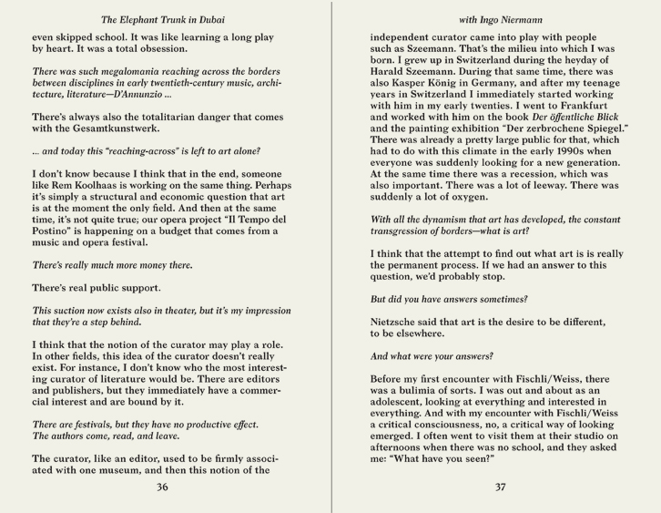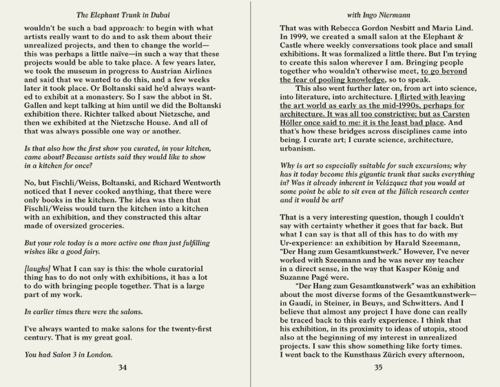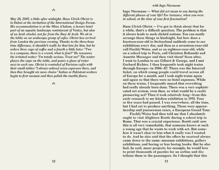 Everything you ever wanted to know about Hans Ulrich Obrist but were afraid to ask has been asked by the sixteen practitioners in this book. Spanning the beginning of his “career” as a young curator in his Zurich kitchen to his time most recently as the Co-Director of Exhibitions and Programs, and Director of International Projects at the Serpentine Gallery in London, the book is a “production of reality conversations.” It undertakes the impossible: pinning down this peripatetic curator, attempting to map his psychogeography so that silences may be transcribed. In a sense, it organizes a “protest against forgetting” and affirms the sagacity of an artist who told this dontstop curator “don’t go” when he “contemplated leaving the art world” for other fields—“to go beyond the fear of pooling knowledge”—in lieu of bringing other fields into the (then) hermetic art world.