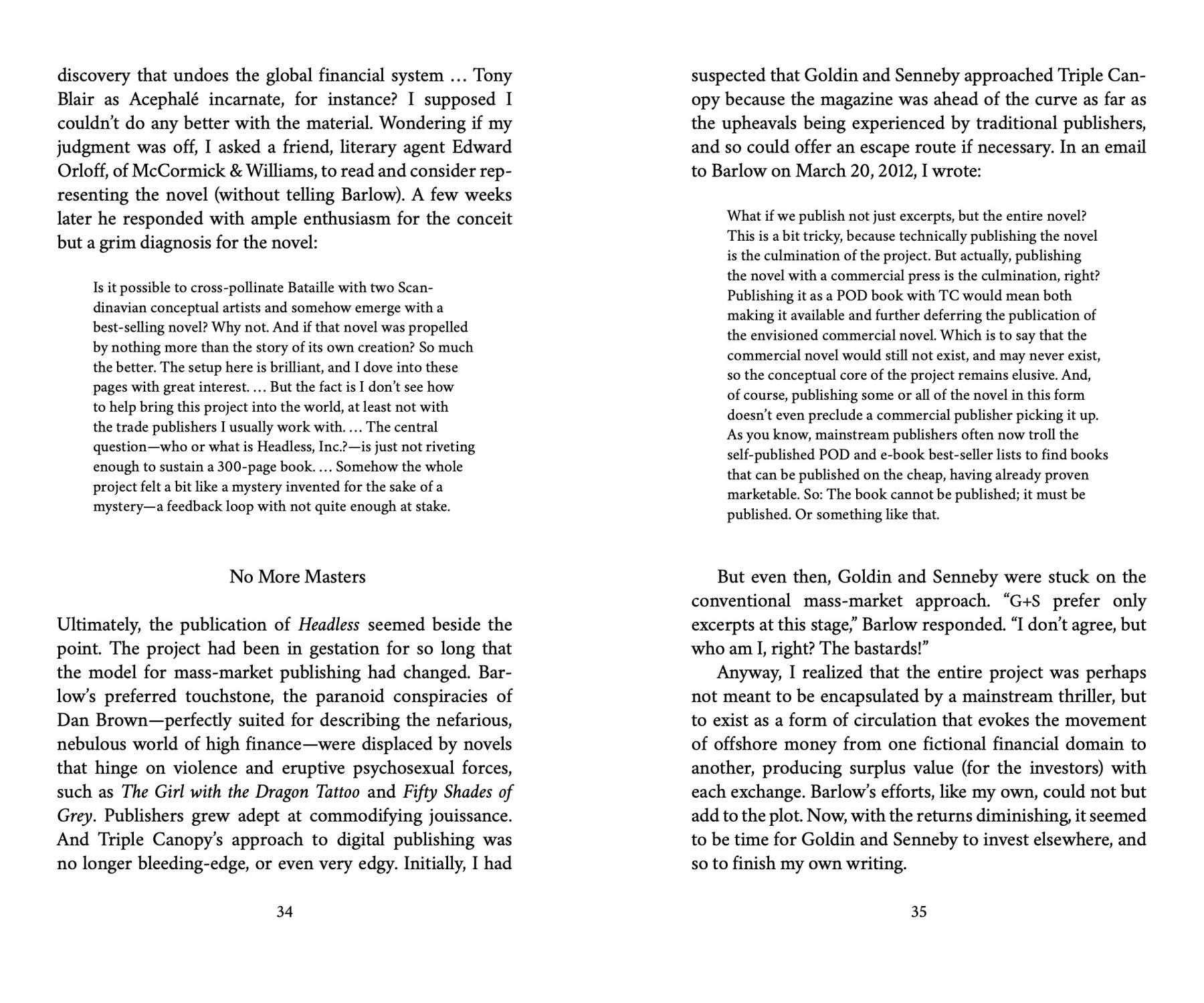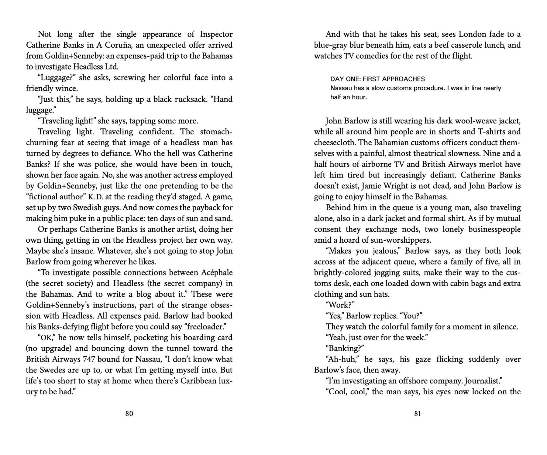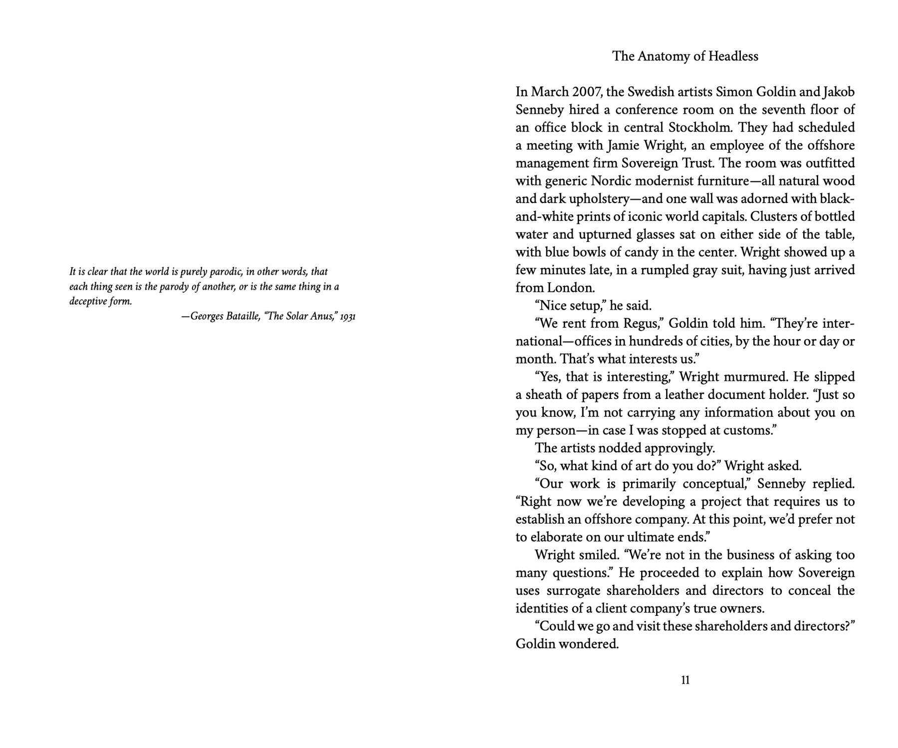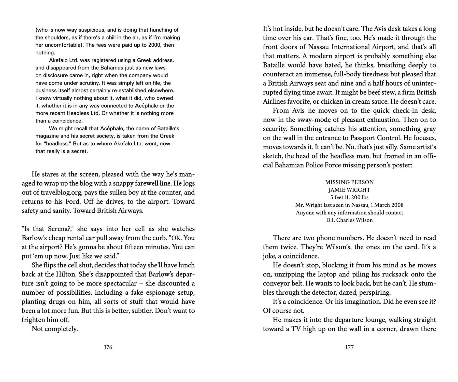 When workaday author John Barlow is asked to ghostwrite a novel about secretive tax havens, he assumes the job will be straightforward. Then he learns that his employers, Swedish conceptual artist duo Goldin+Senneby, want him to investigate Headless Ltd, a shadowy company with possible links to French philosopher Georges Bataille, famed for his fixation with human sacrifice. Barlow travels to Nassau, the mecca of offshore finance, to uncover the plot. He is not alone. A beautiful, mysterious woman is also seeking the truth about Headless—and about Barlow. One day the ghostwriter is happily posting to his travel blog; the next he is implicated in the decapitation of a police officer, consumed by the dark world of covert capitalism and secret societies. Barlow’s probing becomes desperate. The more he grasps at the threads of the labyrinthine plot, the closer he comes to madness.
