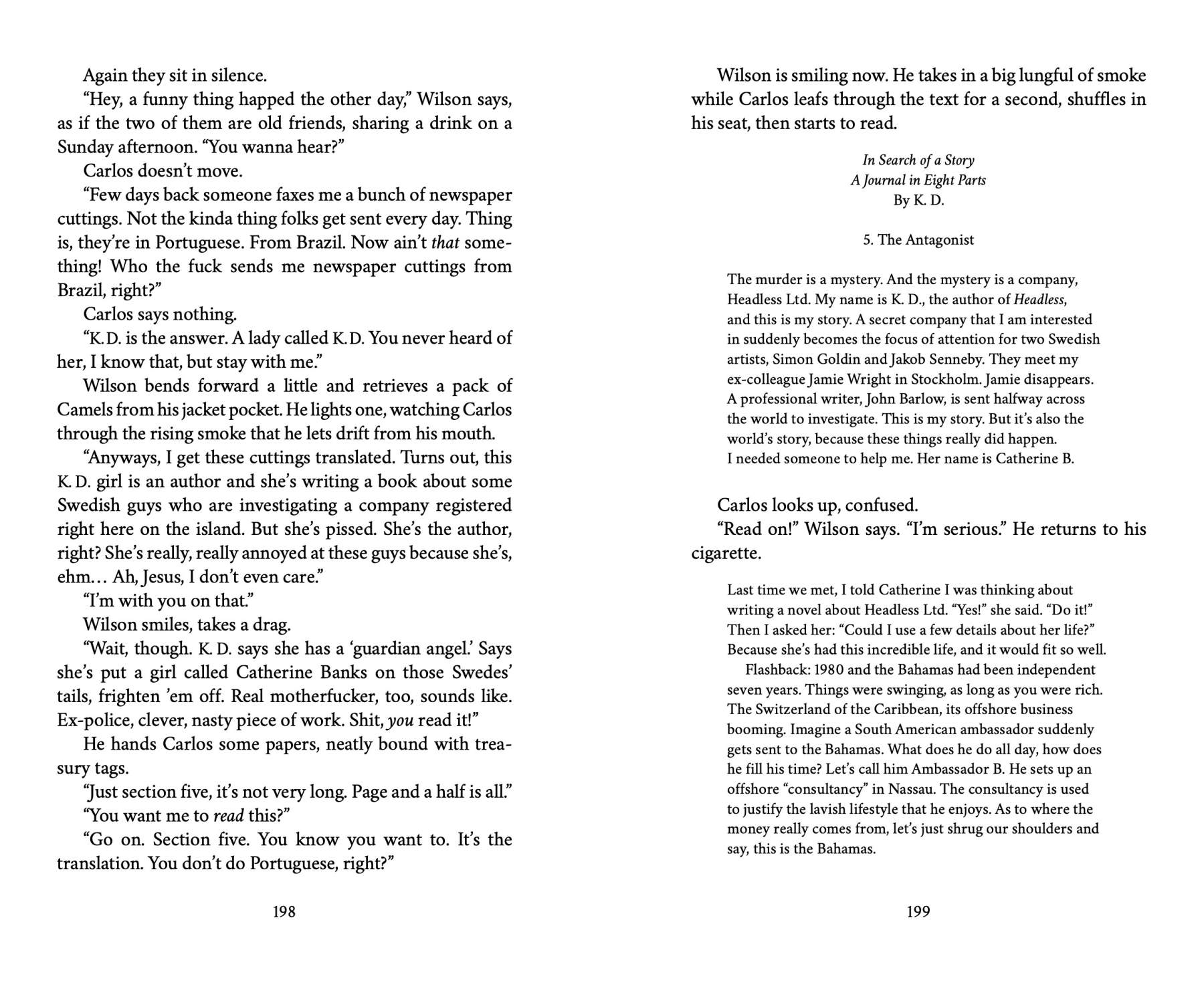 K. D. has created a masterwork of metaphysical detective fiction. Headless is a coded, clandestine novel that nevertheless makes for breathless reading until the last page.