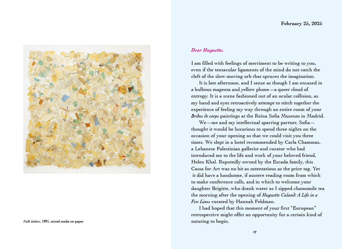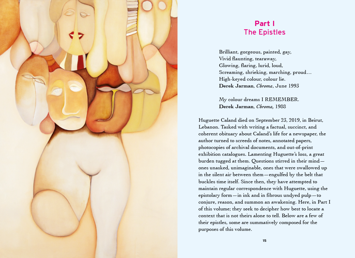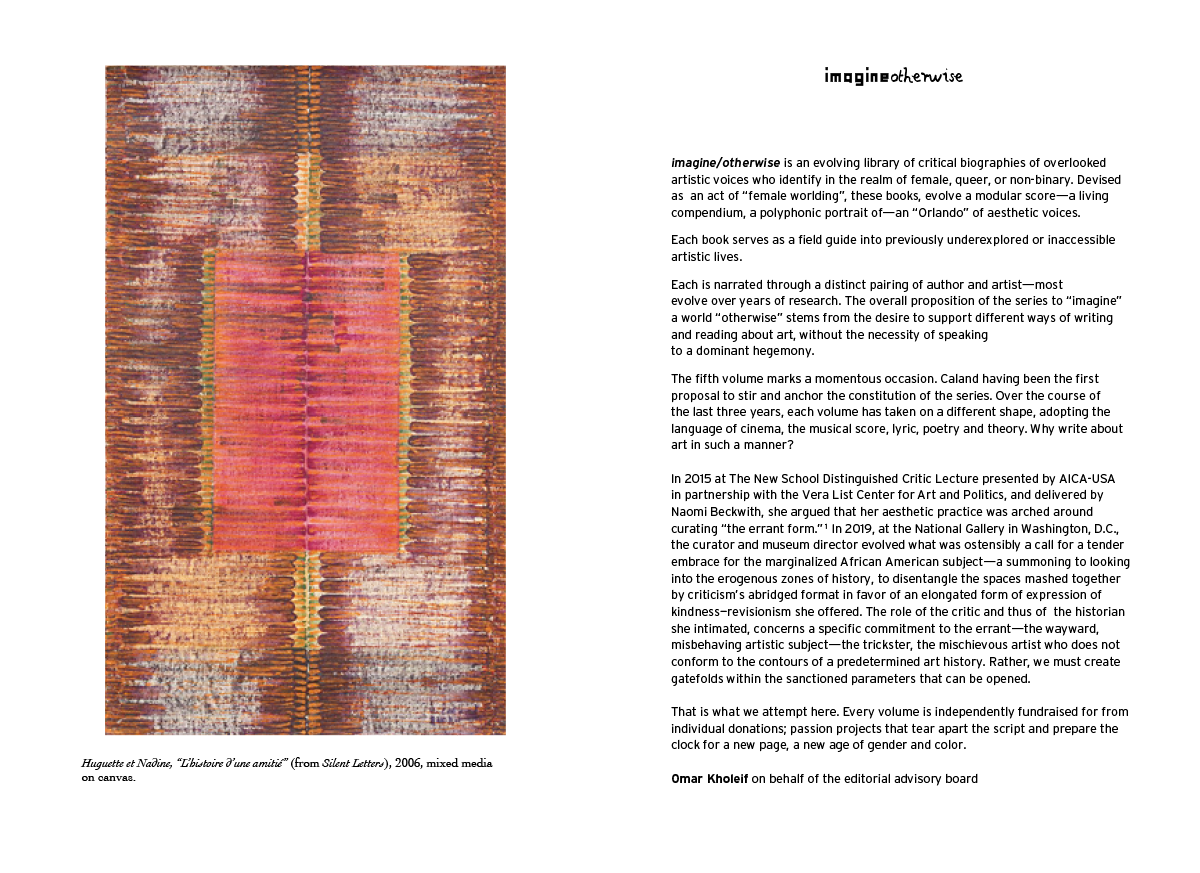 Both an epistolary memoir and a biography, Kholeif, interleaves the affective experience of encountering the artist over a period of 18 years, as readers are summoned on a journey through clouds of bristling color. Here, Caland’s fields of light are set to lyric prose and poetry, fashioning a scene for looking at and experiencing the erotics of art anew.