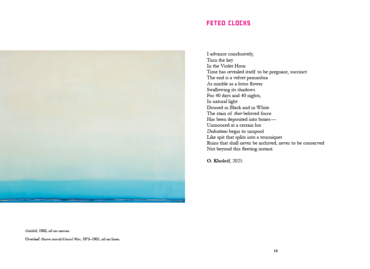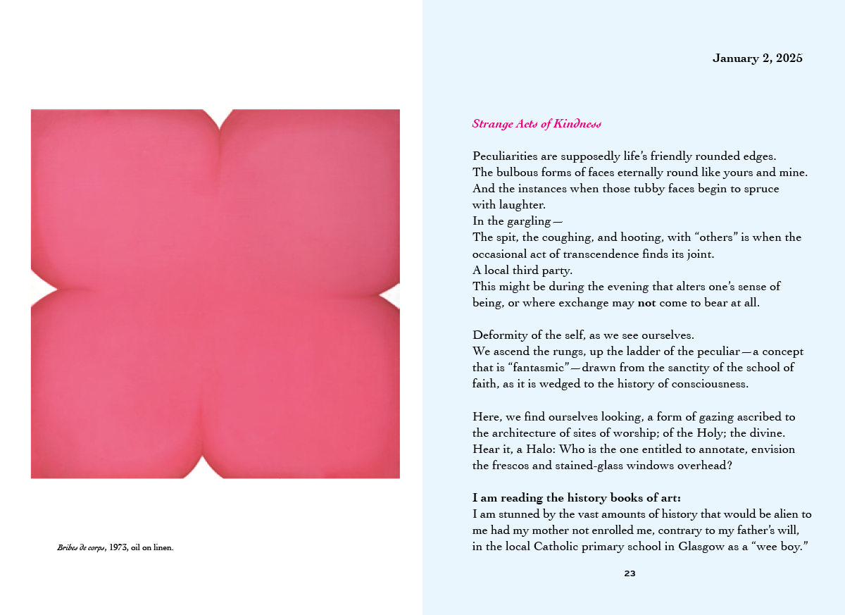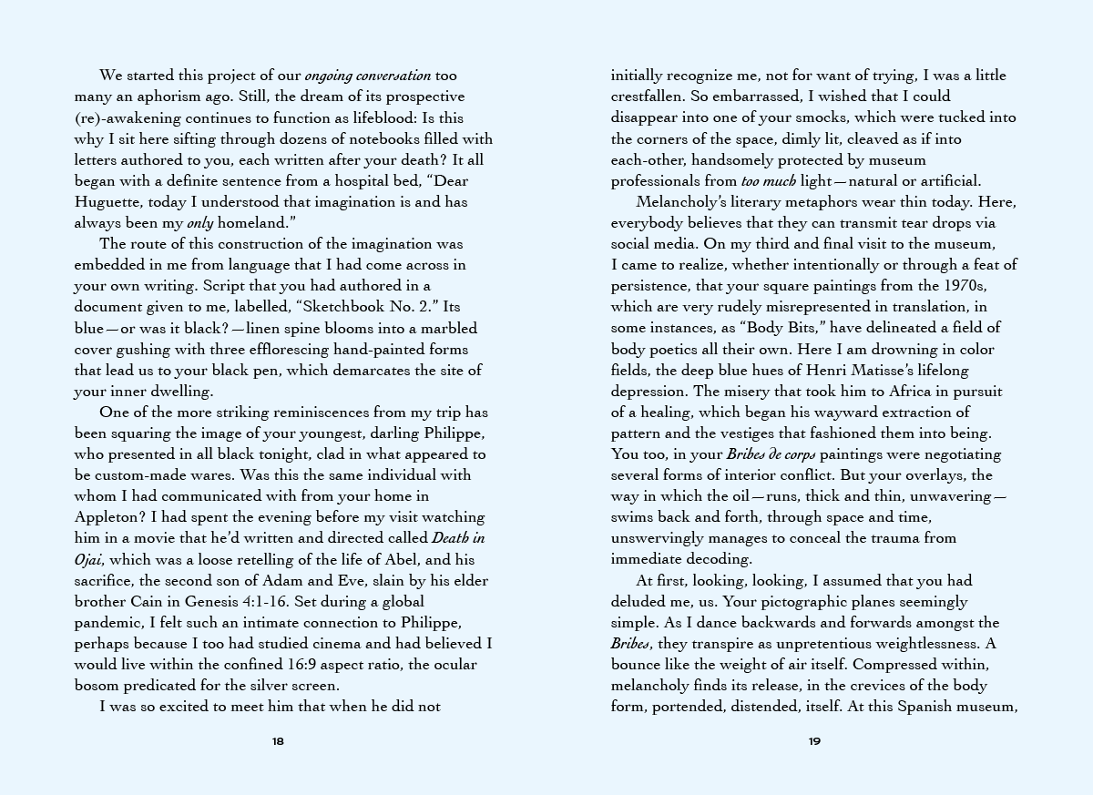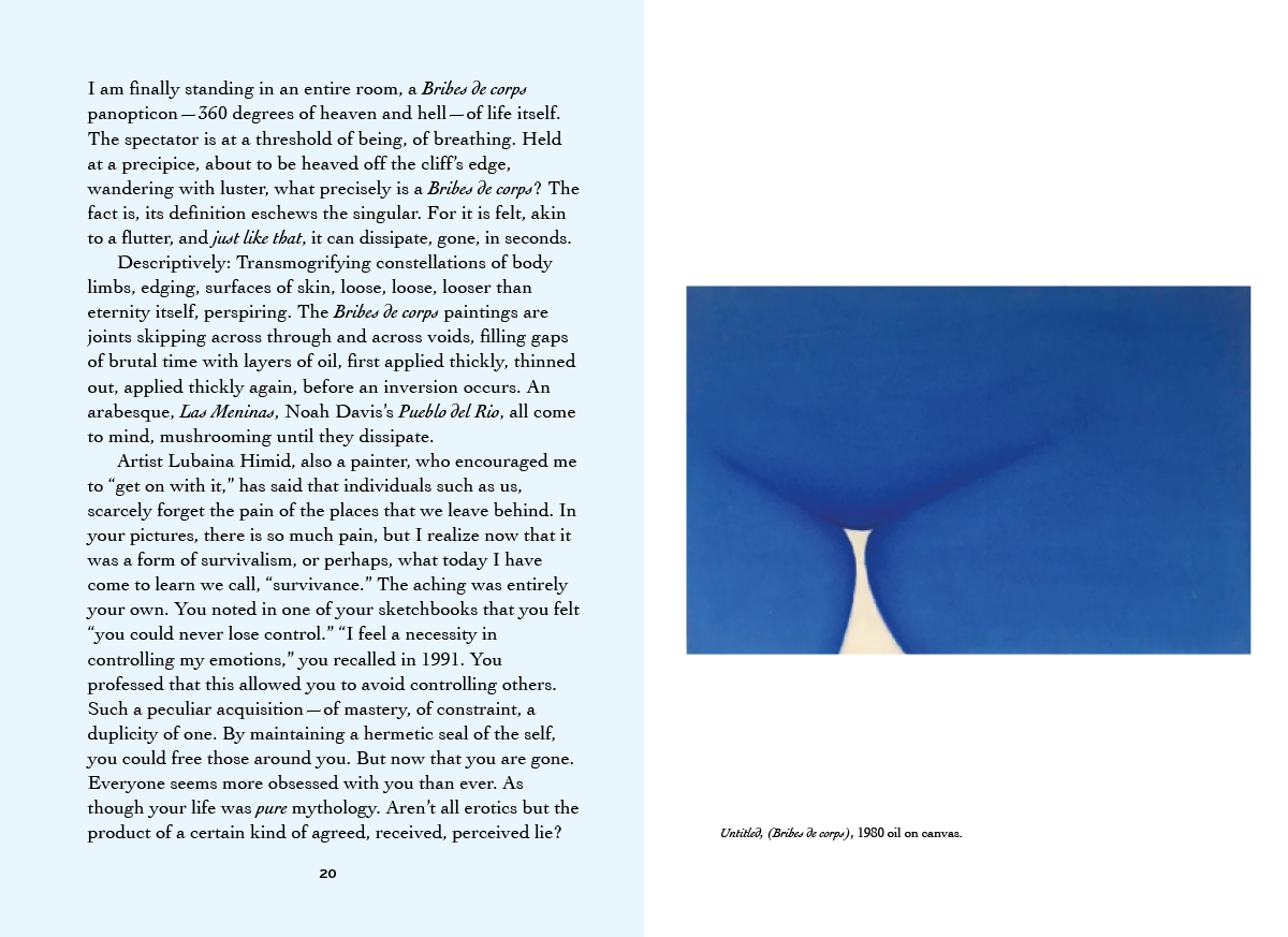 Both an epistolary memoir and a biography, Kholeif, interleaves the affective experience of encountering the artist over a period of 18 years, as readers are summoned on a journey through clouds of bristling color. Here, Caland’s fields of light are set to lyric prose and poetry, fashioning a scene for looking at and experiencing the erotics of art anew.