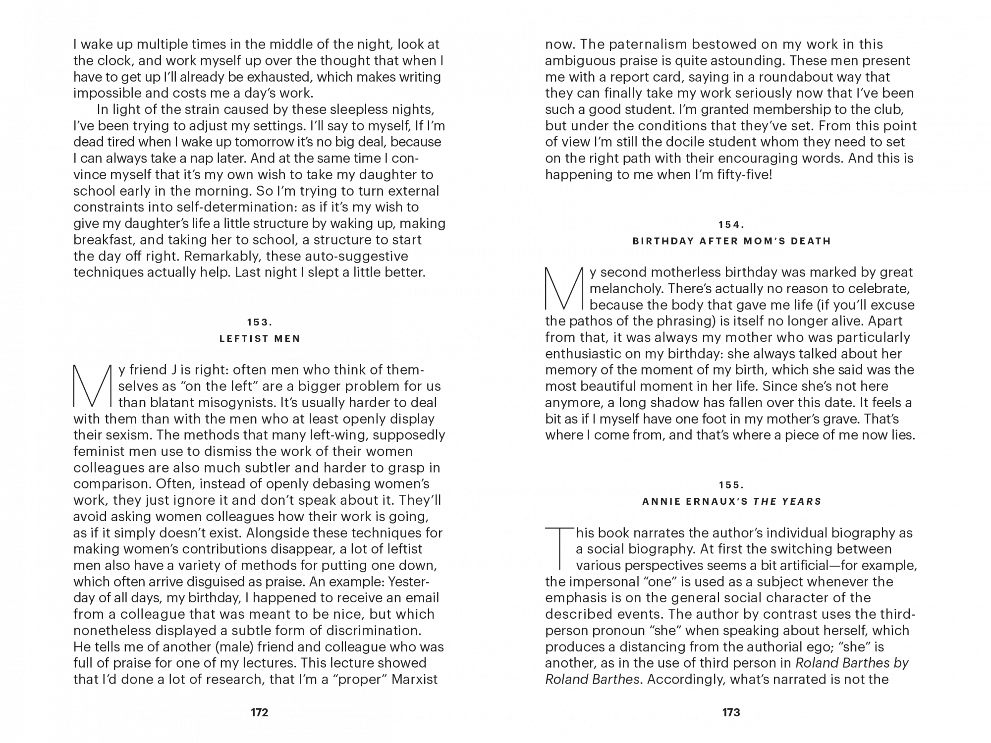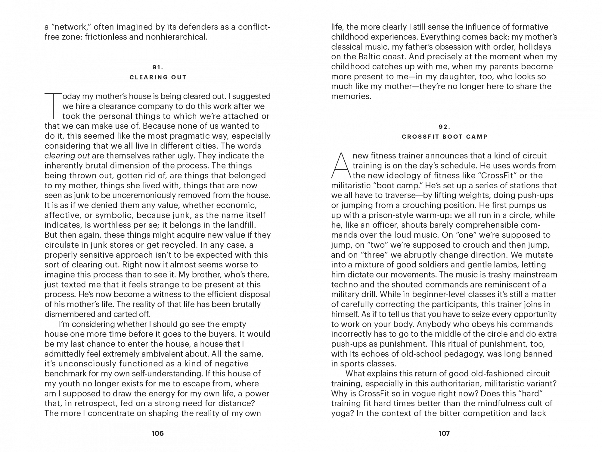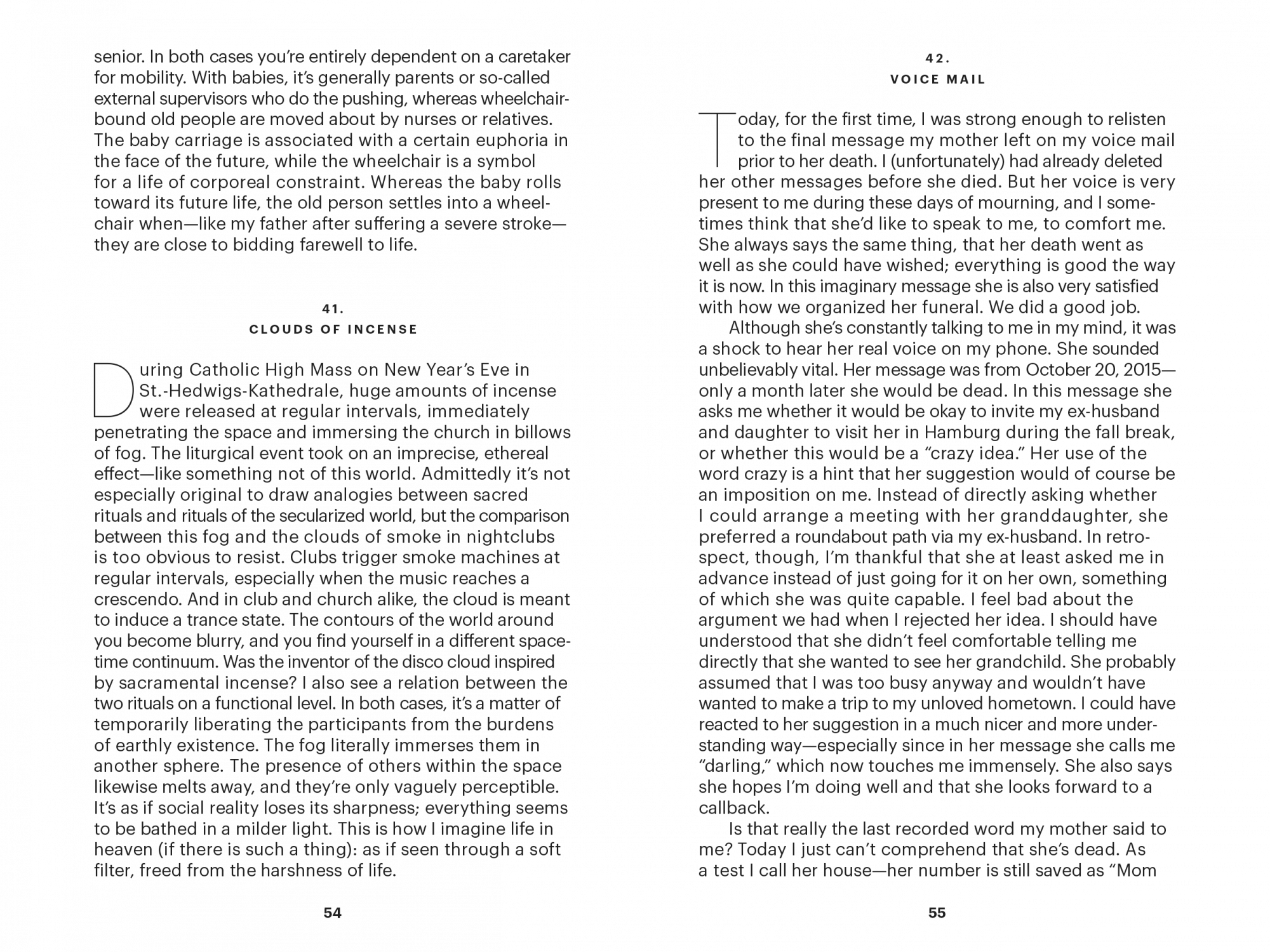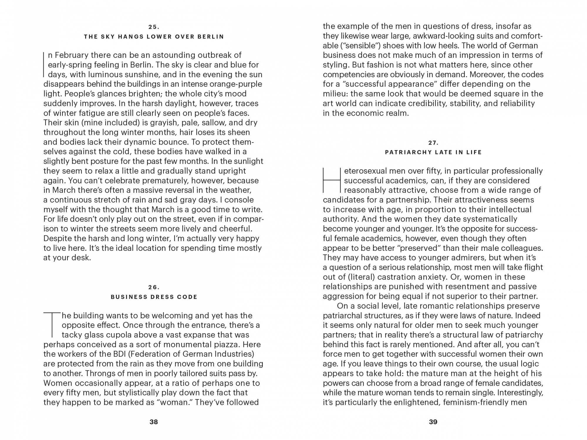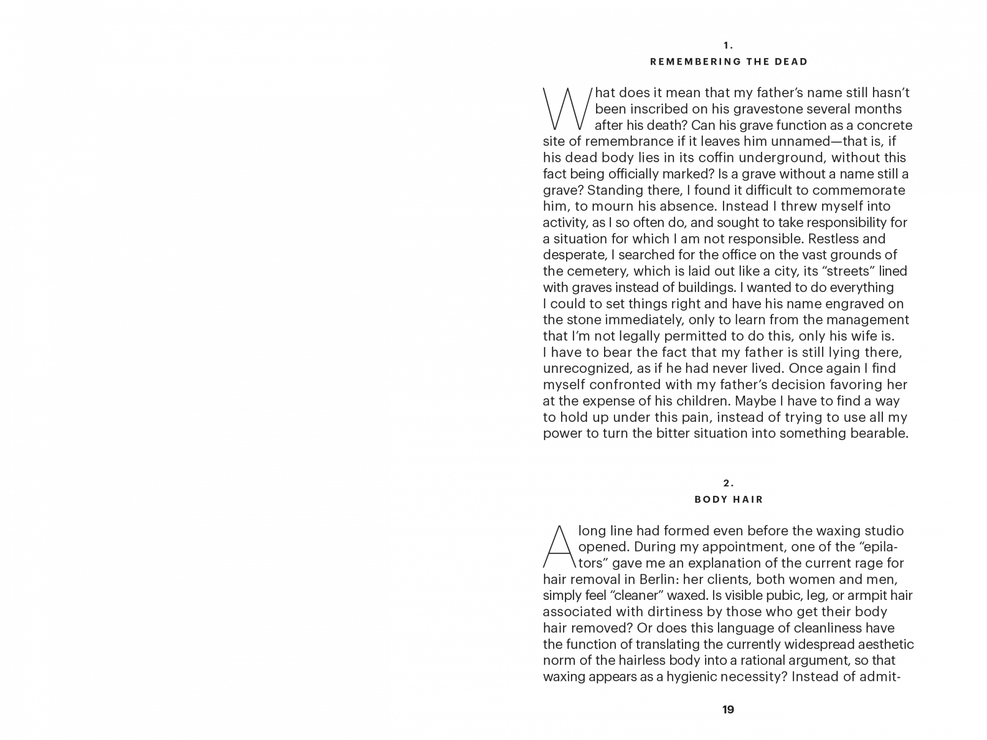 Merging memoir and social criticism in an original fashion, Isabelle Graw lays hold of the experiences and thoughts that don’t flow into her art-historical texts. In elegantly written miniatures, Graw captures radical political, social, and cultural changes that occurred between 2014 and 2017, analyzing how these macro-shifts reach into her own life. She addresses topics ranging from the general turn to the political right, as seen in Brexit and Trump, to #MeToo, men with beards, and Balenciaga. While registering the symptoms of a world that clearly feels different, Graw also meditates on irretrievable personal losses. She describes how we find ourselves in another world after the death of our parents. With the theme of mourning as a leitmotif, In Another World is an attempt at exposing and analyzing painful emotions. Never before has Graw spoken to the reader as directly and openly as she does in these 159 notes.