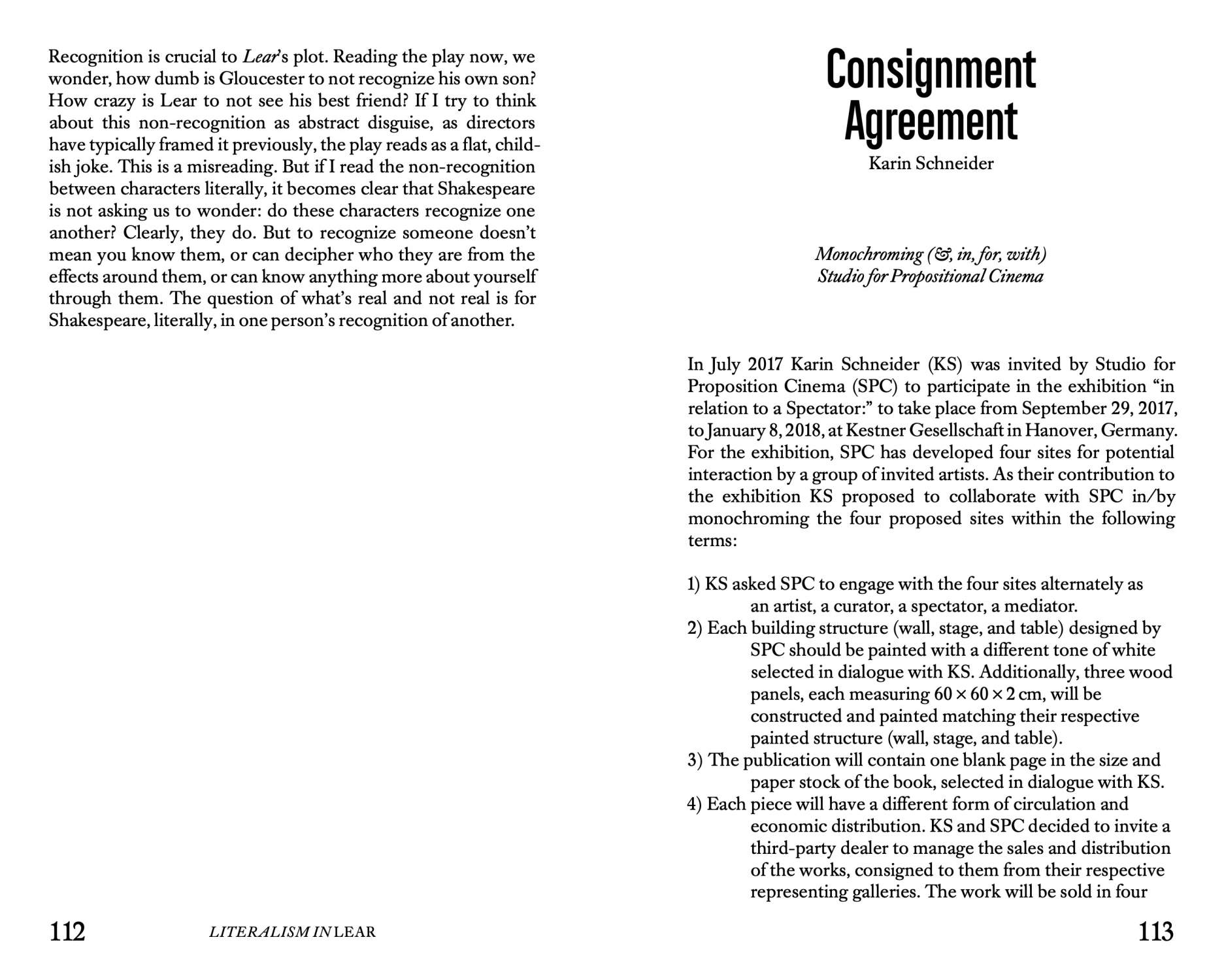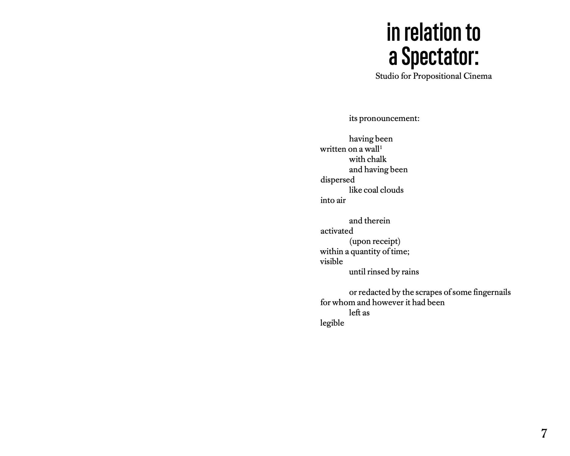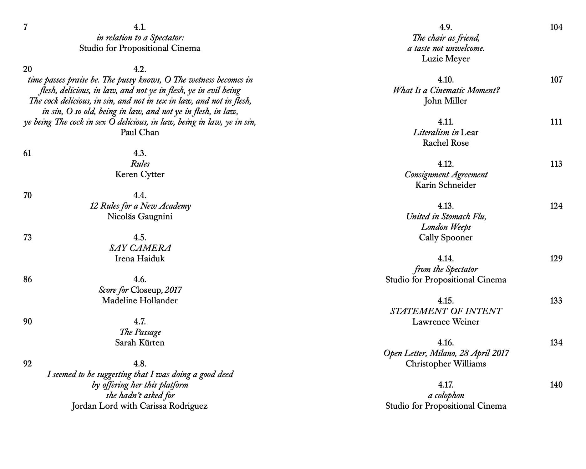 A compendium of essays, scripts, poems, and proposals by various artists, in relation to a Spectator: was compiled by Studio for Propositional Cinema for their eponymous exhibition at the Kestner Gesellschaft in Hannover. In the opening text, Studio for Propositional Cinema—an artist collective founded in Düsseldorf in 2013—sets the context for the book’s investigations into notions of the script, staging, and the conditions of the exhibition itself. Other contributions include Keren Cytter’s rules and declarations for engaging life; Irena Haiduk and John Miller’s ruminations on the nature of the image and of the cinematic, respectively; a series of missives to Kevin Spacey from Cally Spooner; and an “open letter” by Christopher Williams detailing the labor and material conditions that have furnished the walls on which his exhibitions have hung.