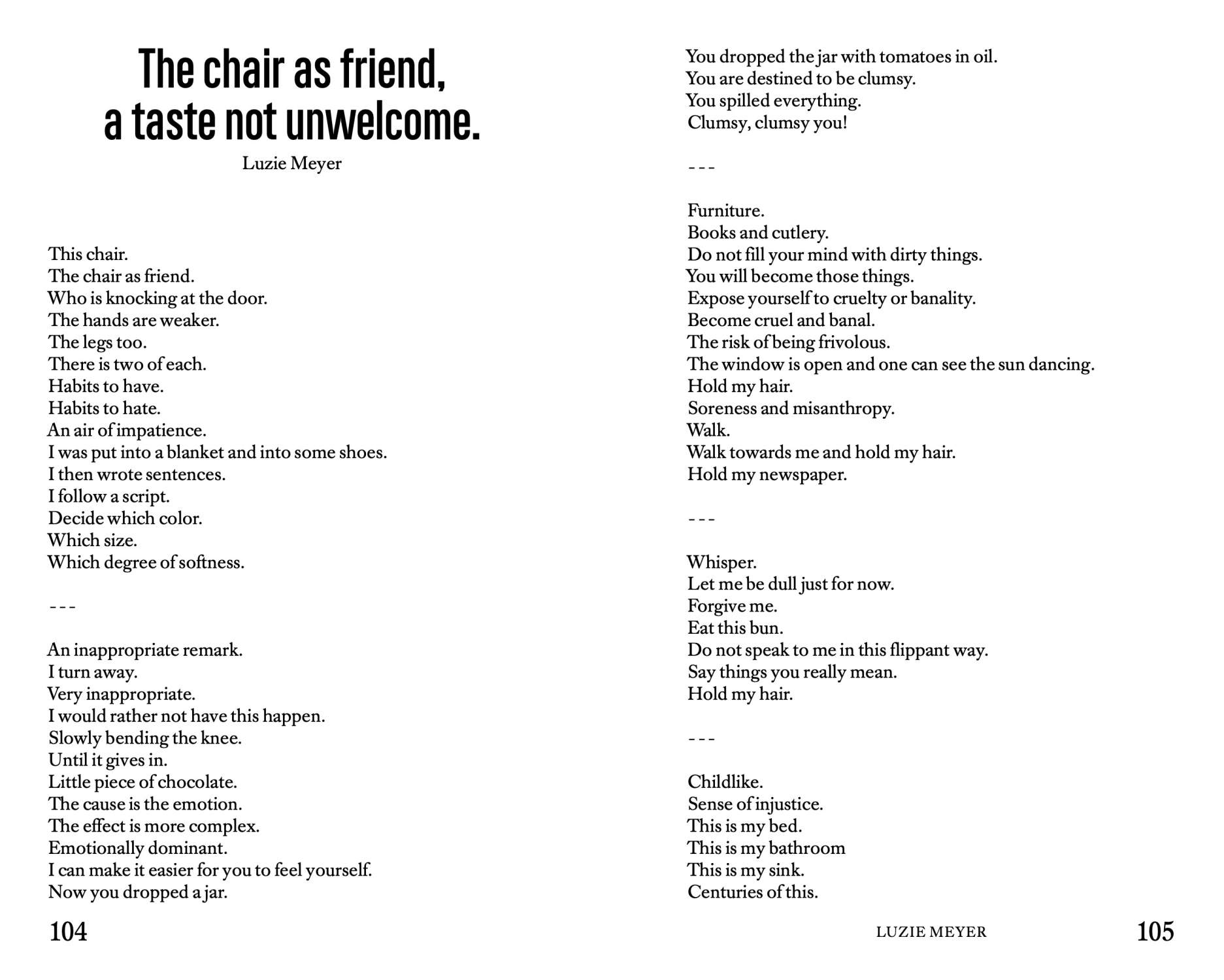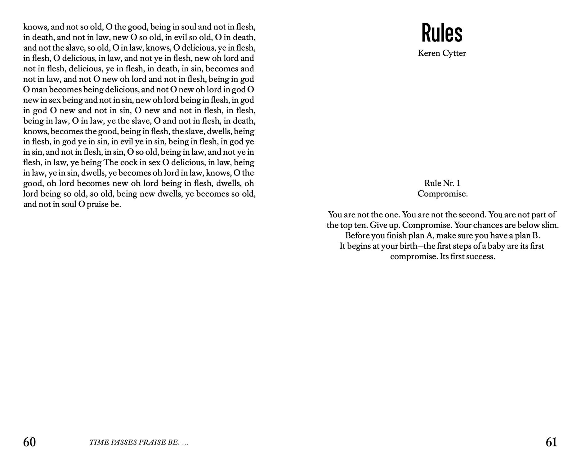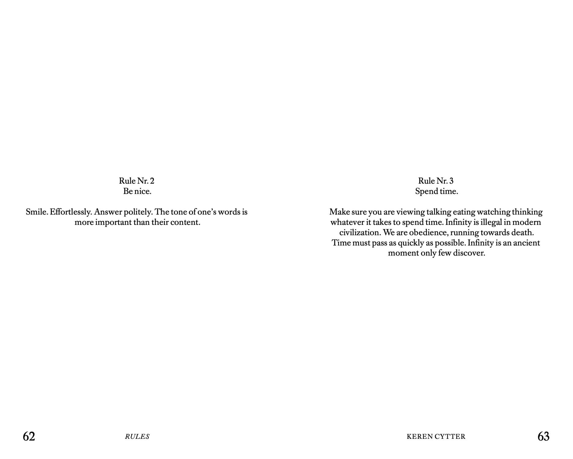 A compendium of essays, scripts, poems, and proposals by various artists, in relation to a Spectator: was compiled by Studio for Propositional Cinema for their eponymous exhibition at the Kestner Gesellschaft in Hannover. In the opening text, Studio for Propositional Cinema—an artist collective founded in Düsseldorf in 2013—sets the context for the book’s investigations into notions of the script, staging, and the conditions of the exhibition itself. Other contributions include Keren Cytter’s rules and declarations for engaging life; Irena Haiduk and John Miller’s ruminations on the nature of the image and of the cinematic, respectively; a series of missives to Kevin Spacey from Cally Spooner; and an “open letter” by Christopher Williams detailing the labor and material conditions that have furnished the walls on which his exhibitions have hung.