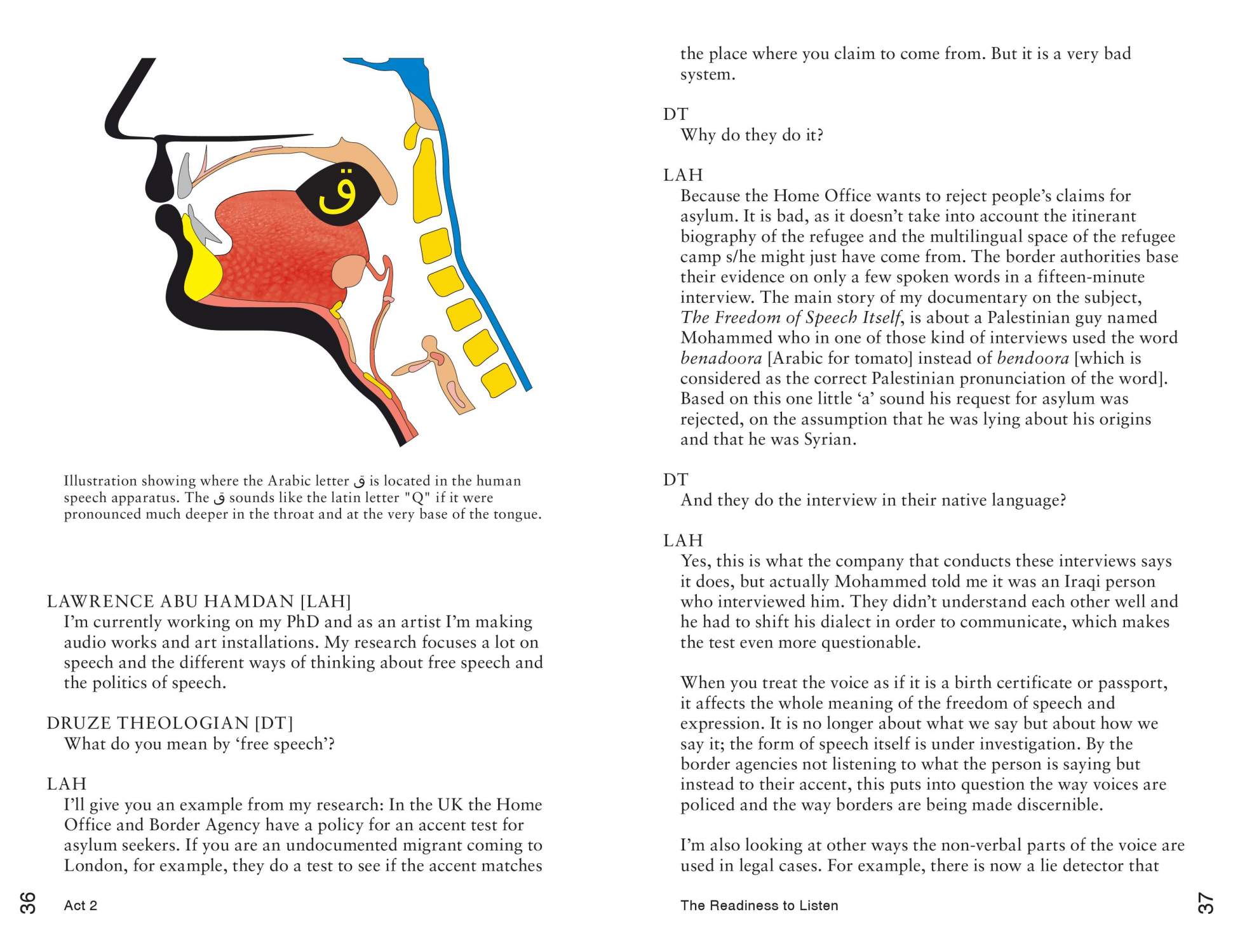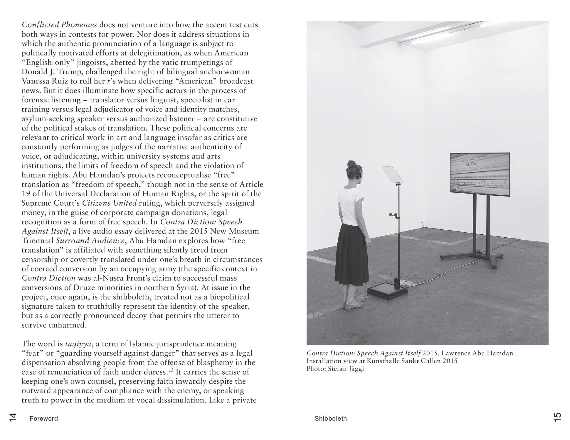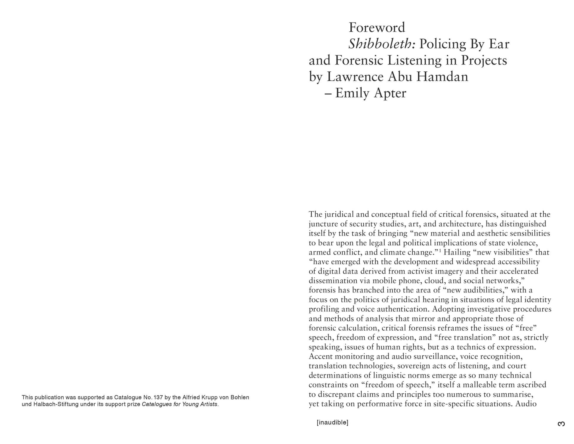 In his art and research, Beirut-based artist Lawrence Abu Hamdan explores the perception of language, sound, and listening. National identity, human rights, and the administration of justice are recurrent themes in his work. The techniques used in his audio-aesthetic practice have been used to conduct forensic audio analysis for several legal investigations. This monograph includes a series of transcripts of live speech from sermons, monologues, testimonies, and interviews made over the course of the last five years.