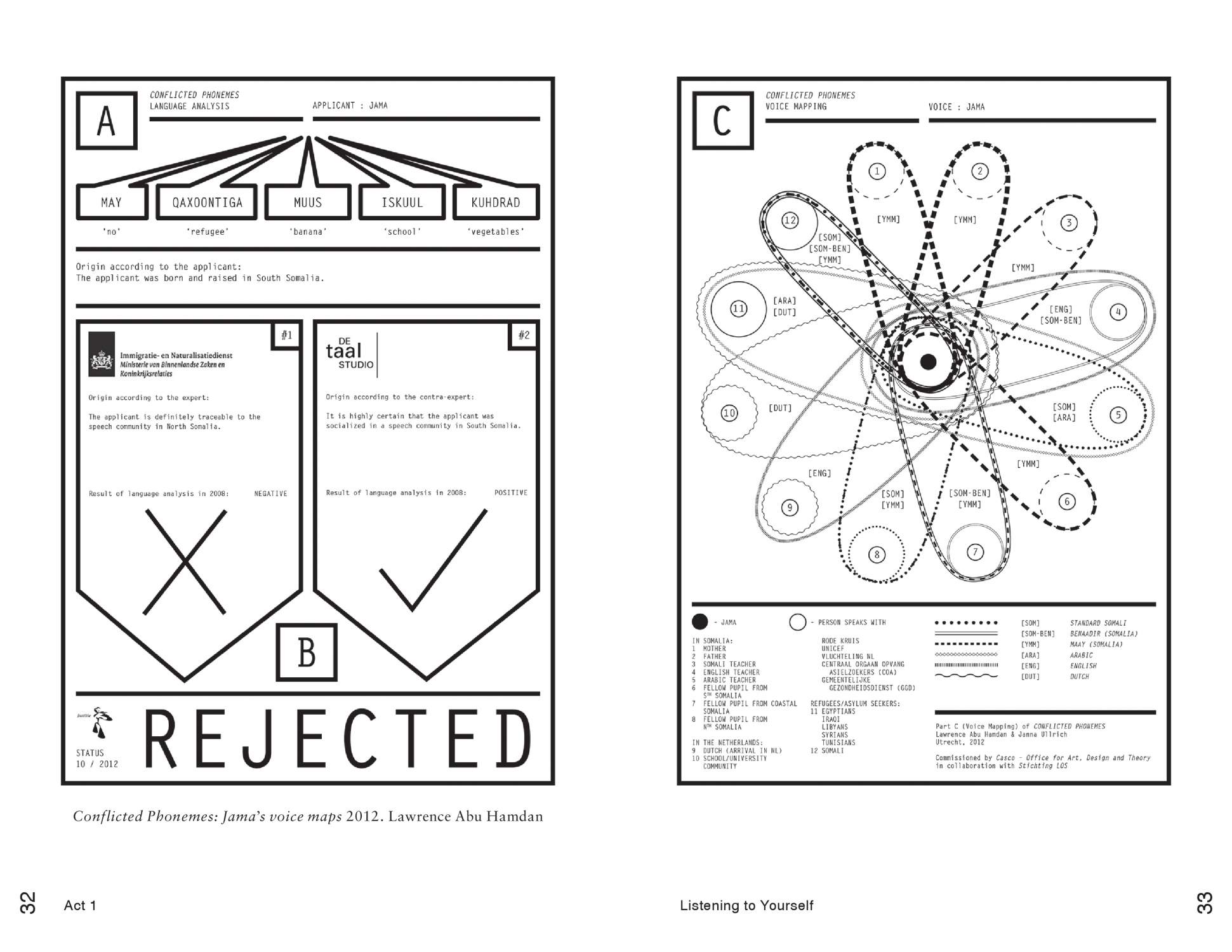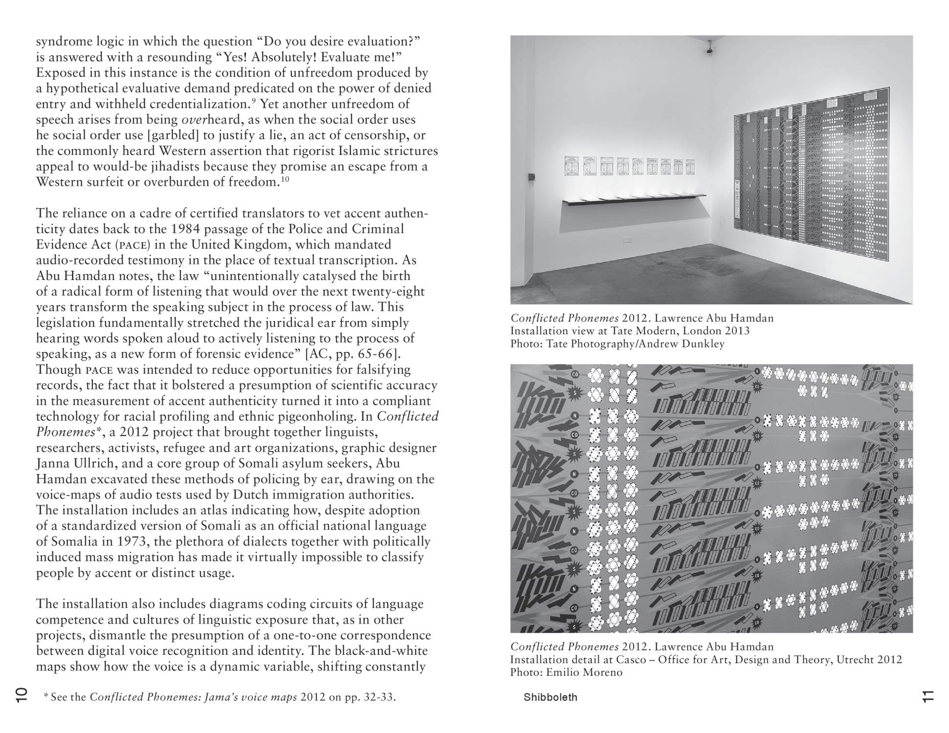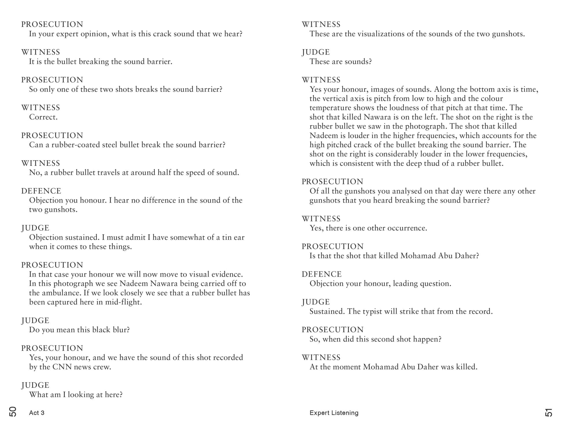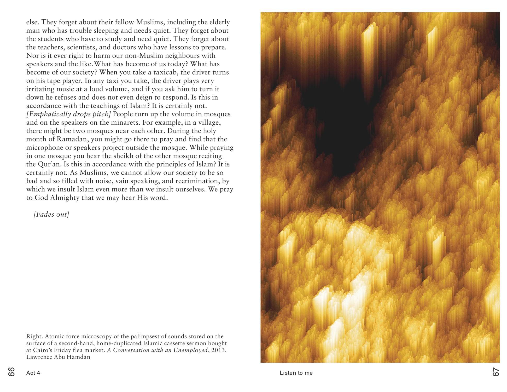 In his art and research, Beirut-based artist Lawrence Abu Hamdan explores the perception of language, sound, and listening. National identity, human rights, and the administration of justice are recurrent themes in his work. The techniques used in his audio-aesthetic practice have been used to conduct forensic audio analysis for several legal investigations. This monograph includes a series of transcripts of live speech from sermons, monologues, testimonies, and interviews made over the course of the last five years.