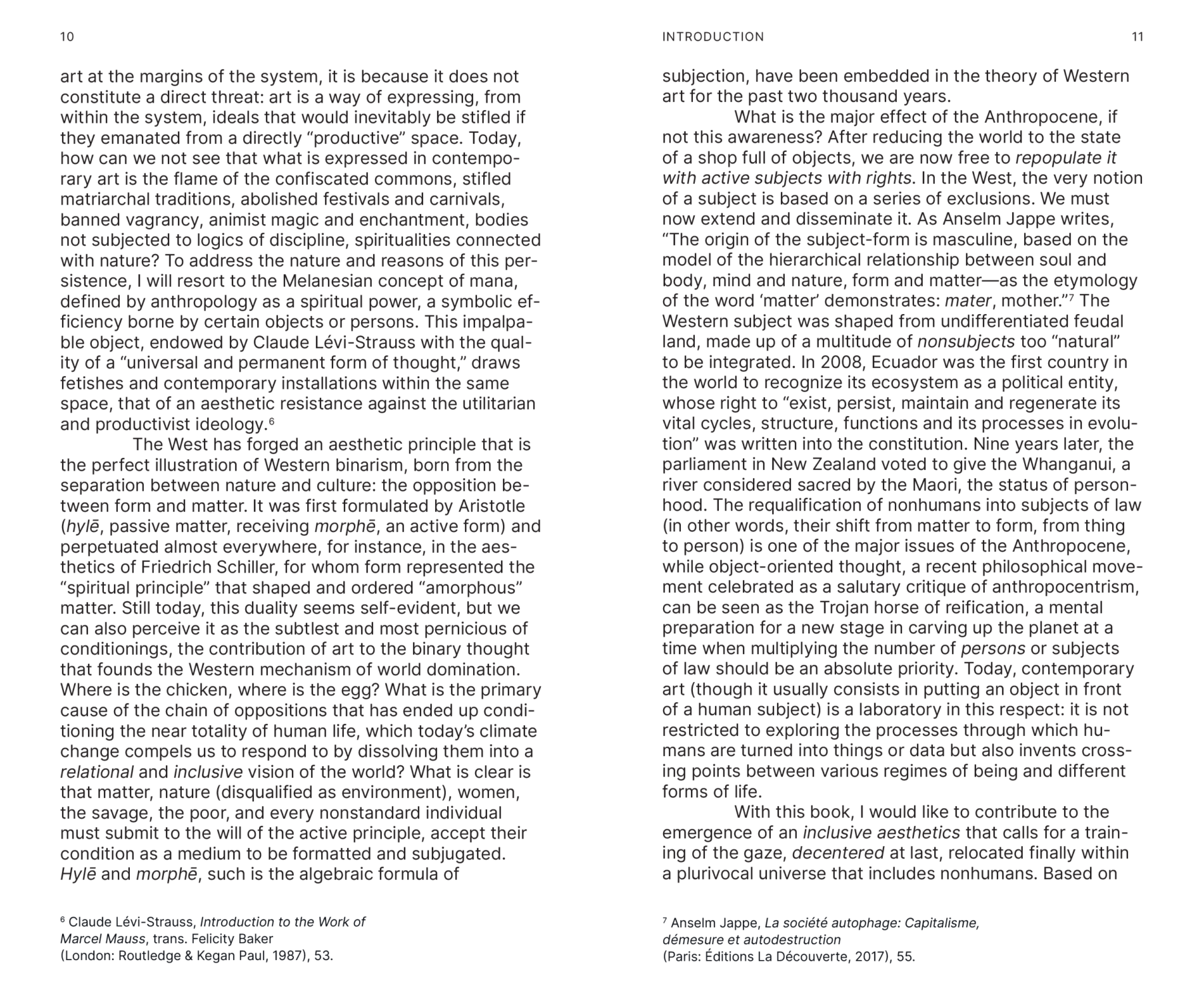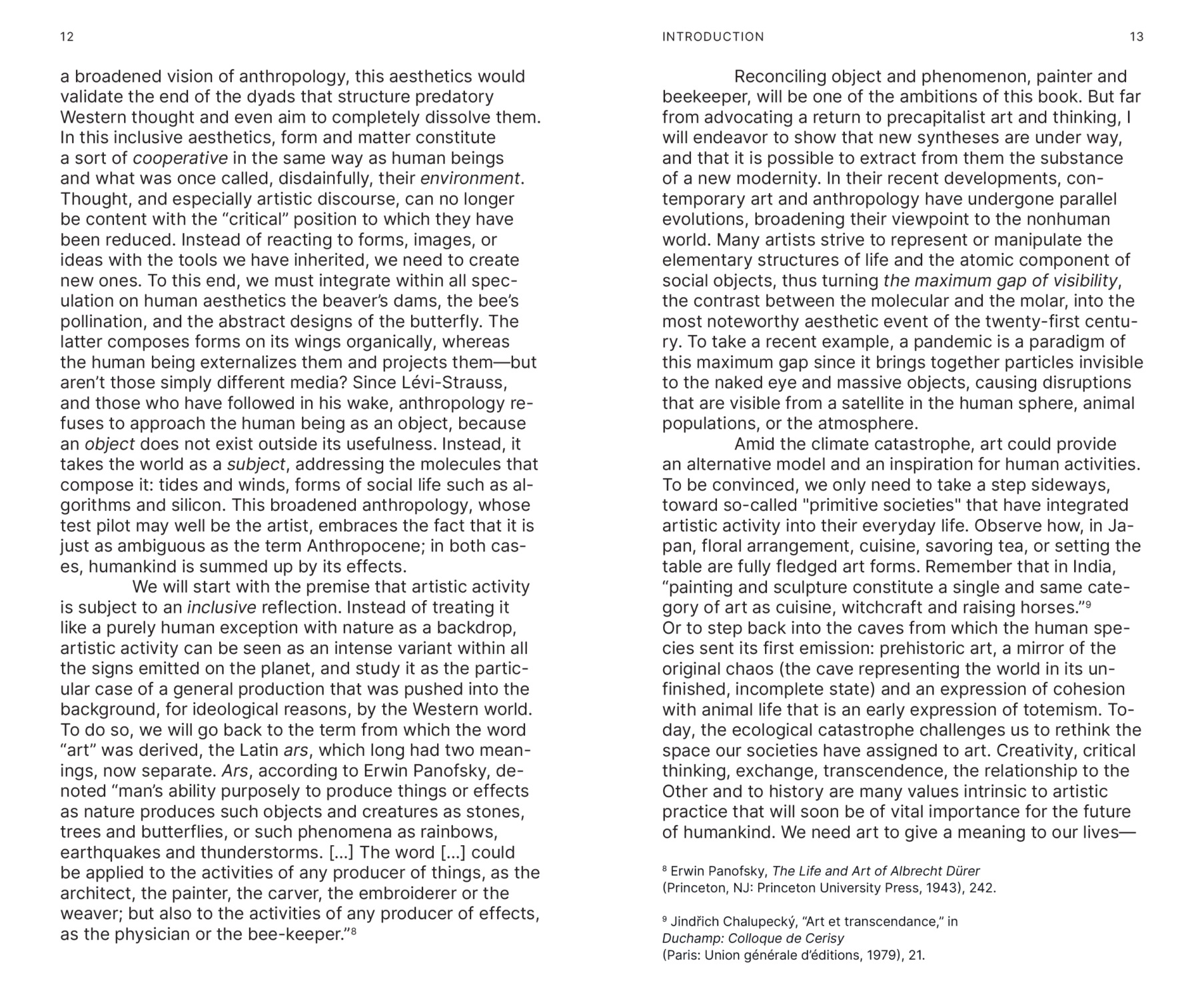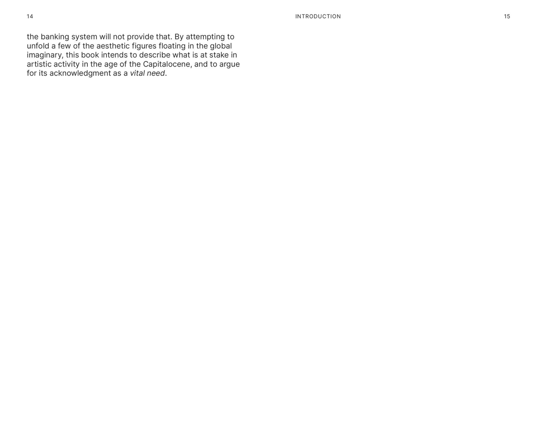 “Today, the ecological catastrophe challenges us to rethink the space our societies have assigned to art. Creativity, critical thinking, exchange, transcendence, the relationship to the Other and to History are values intrinsic to artistic practice that will soon be of vital importance for the future of mankind. We need art to give a meaning to our lives, and the banks will not supply that. By attempting to unfold a few of the aesthetic figures floating in the global imaginary, this book intends to describe what is at stake in artistic activity in the age of the Capitalocene and to argue for it as a vital need.”