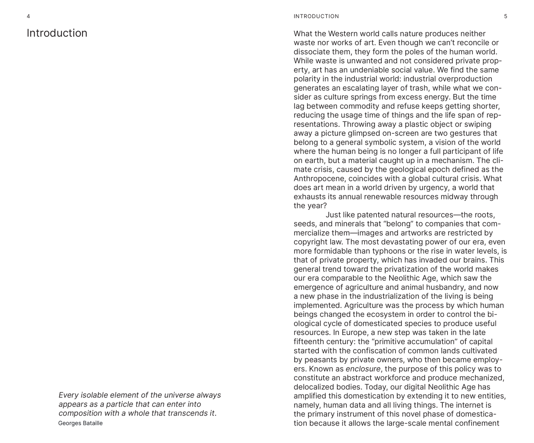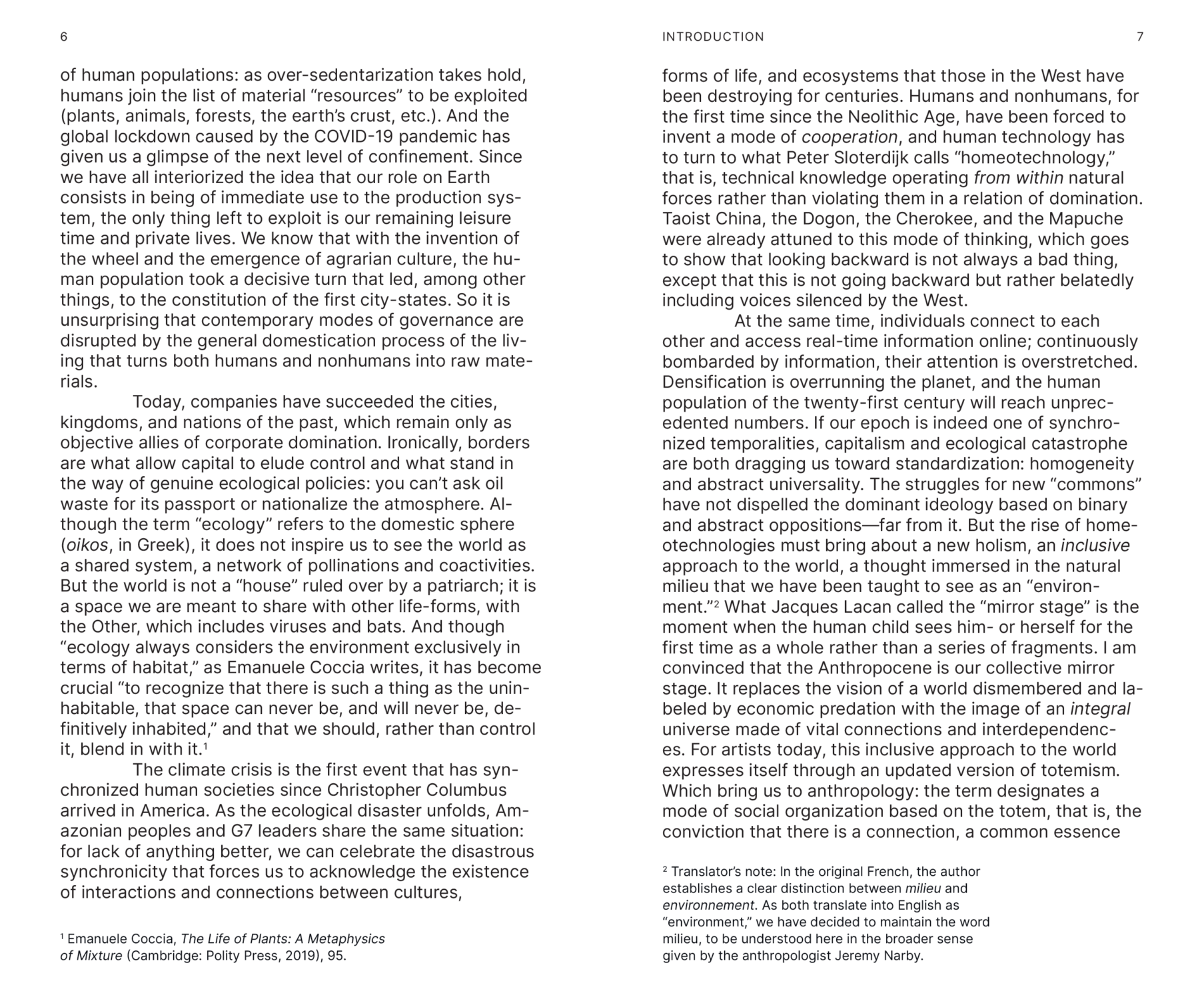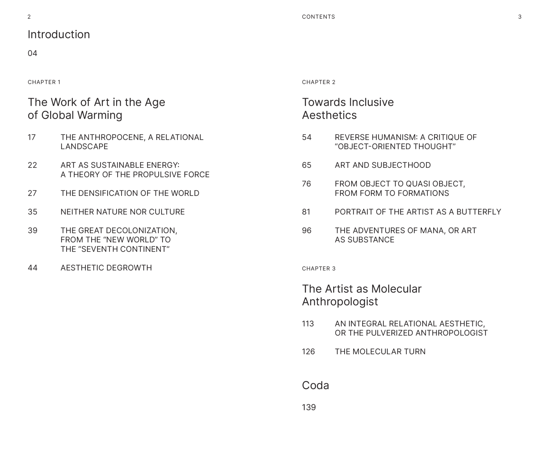 “Today, the ecological catastrophe challenges us to rethink the space our societies have assigned to art. Creativity, critical thinking, exchange, transcendence, the relationship to the Other and to History are values intrinsic to artistic practice that will soon be of vital importance for the future of mankind. We need art to give a meaning to our lives, and the banks will not supply that. By attempting to unfold a few of the aesthetic figures floating in the global imaginary, this book intends to describe what is at stake in artistic activity in the age of the Capitalocene and to argue for it as a vital need.”