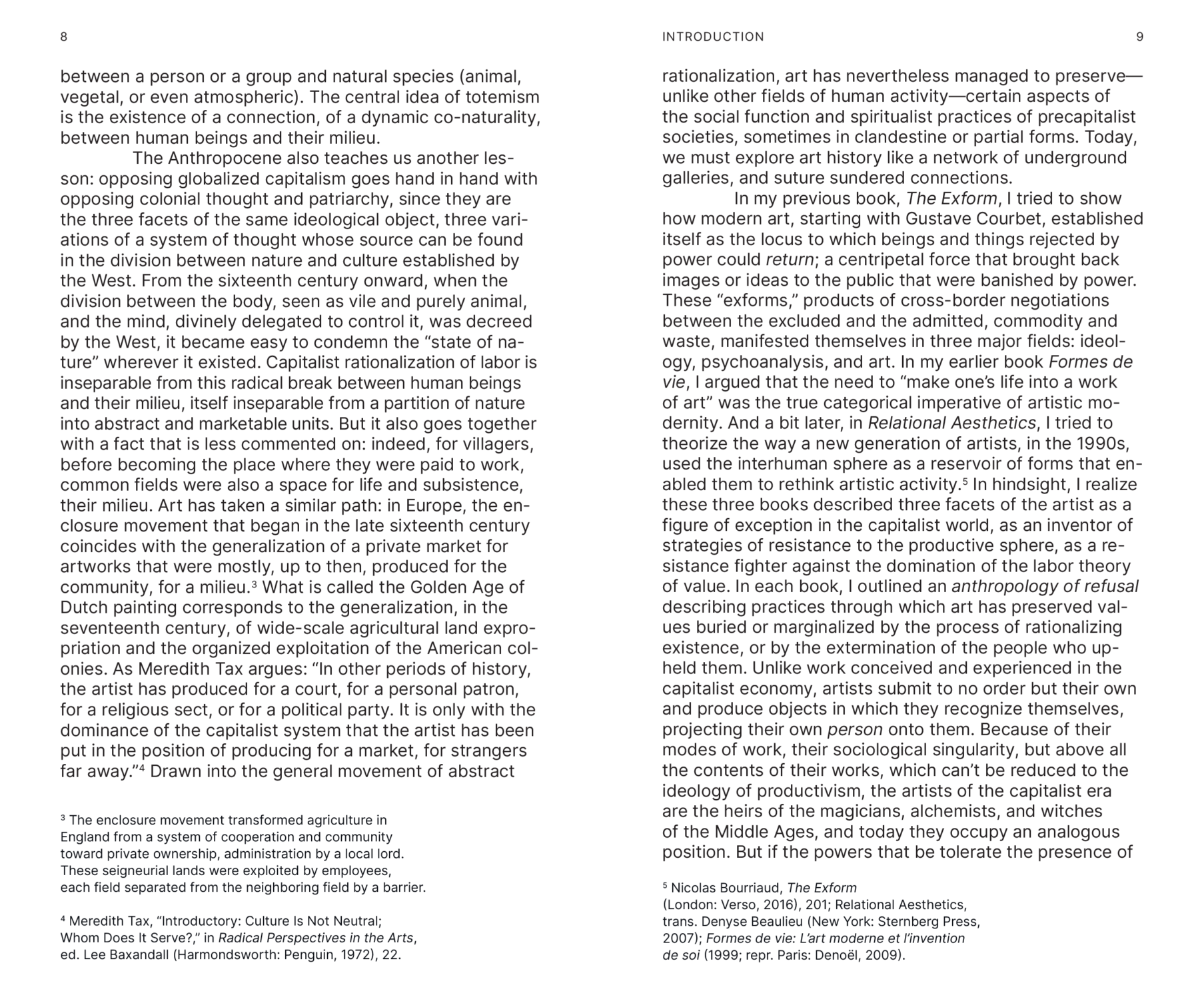 The current ecological crisis brings about a new relational landscape: an unprecedented collapse of distances creates interspecies promiscuities and a crisis of the human scale. In his latest book, Inclusions, Nicolas Bourriaud proposes that artists are the anthropologists of this new era. Artists acknowledge the fading of the division between nature and culture, which has been the matrix of segregation for millenia. Capitalism, patriarchy, slavery, social segregation, the exploitation of land, subsoil, and animals—all are based on status distinctions between subject and object. Against the commodification of natural elements, Bourriaud sees a new generation of artists calling for a molecular anthropology that studies the human effects on the universe and the interaction between humans and nonhumans. Contemporary art reconnects to archaic magic, the witches, sorcerers, and shamans of precapitalist societies. Against the devitalization of the world, art has managed to preserve certain aspects of the social function and spiritualist practices of these societies. Inclusions explores art history as a network of underground galleries, and sutures sundered connections.