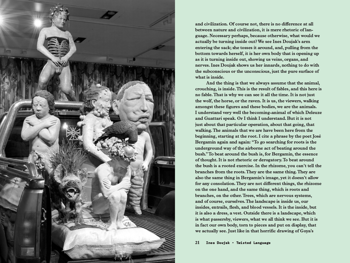 These subjects have always been present in Doujak’s works. Therefore, it felt crucial to have a book that allows several writers, theoreticians, and poets from different geographies to reflect on the political and aesthetic strategies that Doujak has been using during these past thirty years. The book is not a monograph nor a catalogue but rather a mosaic of texts in dialogue with Ines Doujak’s Oeuvre, which engage with burning and urgent topics such as how we relate to the world around us and to each other.