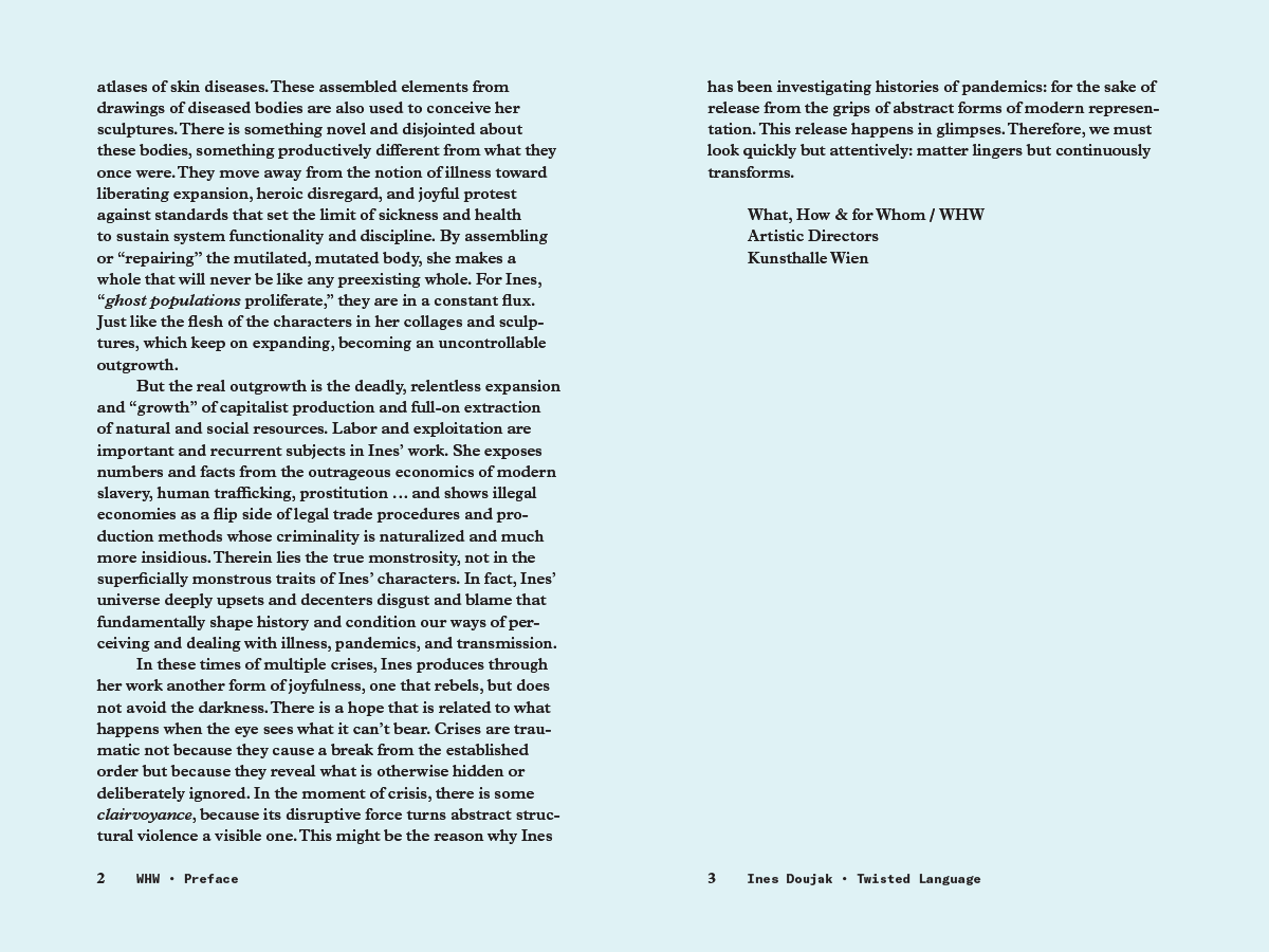In the context of Ines Doujak’s exhibition Geistervölker, Kunsthalle Wien and Sternberg Press publish a book that looks deeply into the artist’s practice. In the exhibition, curated by What, How & for Whom / WHW, the artist traced, in fragments, the origins of pandemics throughout history and linked them to a global economy that is based on logics of extraction facilitated by colonial legal mechanisms and late capitalism.