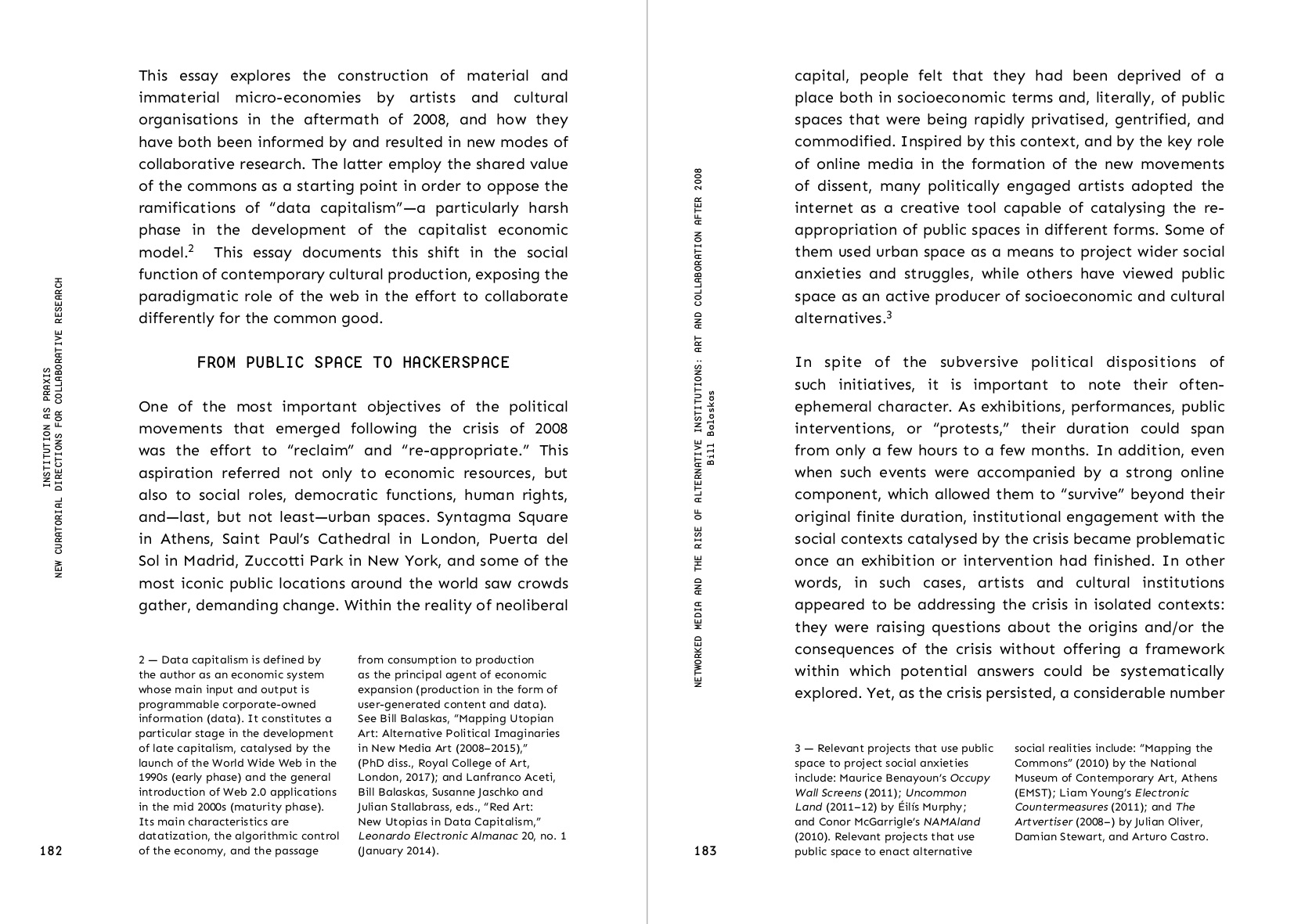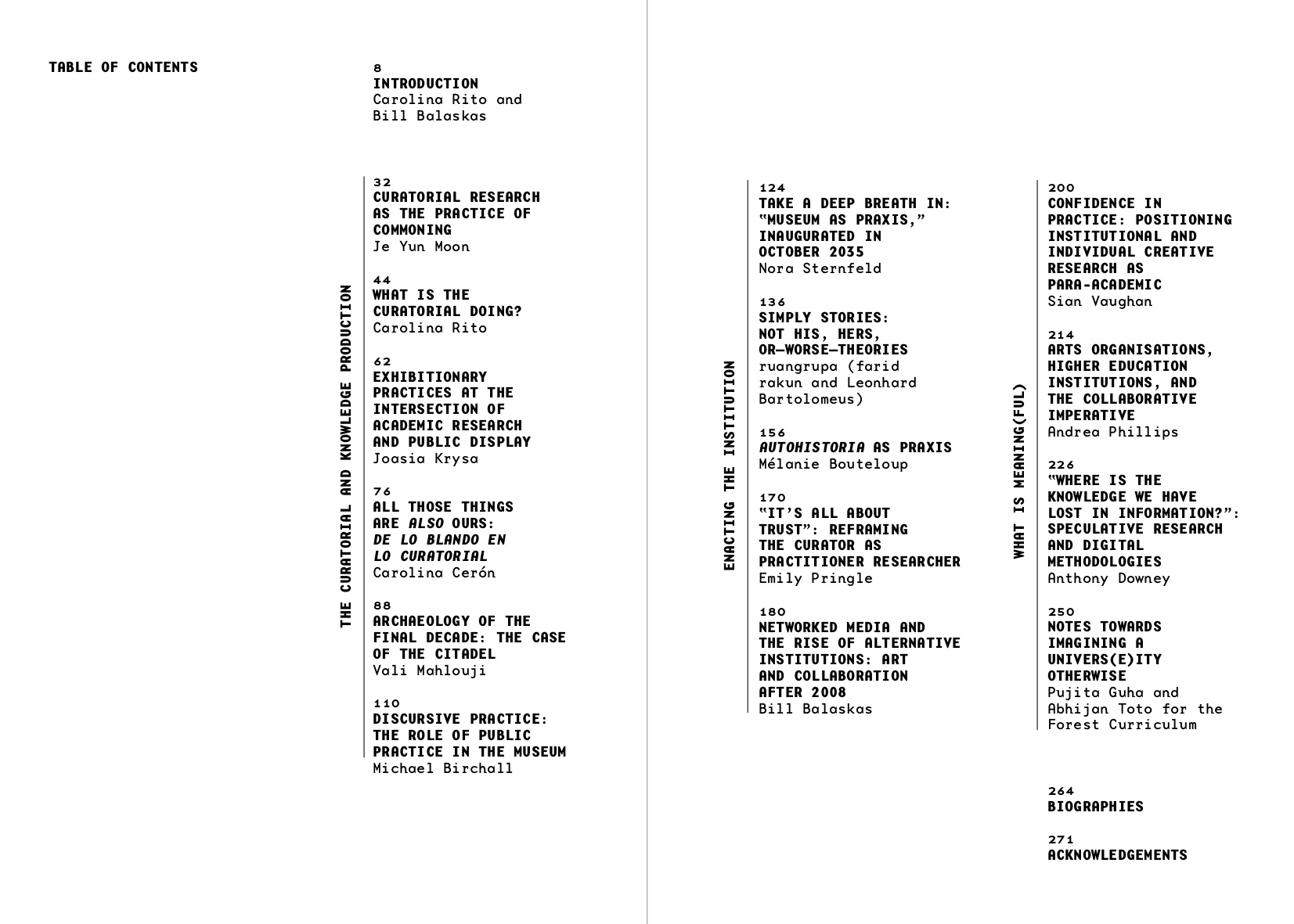 How are curatorial and artistic practices advancing new research methods? Institution as Praxis—New Curatorial Directions for Collaborative Research explores new curatorial and artistic practices that contribute to the expansion of institutional, practice-based, and collaborative research methods. This publication offers an overview of how creative practices are modifying the ways we think about both knowledge production and research in the cultural sector and in academia. This exploration enquires the invention of manifold research methodologies and contributes to think of strategies to de-universalize and de-neutralize the rigid epistemic schemata of inherited disciplines. Designed as a platform of aesthetic and intellectual exchange, the speculative interface of cultural practices has radically changed the way we consider how research qualities in curatorial and artistic practices have developed. Institution as Praxis aims to identify and advocate for a multiplicity of practices taking place across the cultural sector that do not only engage with the quest to deliver cultural activities (e.g. exhibitions, events), but generate new modes of knowledge production and research in the field of visual culture, art, and the curatorial.