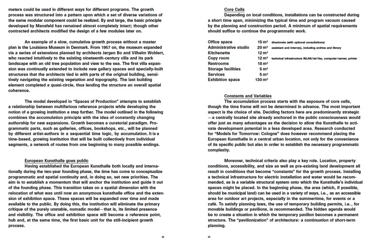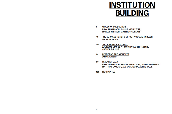 Nikolaus Hirsch, Philipp Misselwitz, Markus Miessen, and Matthias Görlich have developed three spatial strategies: an unstable configuration, a stable strategy as well as a model that consolidates the potentials of both variants towards a, albeit slowly, growing institution. The proposal acts as a laboratory that plans a collective structure consisting of individual components. It results in a network of possible spatial options stemming from programmatic modules and leads to numerous possible spatial configurations. This alternative institution is a showcase of a growing phenomenon problematizing the relationship between authorship and institution. As time spans of exhibitions become shorter and programs become more differentiated, architecture in itself becomes exhibition—renegotiating the default role models of artists and architects.