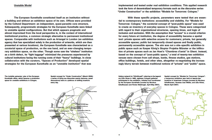 This book presents a study that conceptualizes, tests, and practically applies the spatial strategy for the European Kunsthalle. The investigation is the result of the activities incorporated into a two-year work practice from 2005 to 2007, an iterative “applied research” informed by resonances between theory and practice.