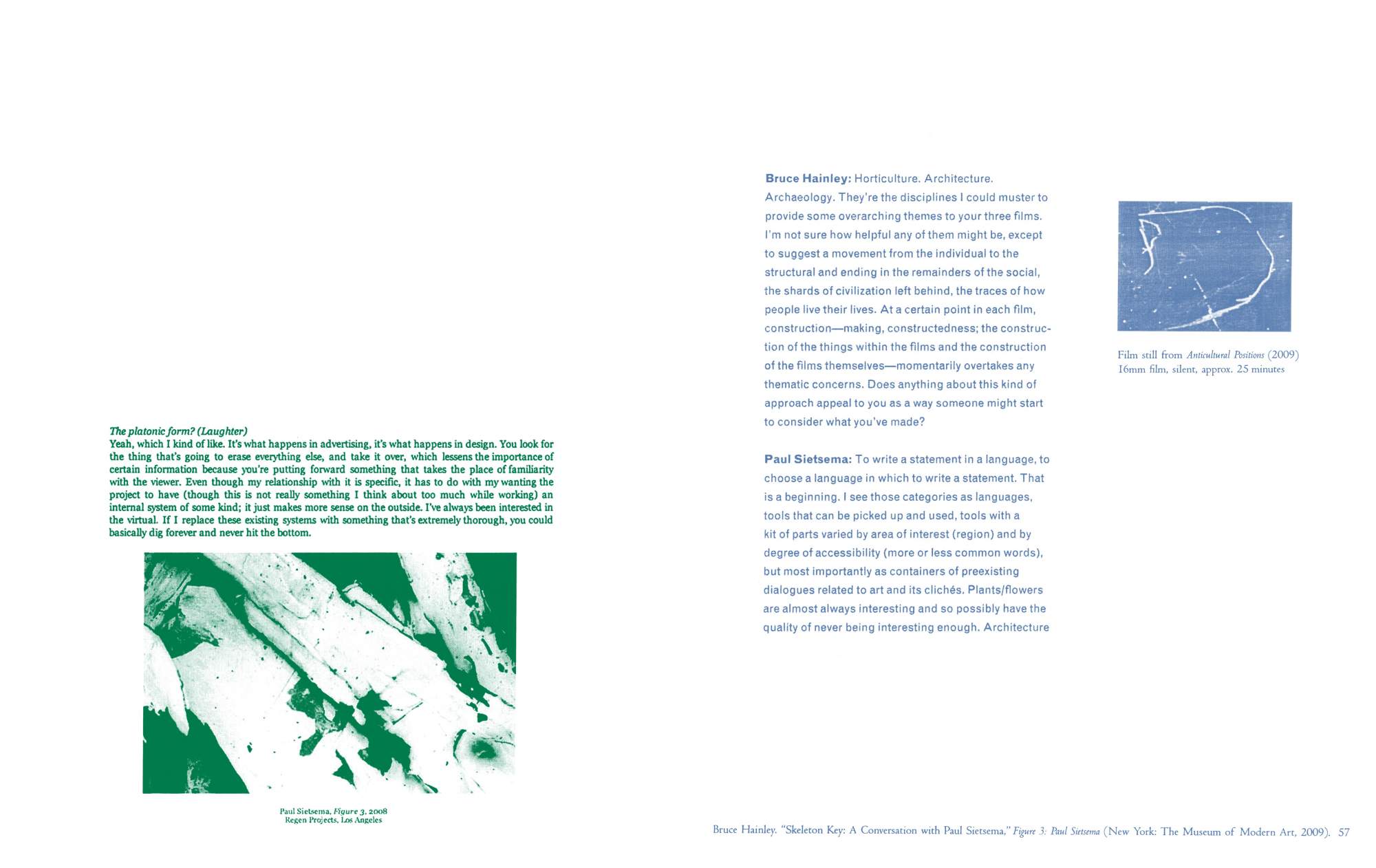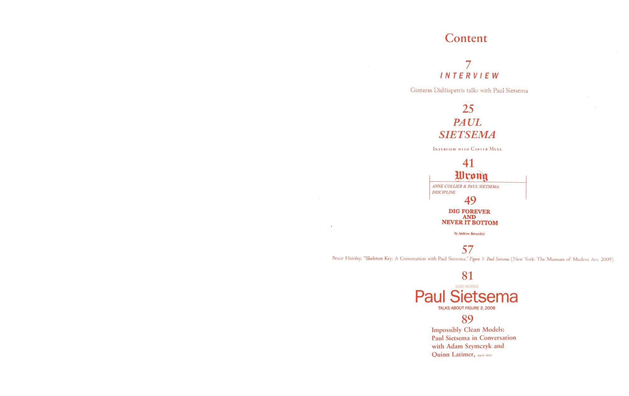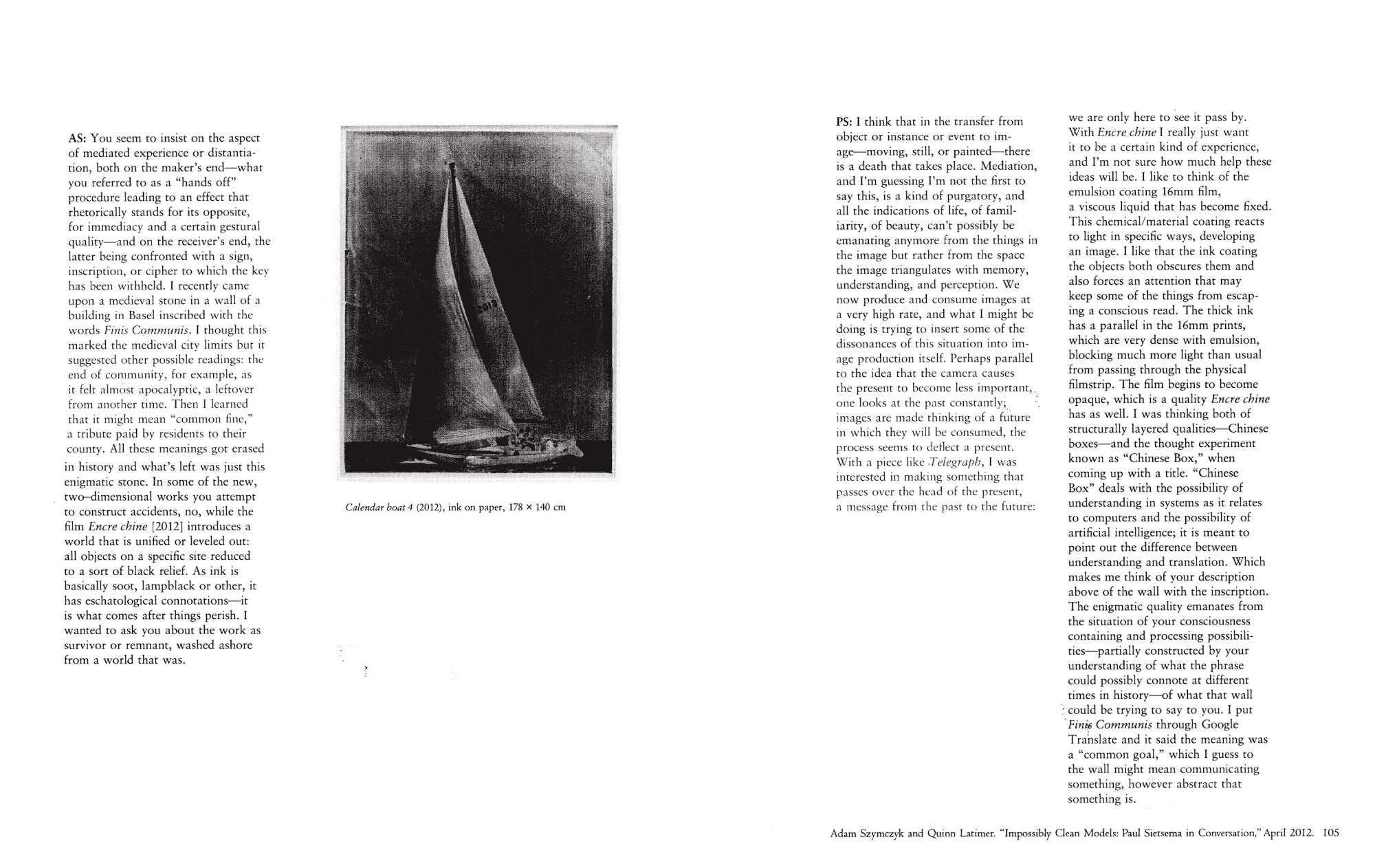 Published on the occasion of his solo exhibition at Kunsthalle Basel (June–August 2012), this publication includes interviews and images of the work of the Los Angeles-based artist Paul Sietsema. The residual aesthetics of Sietsema's art practice result from the translation of visual information between mediums—for instance, his sculptures and paintings appear on film rather than in their original media. Through the accumulation of conversations with the artist spanning from 2006 to 2012—primarily reproductions of earlier material with the addition of a new interview by Adam Szymczyk, director of Kunsthalle Basel, and Quinn Latimer, an art critic and the book’s editor—the discursive texts in Interviews on Films and Works obliquely encompass the issues central to the artist’s work, including the perception of present time and the relationship of materials to form. Also featured in the publication are stills from newly produced films, Telegraph (2012) and Encre Chine (2012), as well as reproductions of paintings and works on paper developed from the recurring visual motif of a photograph of a sailboat—continuing Sietsema’s ongoing investigation into the mechanics of knowledge and history within image culture.