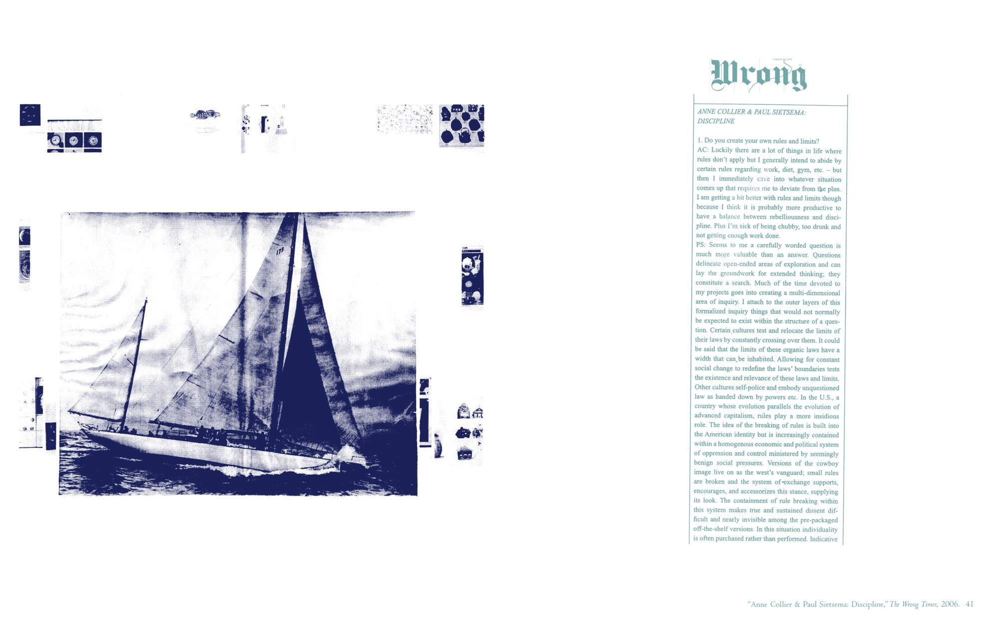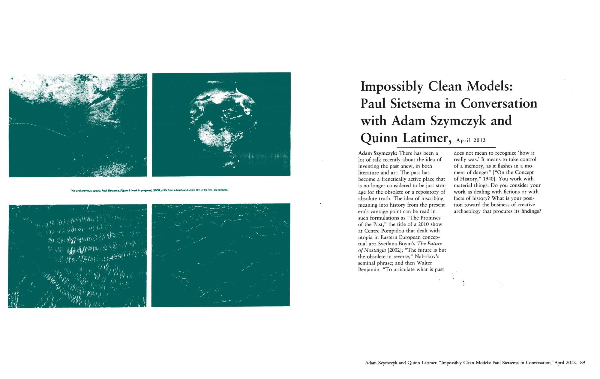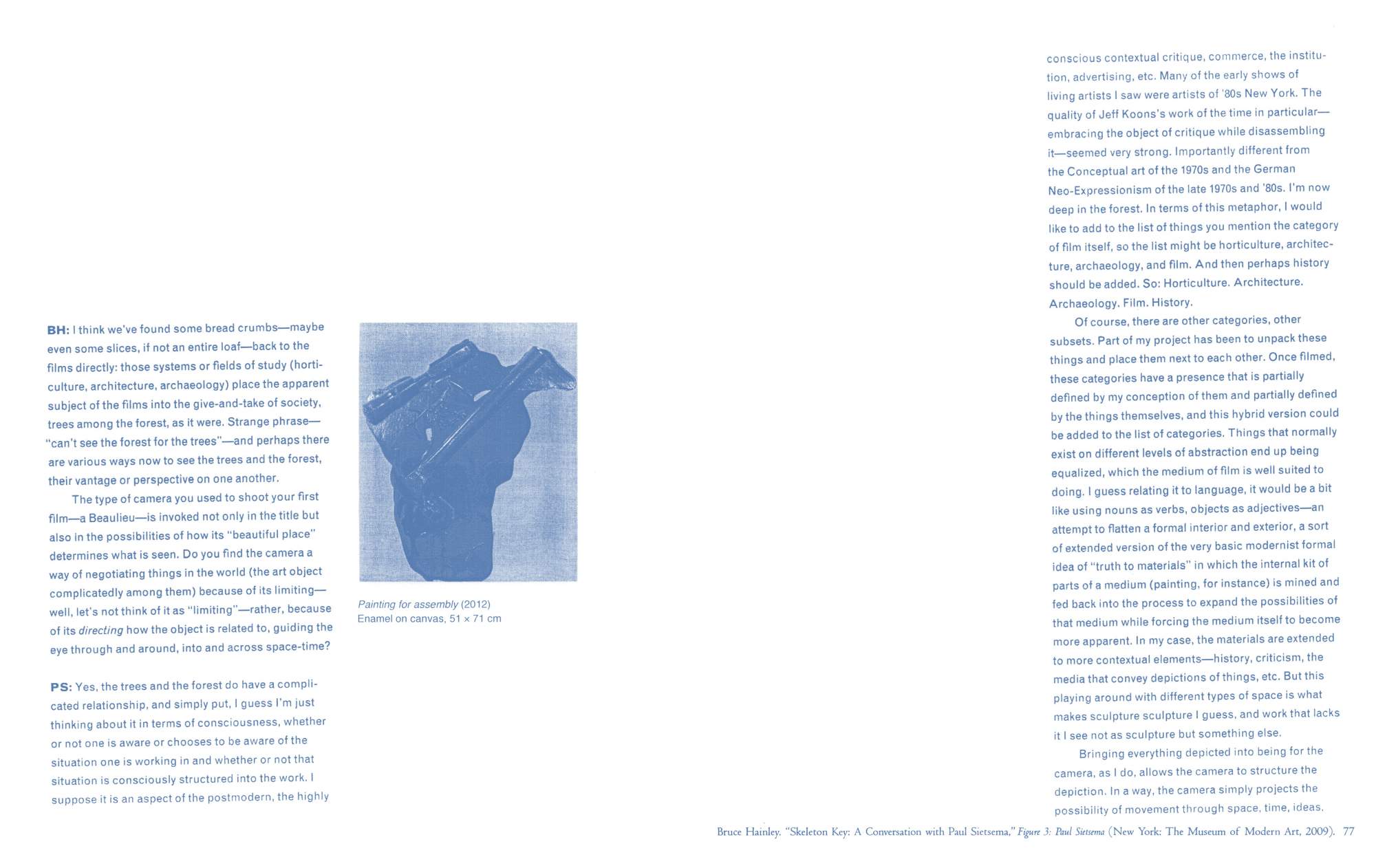 Published on the occasion of his solo exhibition at Kunsthalle Basel (June–August 2012), this publication includes interviews and images of the work of the Los Angeles-based artist Paul Sietsema. The residual aesthetics of Sietsema's art practice result from the translation of visual information between mediums—for instance, his sculptures and paintings appear on film rather than in their original media. Through the accumulation of conversations with the artist spanning from 2006 to 2012—primarily reproductions of earlier material with the addition of a new interview by Adam Szymczyk, director of Kunsthalle Basel, and Quinn Latimer, an art critic and the book’s editor—the discursive texts in Interviews on Films and Works obliquely encompass the issues central to the artist’s work, including the perception of present time and the relationship of materials to form. Also featured in the publication are stills from newly produced films, Telegraph (2012) and Encre Chine (2012), as well as reproductions of paintings and works on paper developed from the recurring visual motif of a photograph of a sailboat—continuing Sietsema’s ongoing investigation into the mechanics of knowledge and history within image culture.