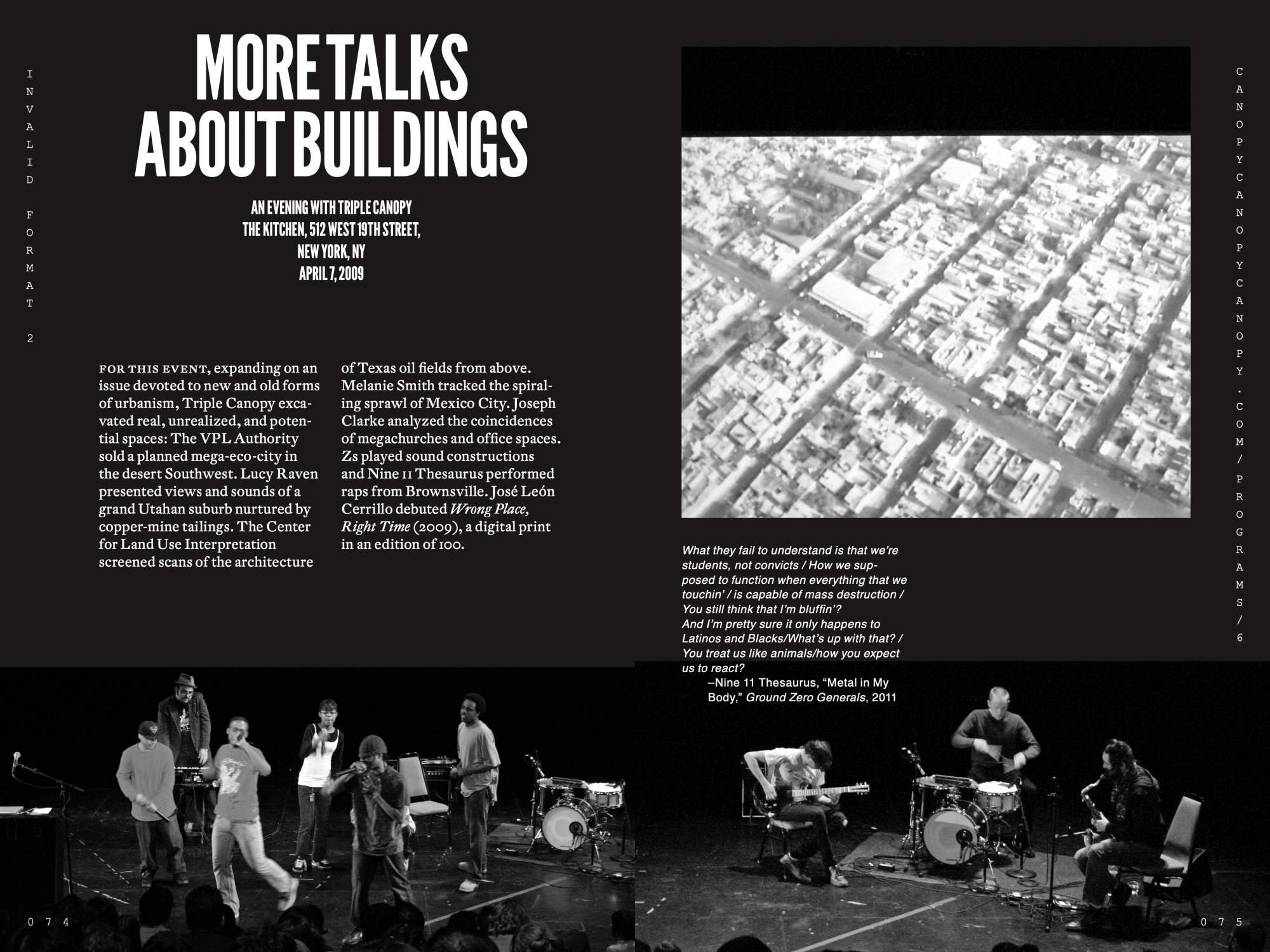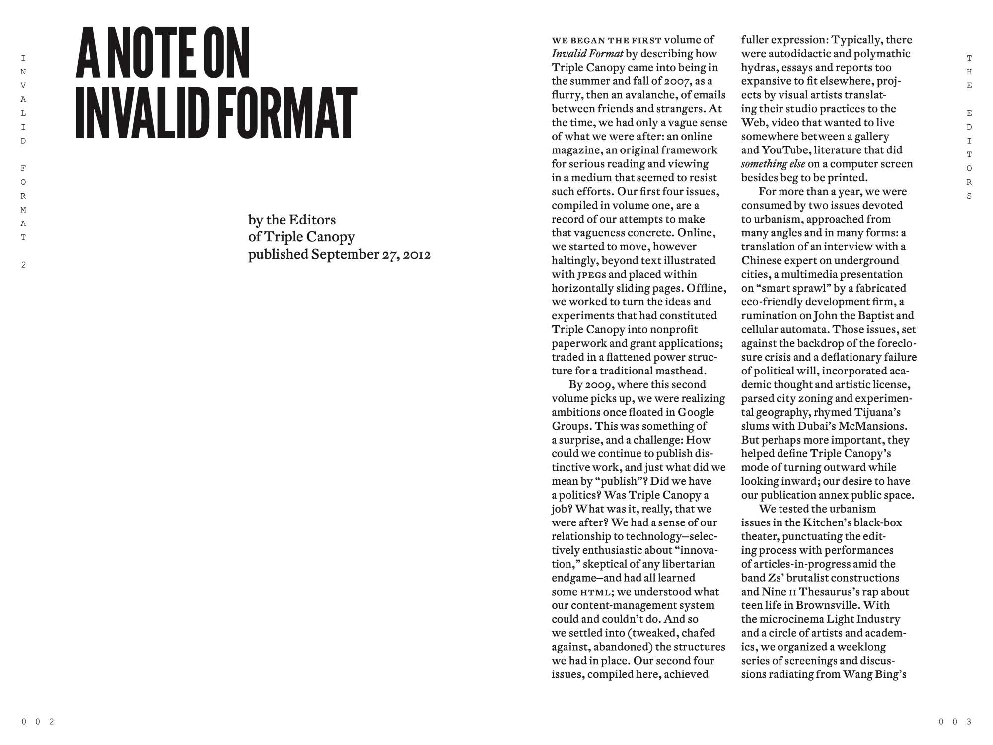 Invalid Format is an archive of the widespread publishing activities of Triple Canopy, the editorial collective and online magazine based in New York, Los Angeles, and Berlin. The book translates into print work that originally appeared in other forms. The second volume of Invalid Format includes artist projects and literary work published in the second year of Triple Canopy’s existence, documentation of public programs, and a sampling of foundational correspondence. In form and content, the book explores how works produced for the screen might be transposed to the codex in a way that recalls that former context while also fully inhabiting the page.