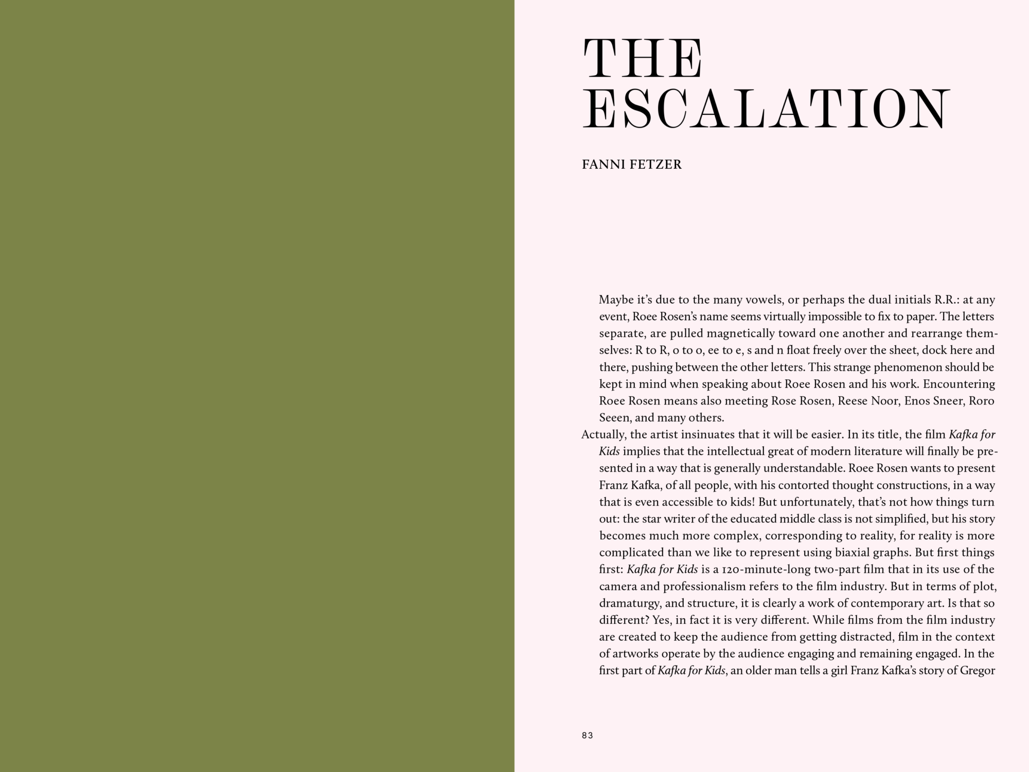 Featuring the original script of the movie, readers are invited to dive into a magical story, followed by essays that give a deeper insight in the literary aspects of Roee Rosen’s oeuvre. A stowaway on the journey, Rosen playfully and with wonderful self-irony, does not negate the complexity of the present, but takes it to the next level by exploring how all things are interlinked. Rosen neither doubts the complexity of our reality, nor does he oversimplify to a fault.
