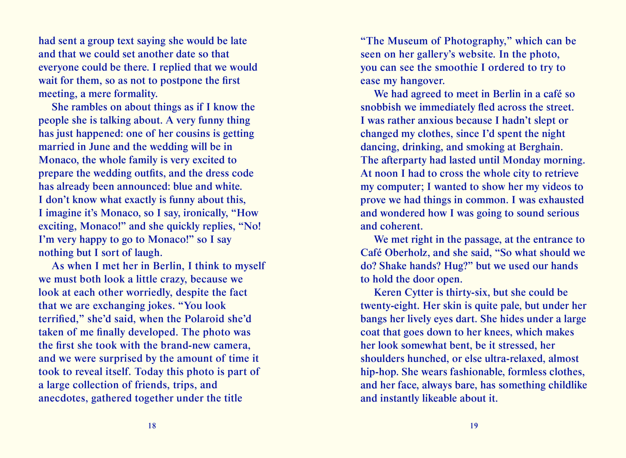 While studying at the Fine Arts School in Paris in 2013 and having to complete an internship abroad, Mathilde Supe, a 24-year-old student, contacted Keren Cytter to be her assistant. The latter, who had just left Berlin for New York, accepted the offer. Supe embarked on a journey to New York City, where she had never set foot, barely speaking English, without a work permit, and without contacts. From this incredible adventure, she transcribed every detail of hardship and learning in a book that took the form of a logbook and followed the evolution of one young artist’s view of another established artist.