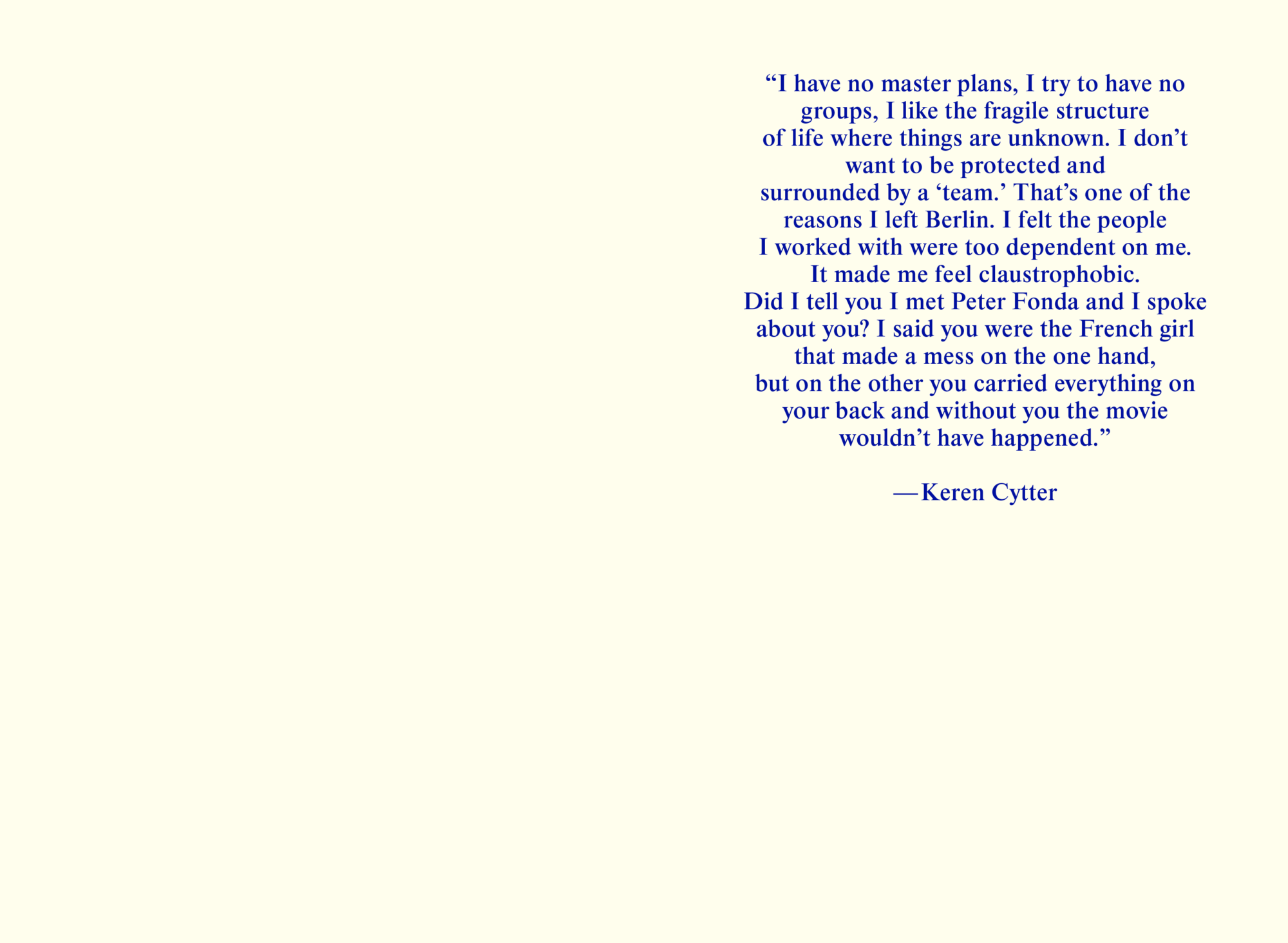 Through experimental modes of storytelling and perception, Keren Cytter's work deals with social alienation, the representation of language, and the function of individuals in cultural systems. She is primarily a filmmaker, yet her work includes performances, plays, sculptures, drawings, novels, zines, children's books, and interdisciplinary festivals.