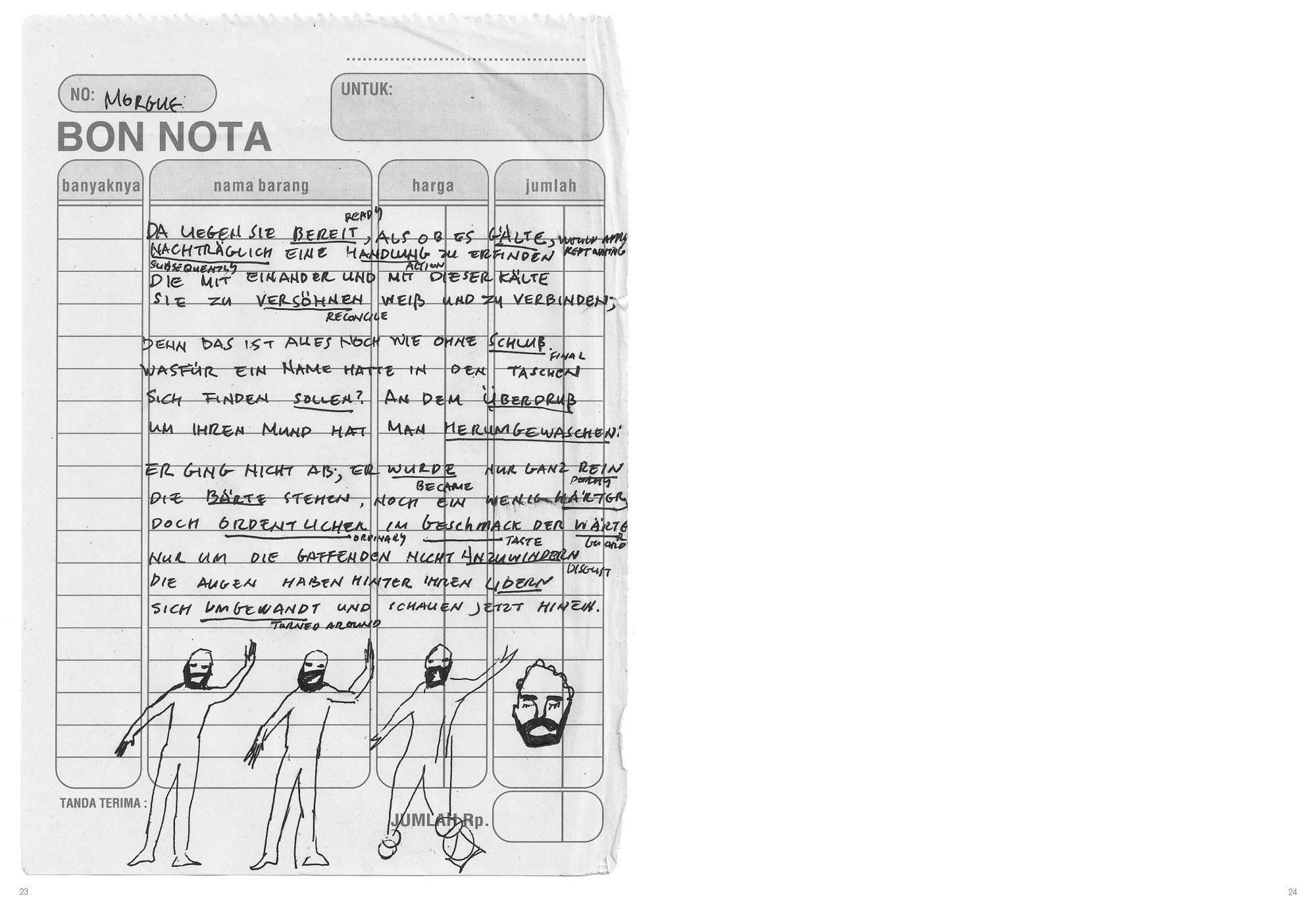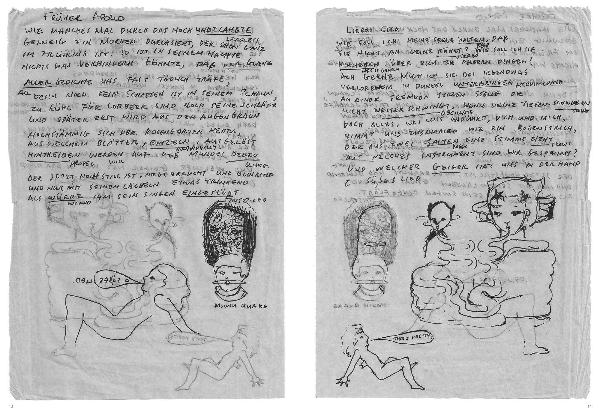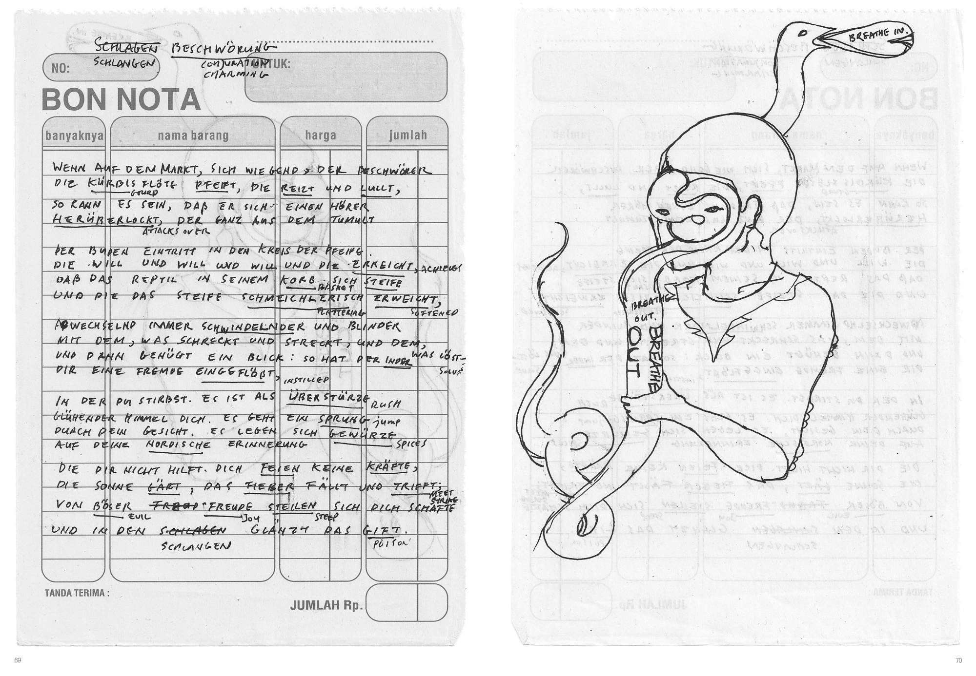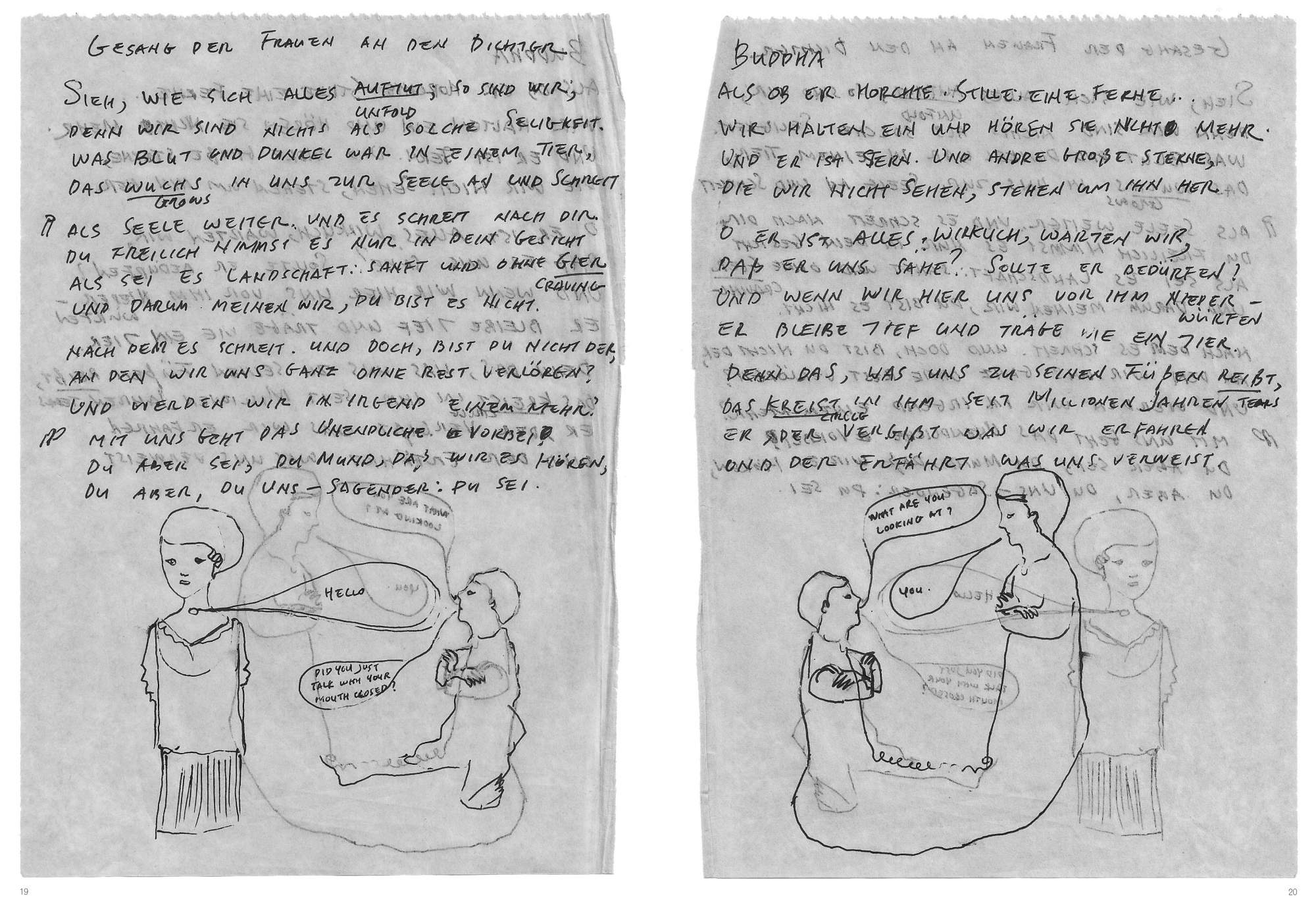 The artist’s book Ki-da Rilke evolved in relation to the exhibition “Line Wall” by Sung Hwan Kim. In the book, Kim engages with the work of the Prague born poet Rainer Maria Rilke (1875–1926). The first part of Ki-da Rilke features a transcription and drawings of Rilke’s collection “New Poems” (1907) in the German original and on thin sheets of paper and notepads. The second part features Kim’s drawings inspired by Rilke’s “Sonnets to Orpheus” (1923), which are then further developed in the book’s third part, which comprises an independent picture story featuring recurring characters. These figures are named in an index on loose sheets of paper.