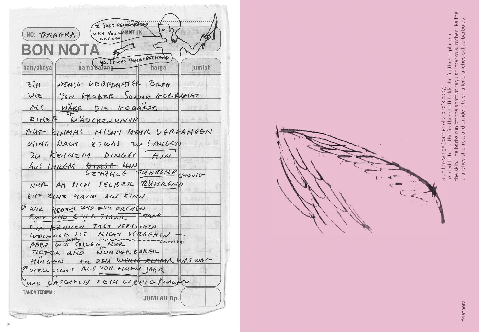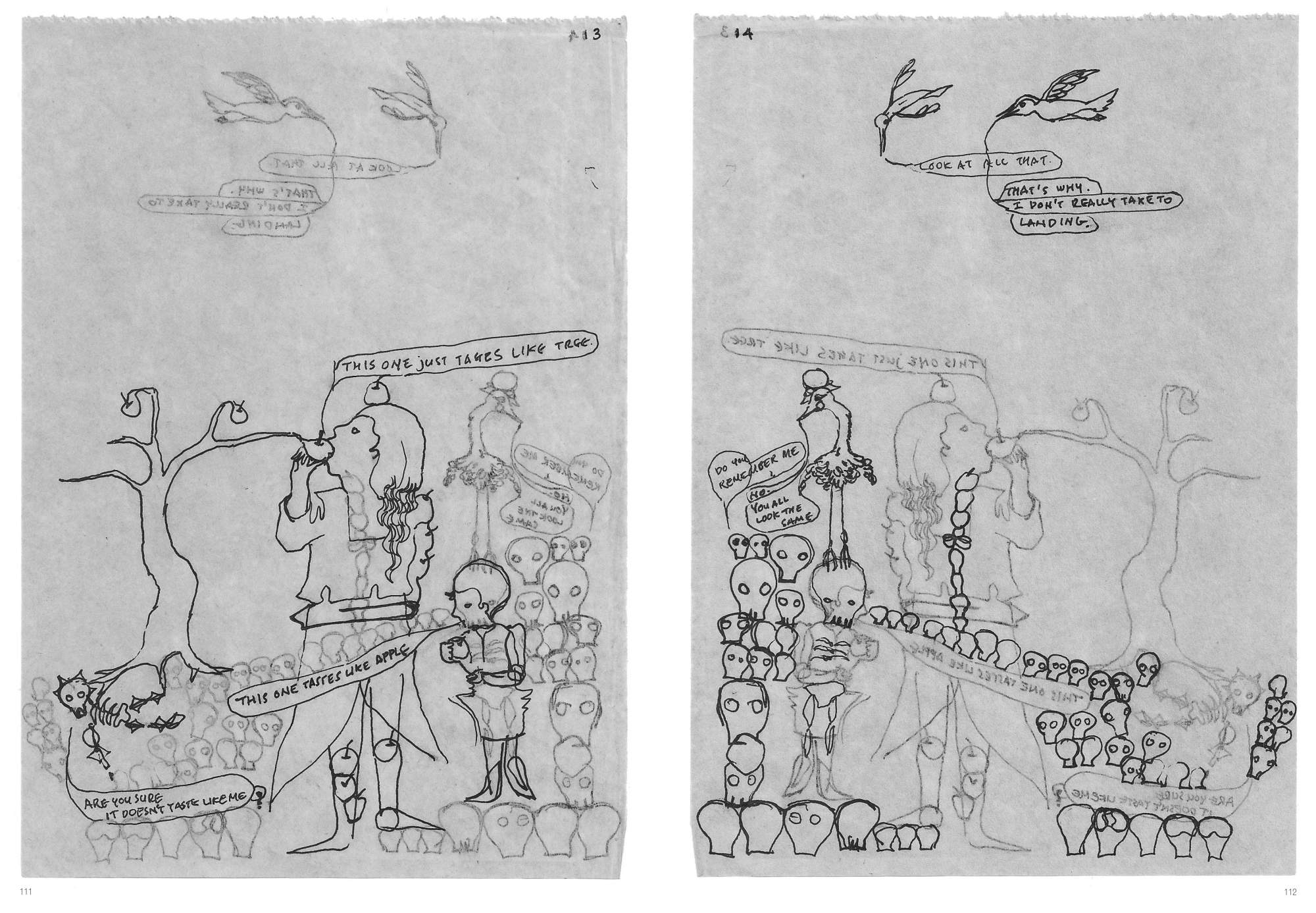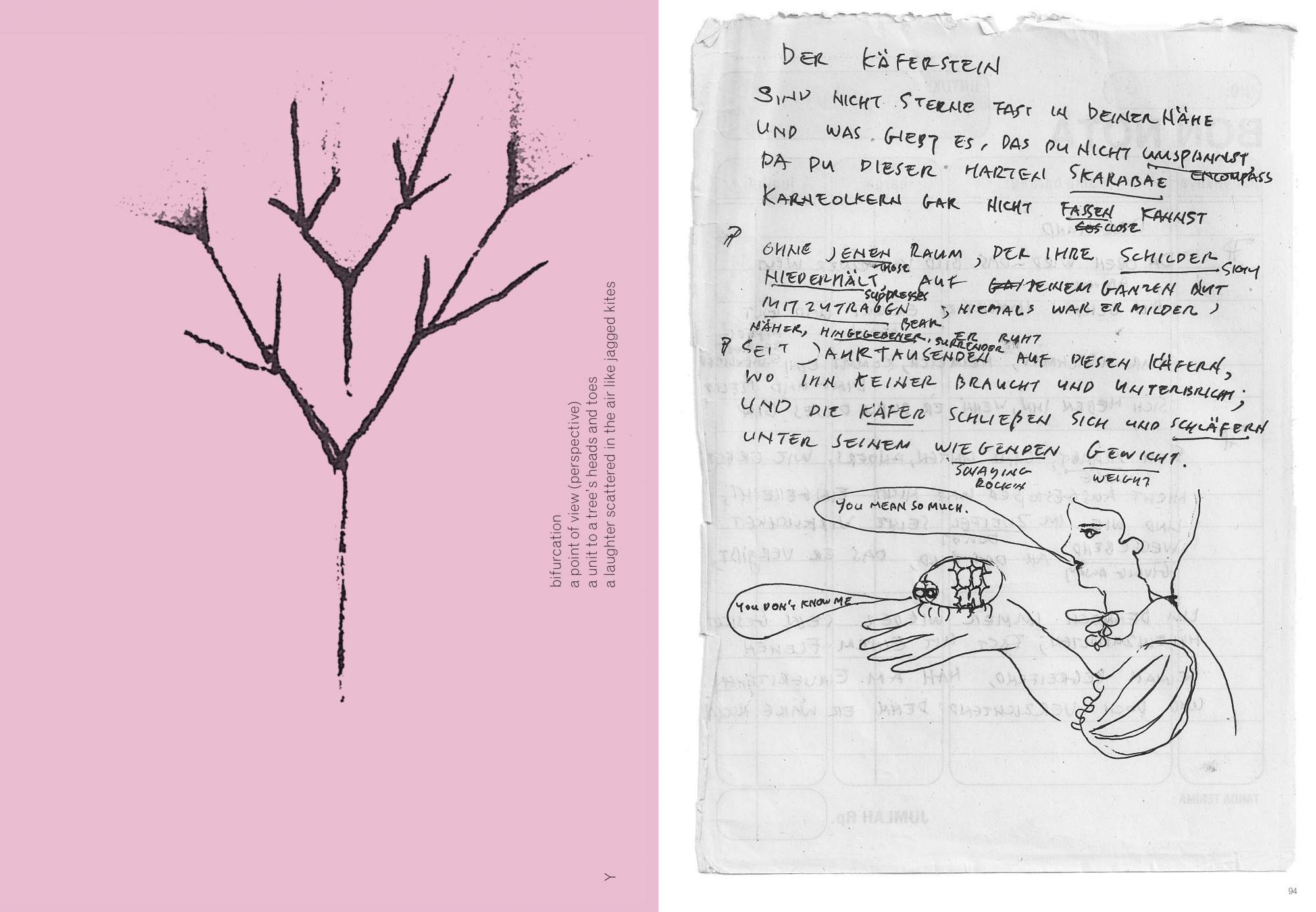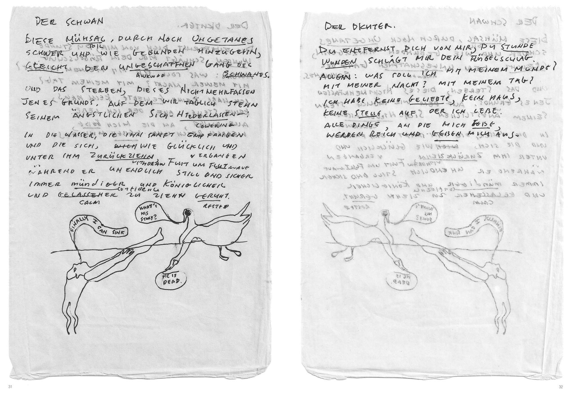 The artist’s book Ki-da Rilke evolved in relation to the exhibition “Line Wall” by Sung Hwan Kim. In the book, Kim engages with the work of the Prague born poet Rainer Maria Rilke (1875–1926). The first part of Ki-da Rilke features a transcription and drawings of Rilke’s collection “New Poems” (1907) in the German original and on thin sheets of paper and notepads. The second part features Kim’s drawings inspired by Rilke’s “Sonnets to Orpheus” (1923), which are then further developed in the book’s third part, which comprises an independent picture story featuring recurring characters. These figures are named in an index on loose sheets of paper.