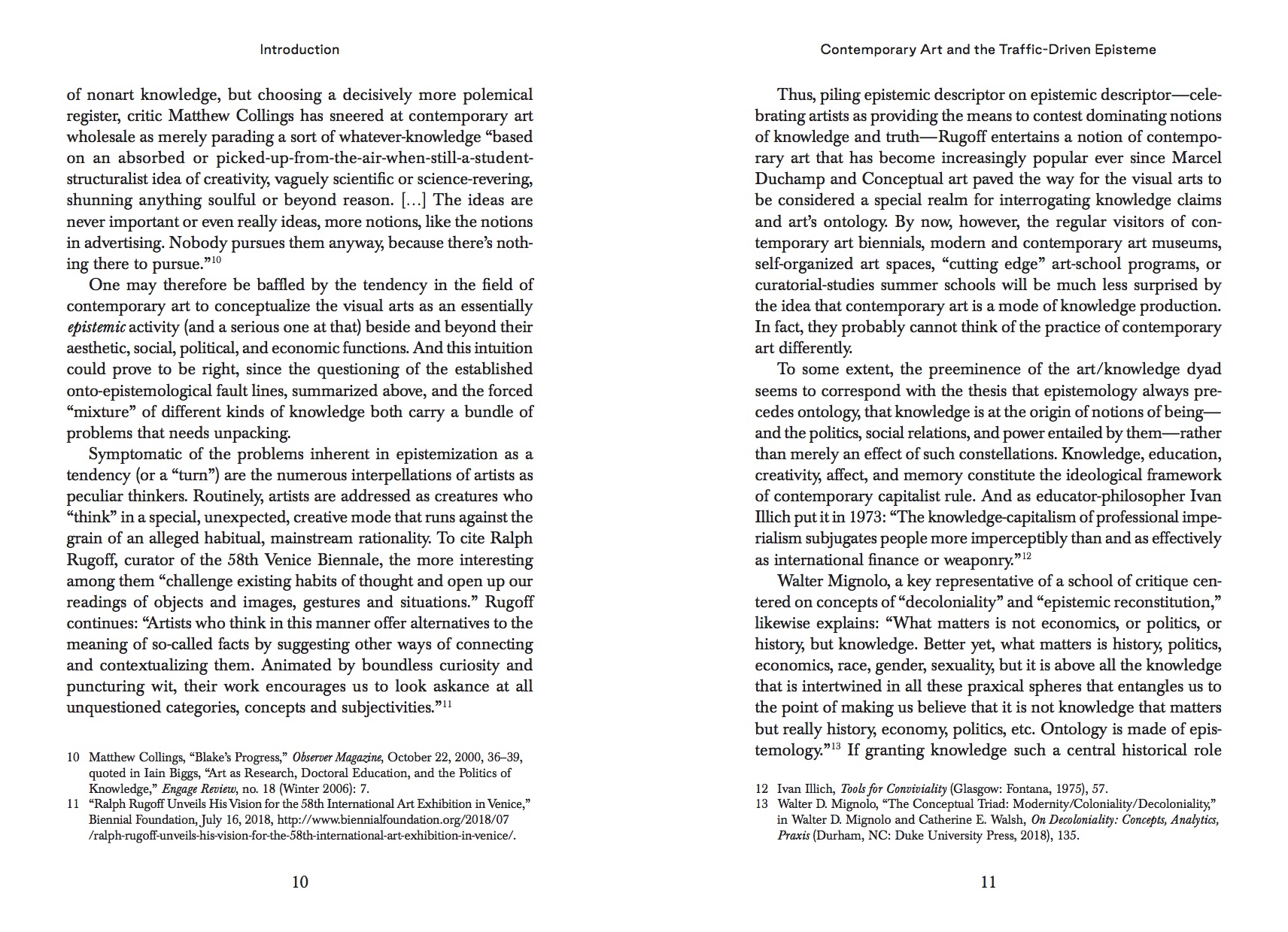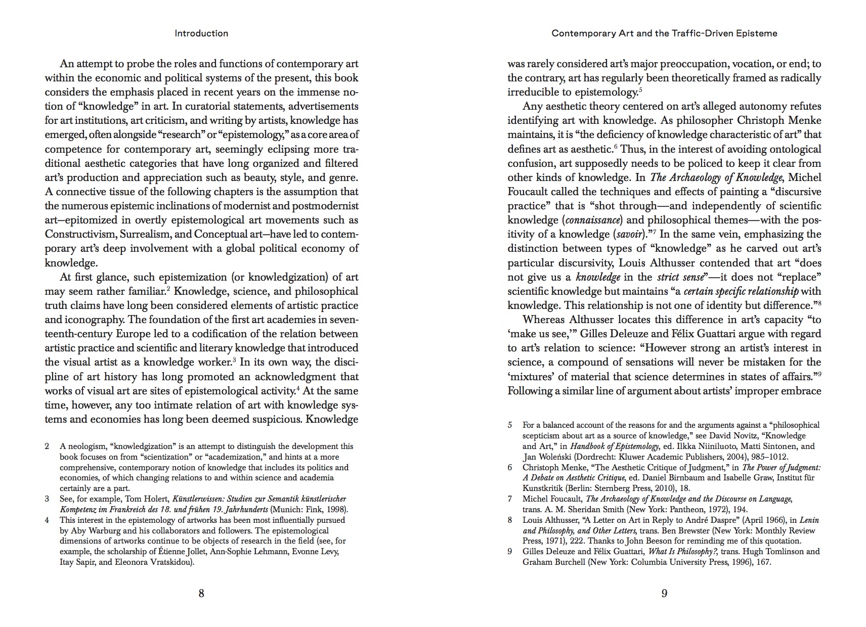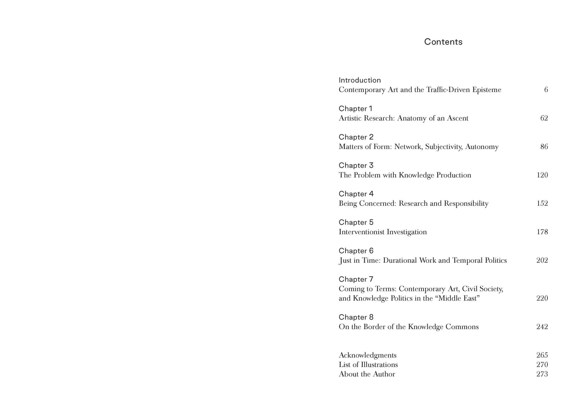 done the difficult job of precisely formulating the question that touches a core of art’s posture today. Through eight poignantly themed chapters, he takes us through the elusive avenues that constitute art’s now rarely contested claim to knowledge production, slowly carving out their figures, forms, and rhythms, leaving us with a nagging doubt; not the kind of doubt that incapacitates us, but the kind that gets us thinking and moving further.”