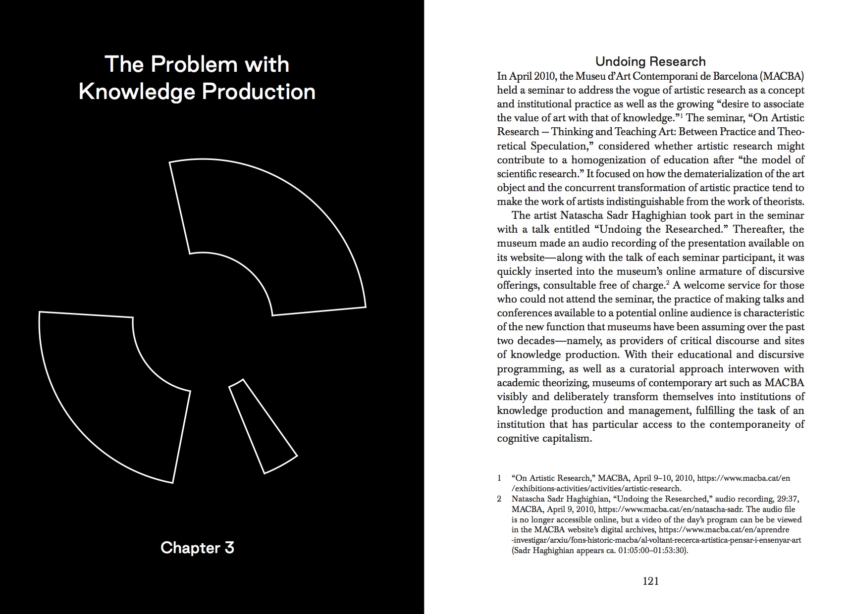 What is the role and function of contemporary art in economic and political systems that increasingly manage data and affect? Knowledge Beside Itself delves into the peculiar emphasis placed in recent years, curatorially and institutionally, on notions such as “research” and “knowledge production.” Considered as a specific, expansive mode of the culture industry, contemporary art is viewed here as a strategic bet on the social distinctions and value extractions made possible by claiming a different, novel access to “knowledge.” Contemporary art’s various liaisons with the humanities and the social and natural sciences, as well as its practitioners’ frequent embeddedness within transdisciplinary research environments and educational settings, have created a sense of epistemo-aesthetic departure, which concurs with the growing relevance of art as conduit or catalyst of knowledge.
