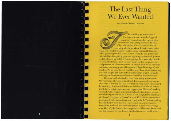 Class inevitably raises awkward questions regarding the very participants, their backgrounds, patrons, and ideological partialities. This is perhaps the reason why the role of class structure has been so easily overlooked in the production and presentation of contemporary art, especially so in an era where artists are coaxed into anthropological framings of their practice. What was it that made gender, sexuality, ethnicity, and nationality eclipse the class issue with such ease? Lapdogs of the Bourgeoisie presents a collaborative project with a number of practitioners that scrutinize their own positions, bias, and gaze within the hierarchy of cultural production. It seeks to identify the levels of affect class has in the field—from artists, through to curators, institutions, and even audiences—and also looks at the hidden anxieties involved, particularly in relation to the actual decision-makers in mainstream art.