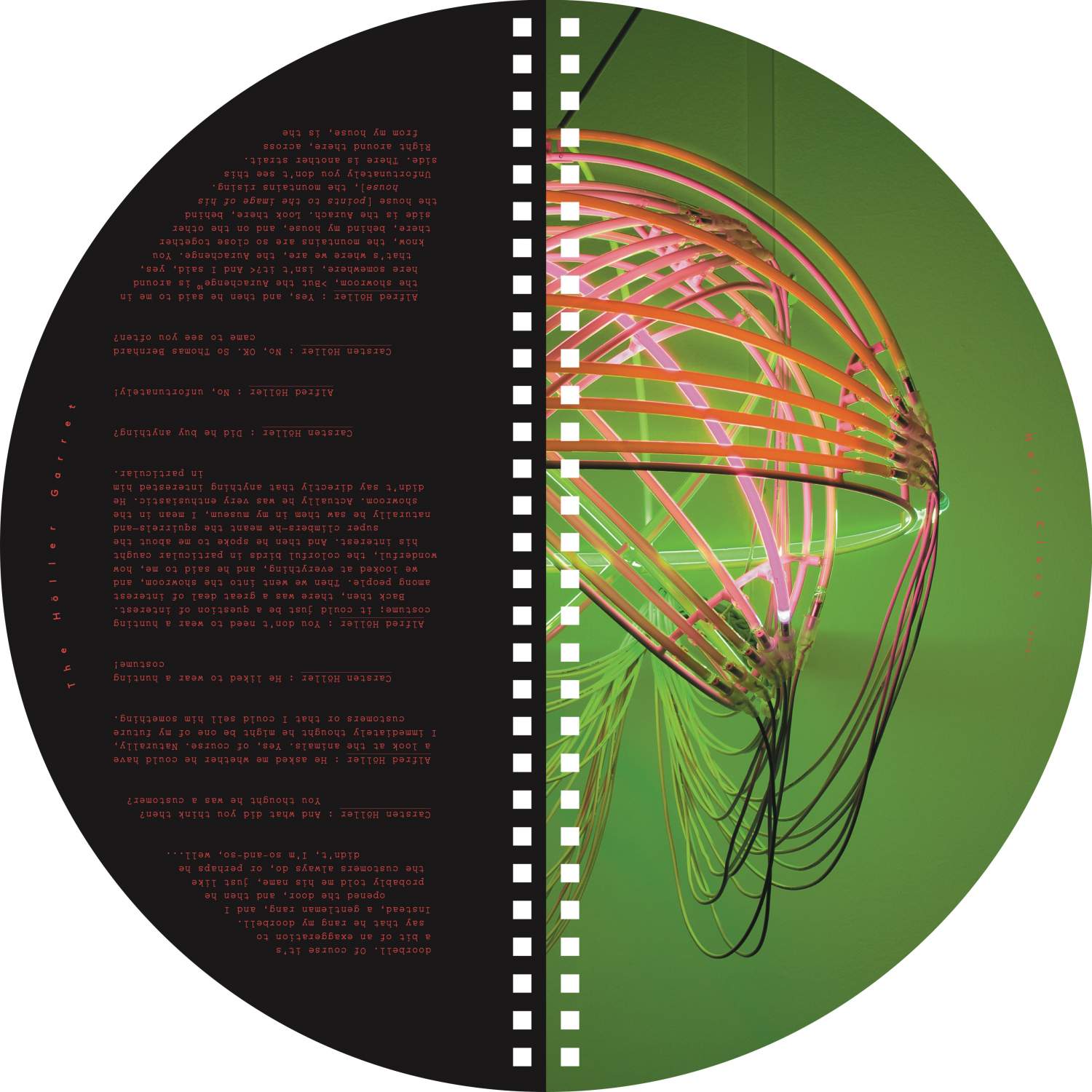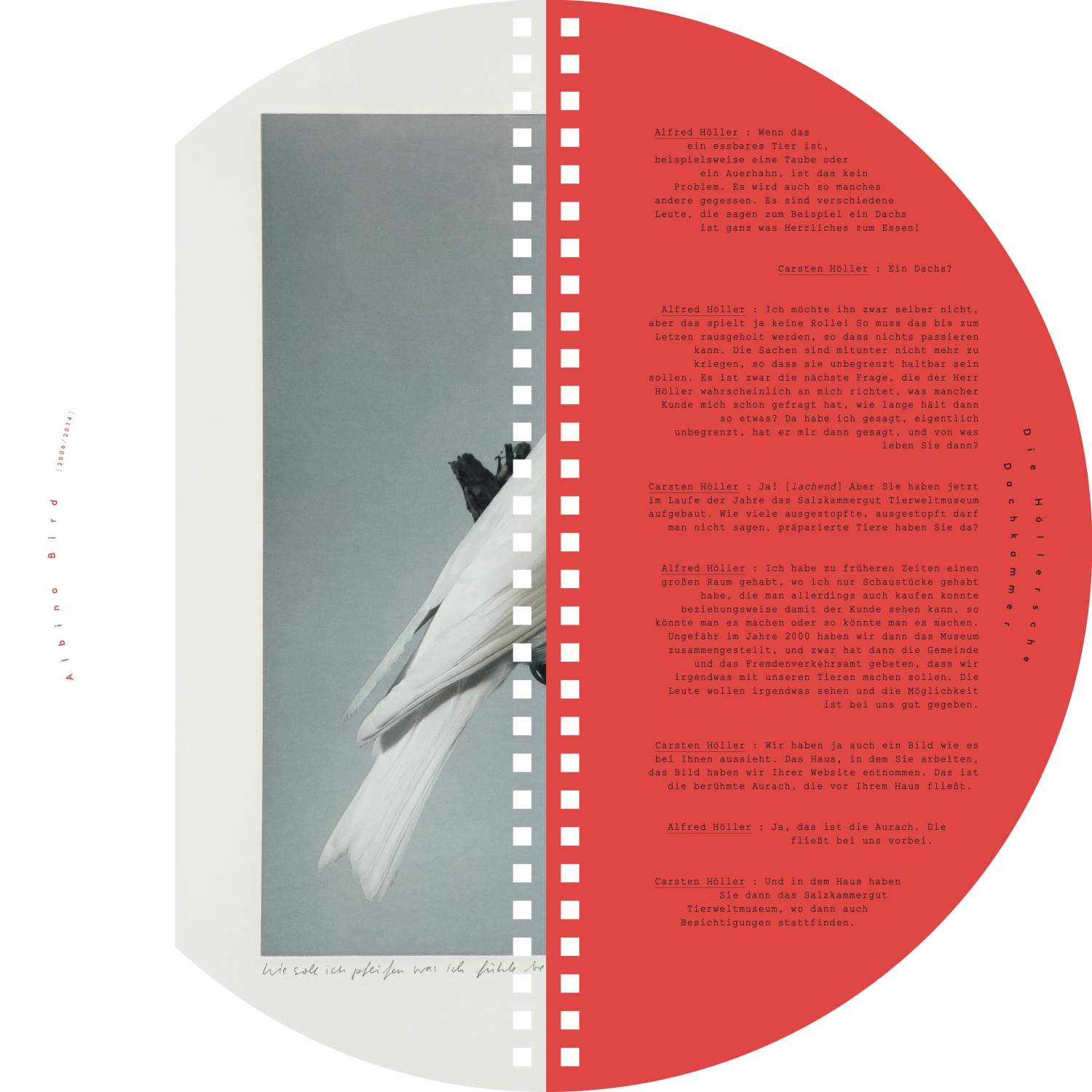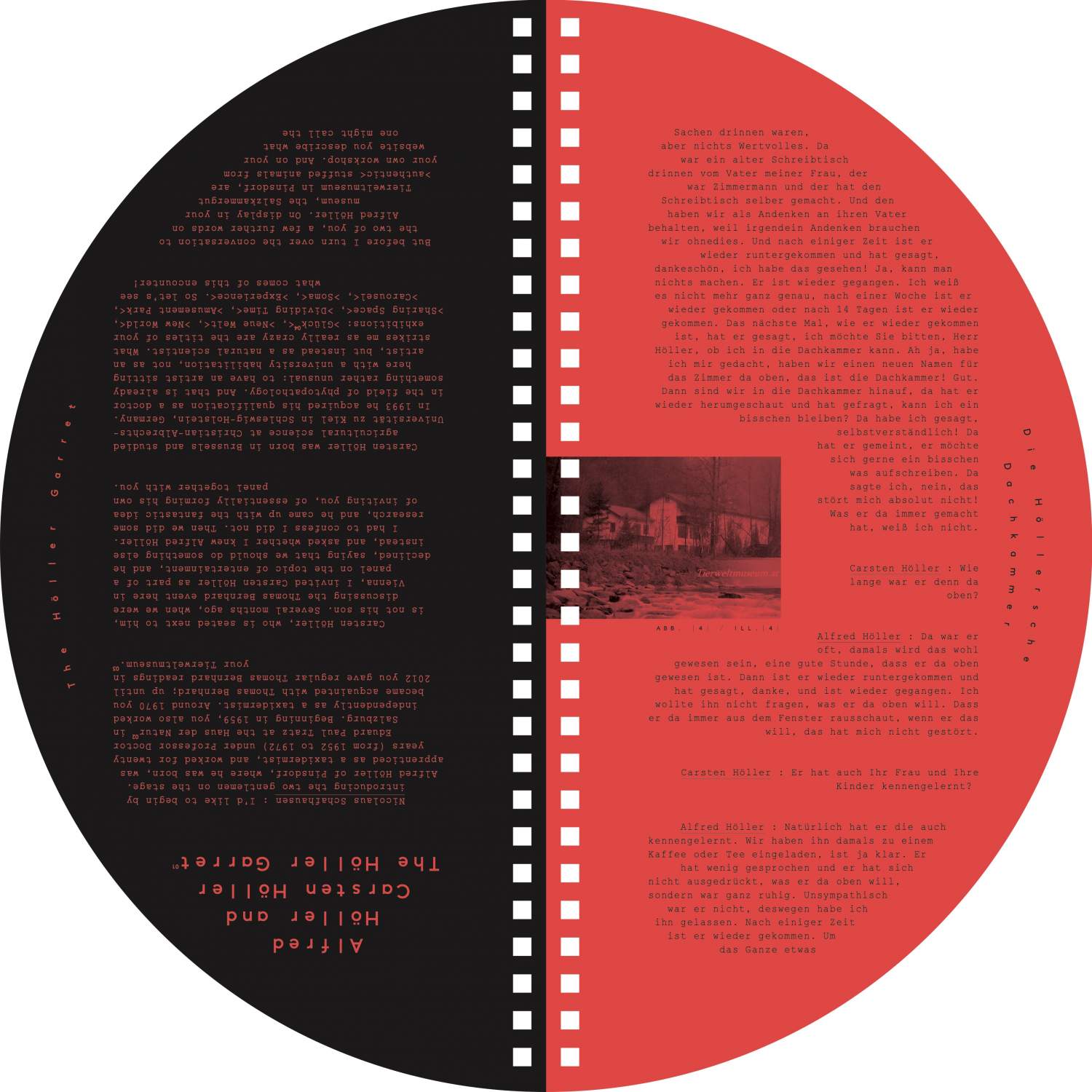 A catalogue as puzzling and conceptually elaborate as the exhibition it accompanies. This fully circular publication has no beginning or end, allowing for multiple points of entry and unconventional ways of reading—both from left to right and vice versa, as well as upside down and right-side up—seeking to interrupt learned behaviors and soliciting the reader's active engagement. It complements the exhibition as it unfolds a play of doubling and symmetry that references the exhibits both formally and in terms of content. This intertwining is also evident in the central text around which the catalogue pivots: a conversation between Carsten Höller—who gained academic experience in phytopathology before embarking on his artistic career—and the taxidermist Alfred Höller during the festival “#WWTBD - What Would Thomas Bernhard Do” at Kunsthalle Wien in 2013. Speaking about taxidermy (birds in particular) and the history of the origins of Thomas Bernhard's infamous novel Correction, which Bernard wrote in Alfred Höller's attic in 1974, the conversation examines conflicting areas between life and death, and between art and nature.