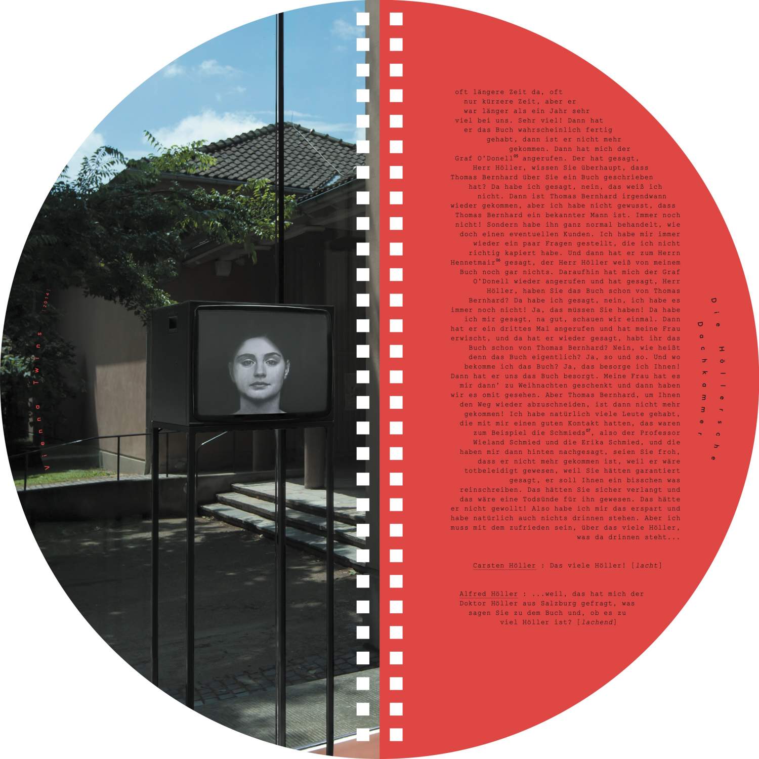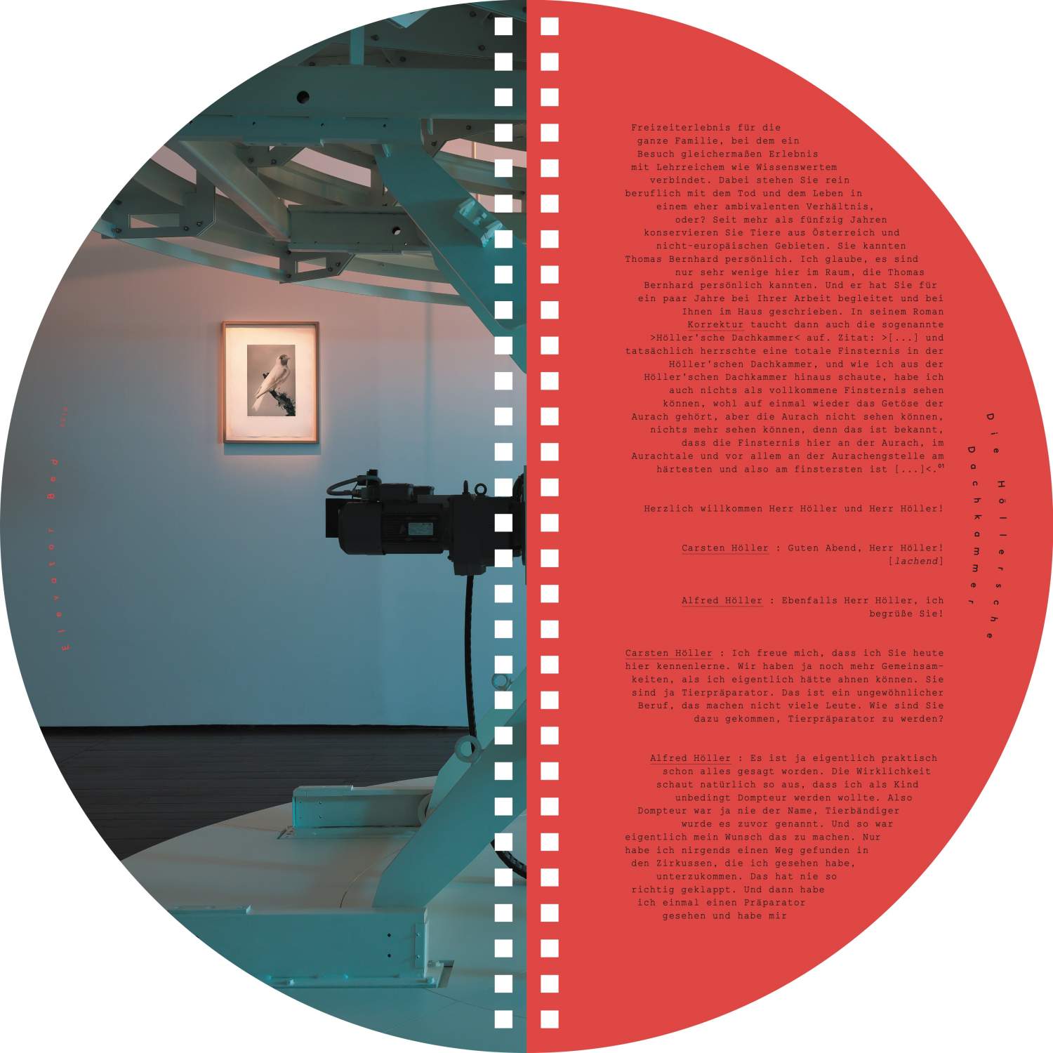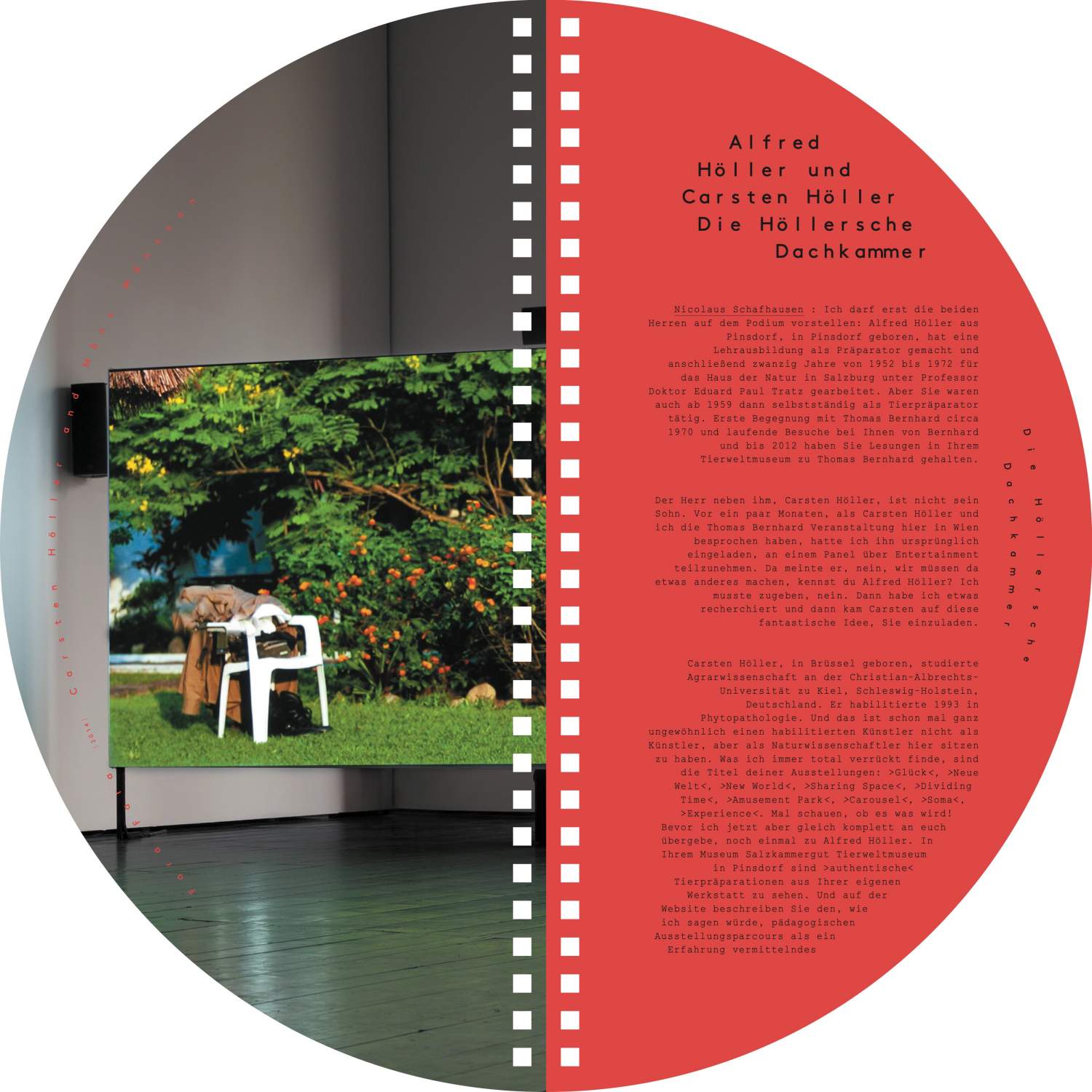A catalogue as puzzling and conceptually elaborate as the exhibition it accompanies. This fully circular publication has no beginning or end, allowing for multiple points of entry and unconventional ways of reading—both from left to right and vice versa, as well as upside down and right-side up—seeking to interrupt learned behaviors and soliciting the reader's active engagement. It complements the exhibition as it unfolds a play of doubling and symmetry that references the exhibits both formally and in terms of content. This intertwining is also evident in the central text around which the catalogue pivots: a conversation between Carsten Höller—who gained academic experience in phytopathology before embarking on his artistic career—and the taxidermist Alfred Höller during the festival “#WWTBD - What Would Thomas Bernhard Do” at Kunsthalle Wien in 2013. Speaking about taxidermy (birds in particular) and the history of the origins of Thomas Bernhard's infamous novel Correction, which Bernard wrote in Alfred Höller's attic in 1974, the conversation examines conflicting areas between life and death, and between art and nature.