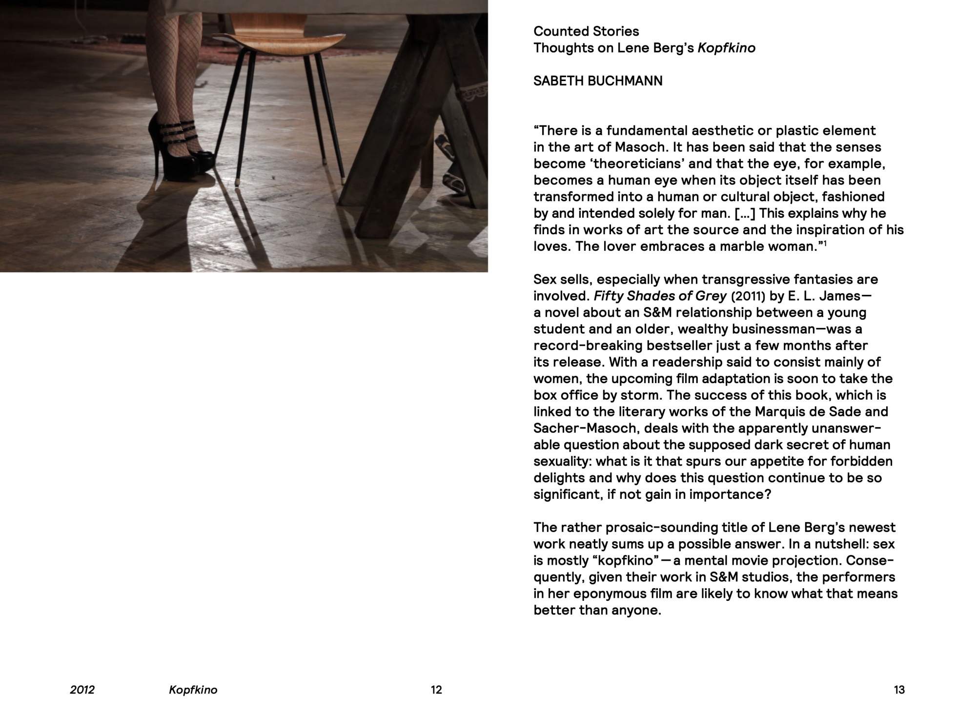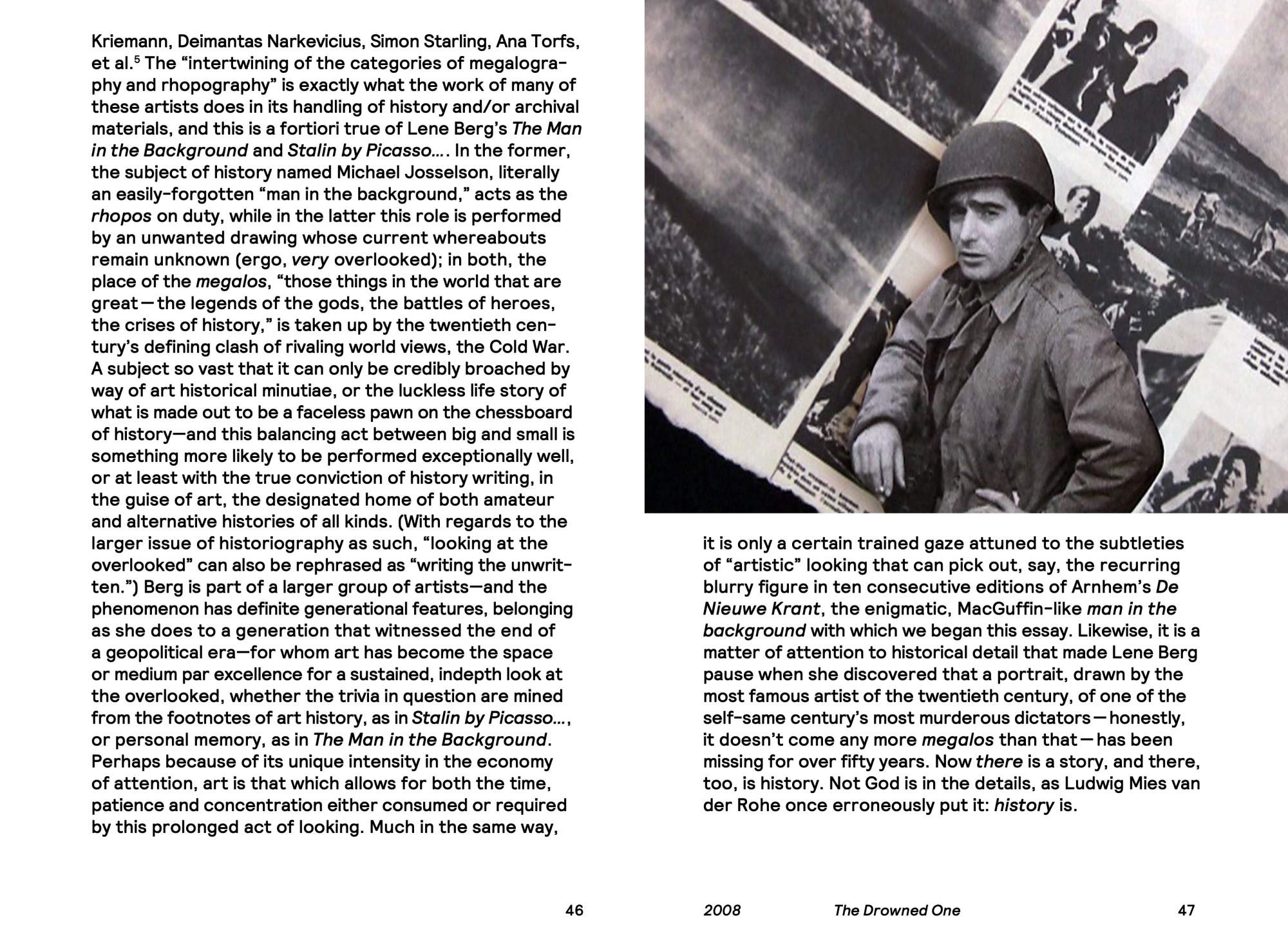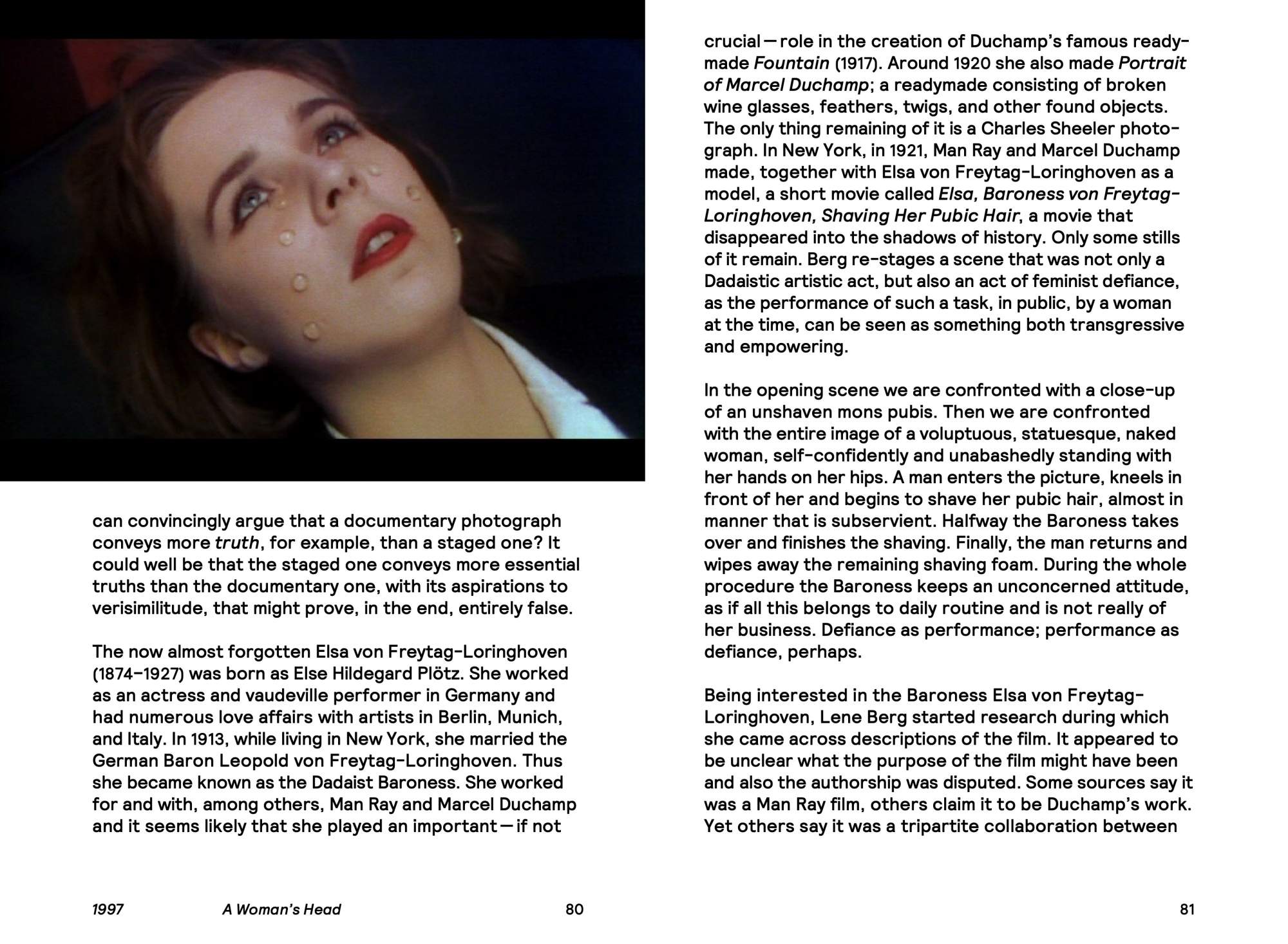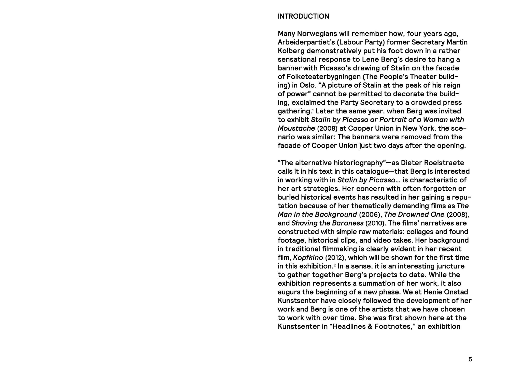 These parallel worlds are analyzed in this publication, which features essays by Sabeth Buchmann, who looks into the tensions of Kopfkino; Katerina Gregos, whose essay examines four of Berg’s earlier films; and Dieter Roelstraete, who provides an analysis of Berg’s ever-controversial work, Stalin by Picasso or Portrait of a Woman with Moustache (2008), among others.