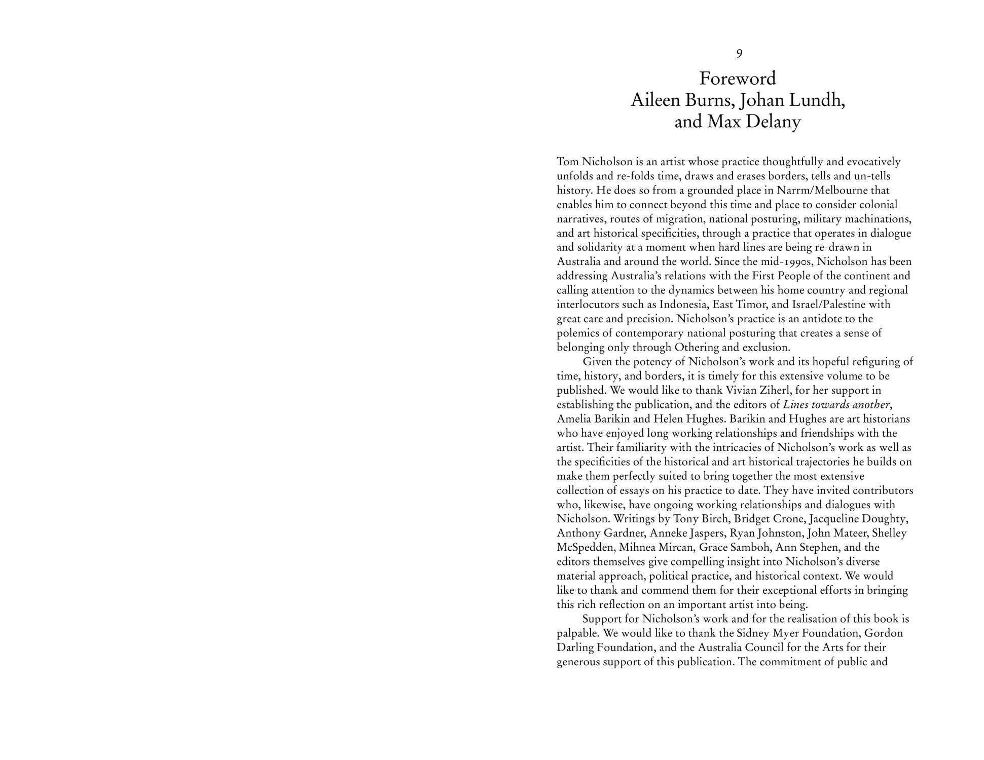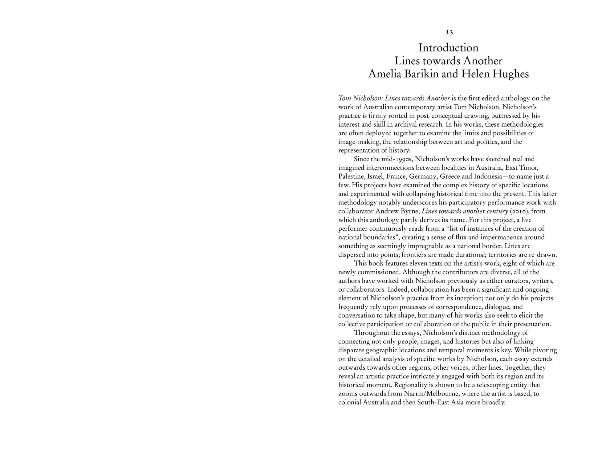 Lines towards Another is the first anthology on the work of Australian contemporary artist Tom Nicholson. Spanning drawing, sculpture, public actions, sound, installation, video, and performance, Nicholson’s work since the 1990s has engaged with critical questions around history, politics, narrative, and representation. Informed by the colonial history of Australia, and motivated by the work of Aboriginal Australian activists, his practice at its most fundamental level examines the role of images and monuments as both catalysts and potential barriers for the creation of histories, reimagining their forms through modes of commemoration. Presenting new research on the artist and providing an unprecedented overview of two decades of work, the book features eleven essays and two interviews, alongside richly illustrated project pages and texts by the artist.