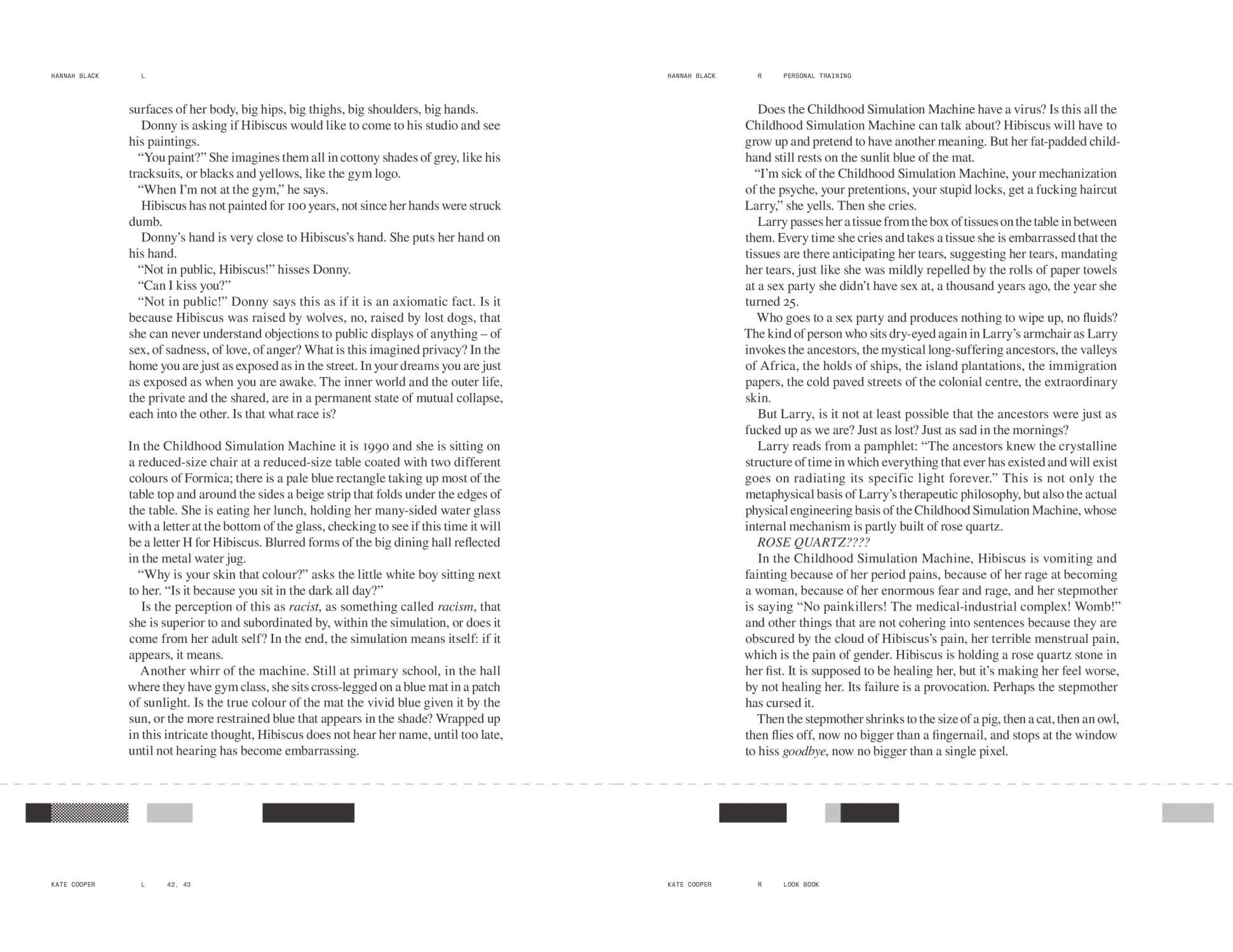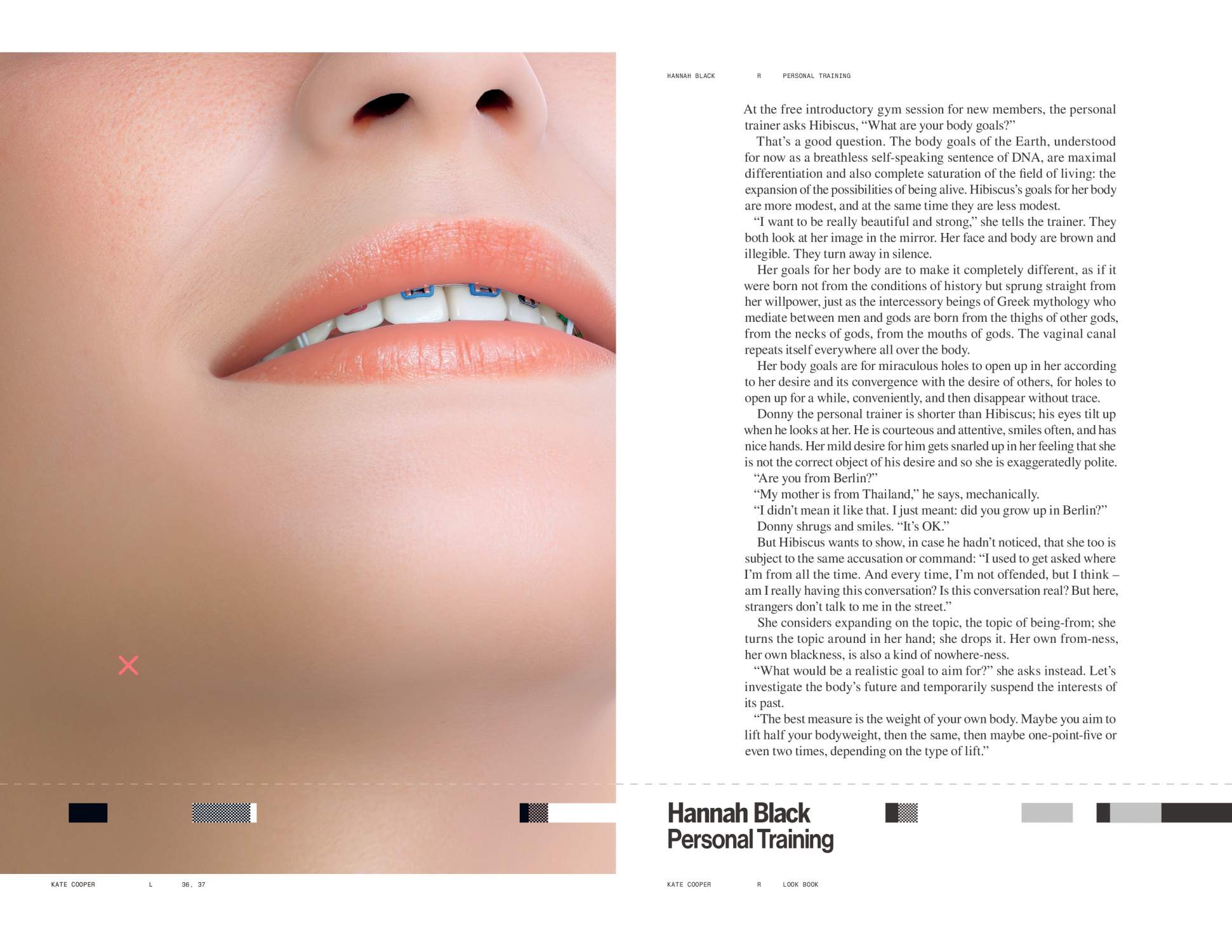 Along with Cooper’s new series of images, LOOK BOOK includes a new short story by Hannah Black titled “Personal Trainer,” appendices by KW curator Ellen Blumenstein, an introduction by Christina Weiss, and subtitles and slogans (“Is seeing everything? Are you all-unseeing?”) by Catherine Wood.