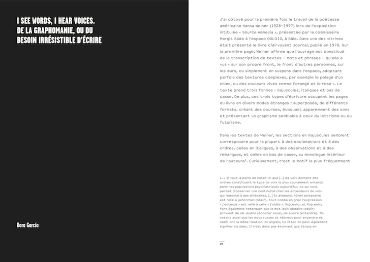 Mad Marginal Cahier #4: I See Words, I Hear Voices brings together essays by international authors that develop different threads pertaining to artist Dora García’s practice. In her research, she explores—through the figures of James Joyce and Robert Walser—deviant literature, exploded language, the unconscious, and the notion of exile as inherent to artistic practice. García is currently examining voice-hearing and other extrasensory perceptions. Mad Marginal Charts, an abstract mapping of references central to her idea of marginality as an artistic position, marks her trajectory in this new cycle of works, which has been featured and elaborated in exhibitions in 2014 and 2015.