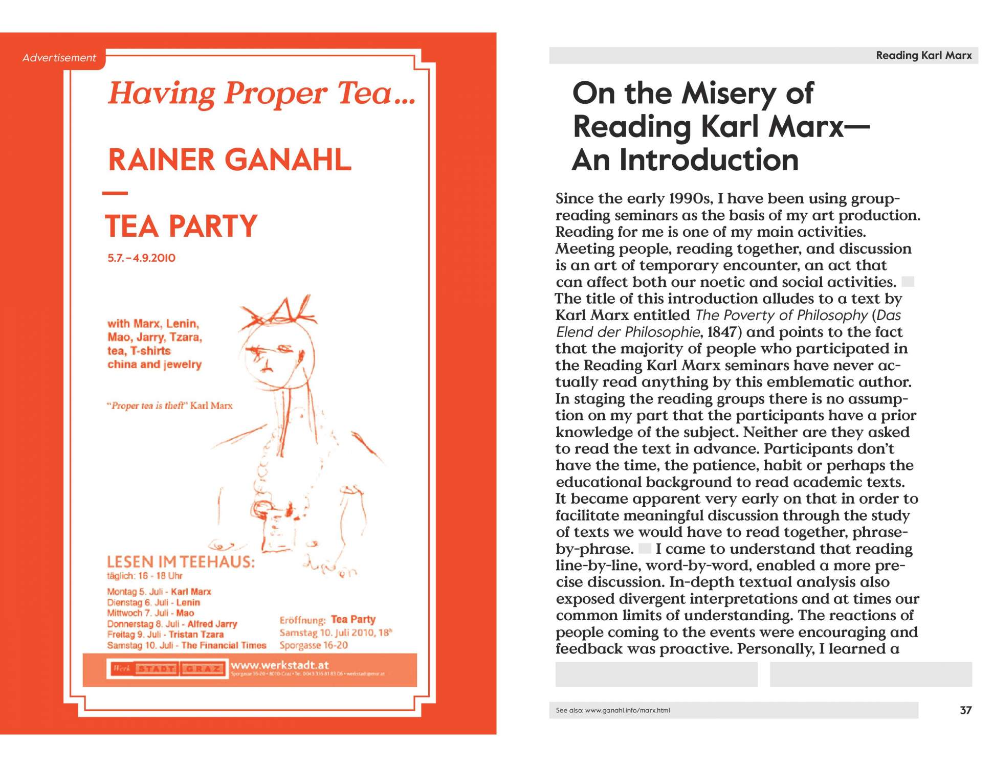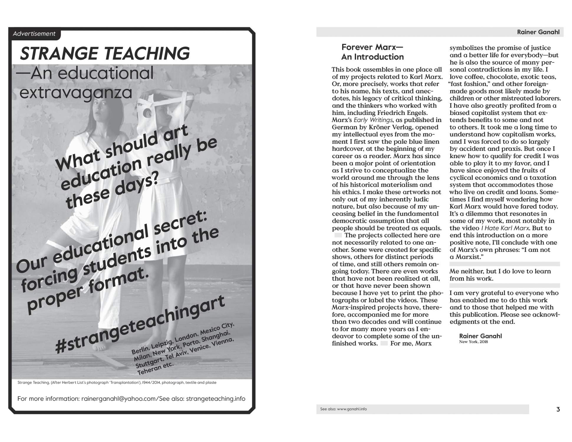 The artist Rainer Ganahl has been creatively adapting the writings of Karl Marx to his own work since the 1990s. The German philosopher’s ideas have galvanized projects such as Ganahl’s irreverent fashion show Commes des Marxists, a series of obscene food sculptures inspired by the “credit crunch” of 2008, and a Karl Marx fire extinguisher, which allows the thinker’s wisdom to be sprayed onto any conflict. There has never been a more fitting time, however, for the release of this book, which appears on the 10th anniversary of the global financial crisis, and 200 years after Marx’s birth. In more than 700 pages, Manhattan Marxism assembles essays, photos, and other documentation from dozens of Ganahl’s Marx-themed projects from the past decade.