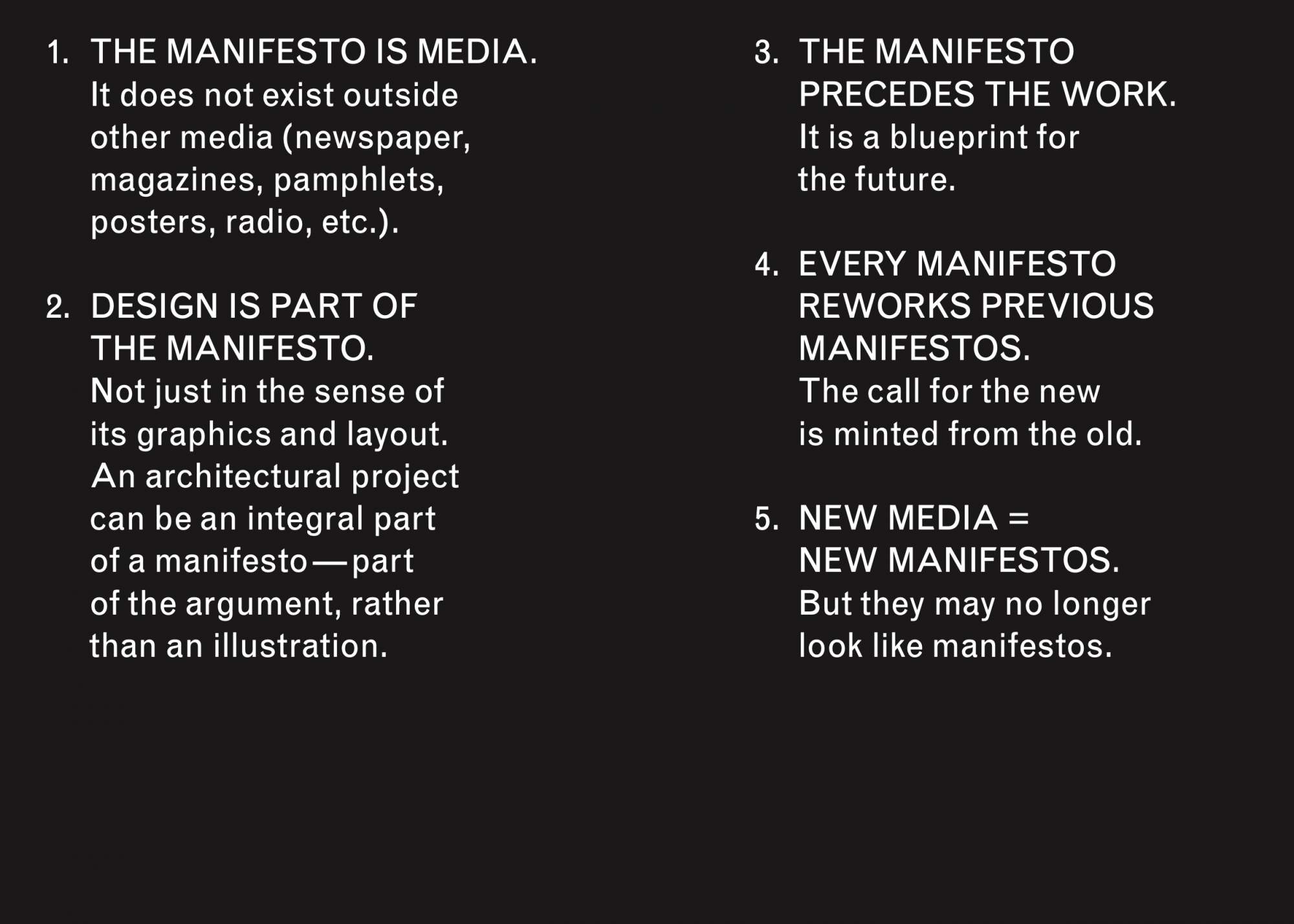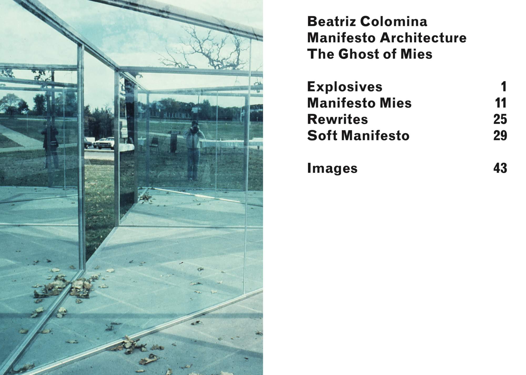 In the third book in the Critical Spatial Practice series, Beatriz Colomina traces the history of the modern architecture manifesto, with particular focus on Mies van der Rohe, and the play between the written and built work. This essay propels the manifesto form into the future, into an age where electronic media are the primary sites of debate, suggesting that new forms of manifesto are surely emerging along with new kinds of authorship, statement, exhibition, and debate.