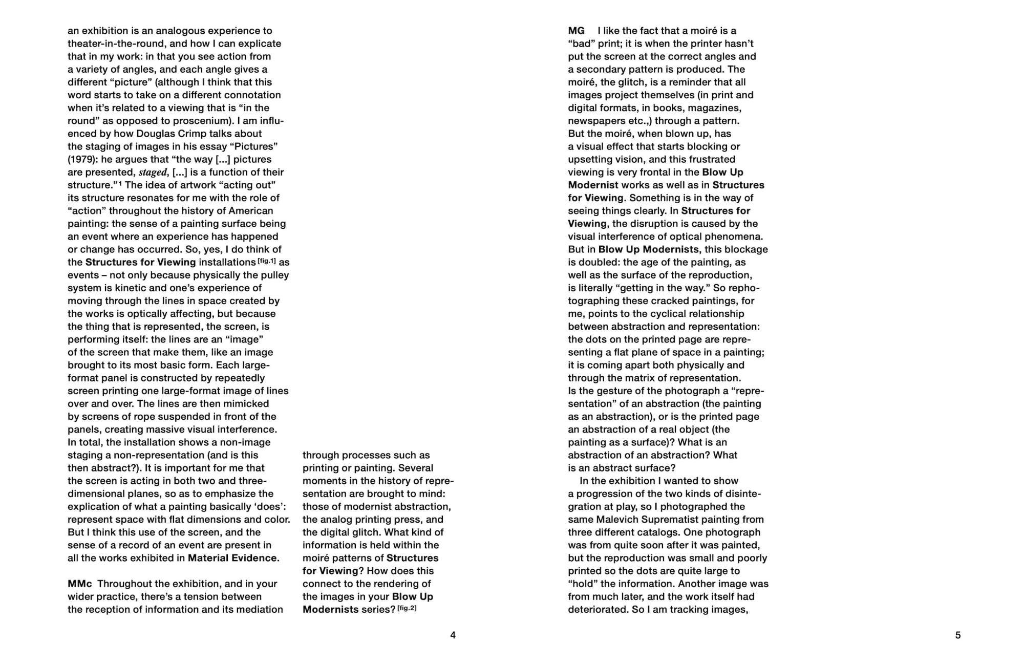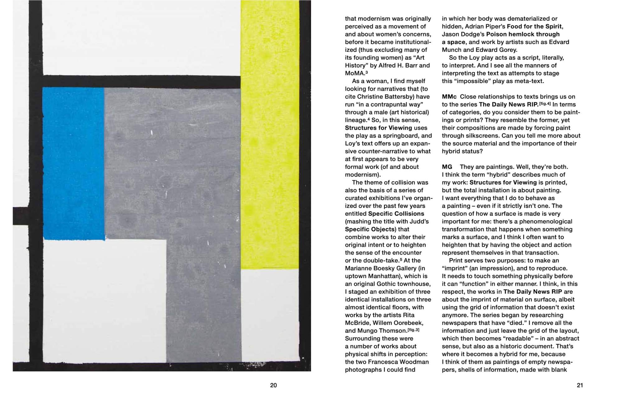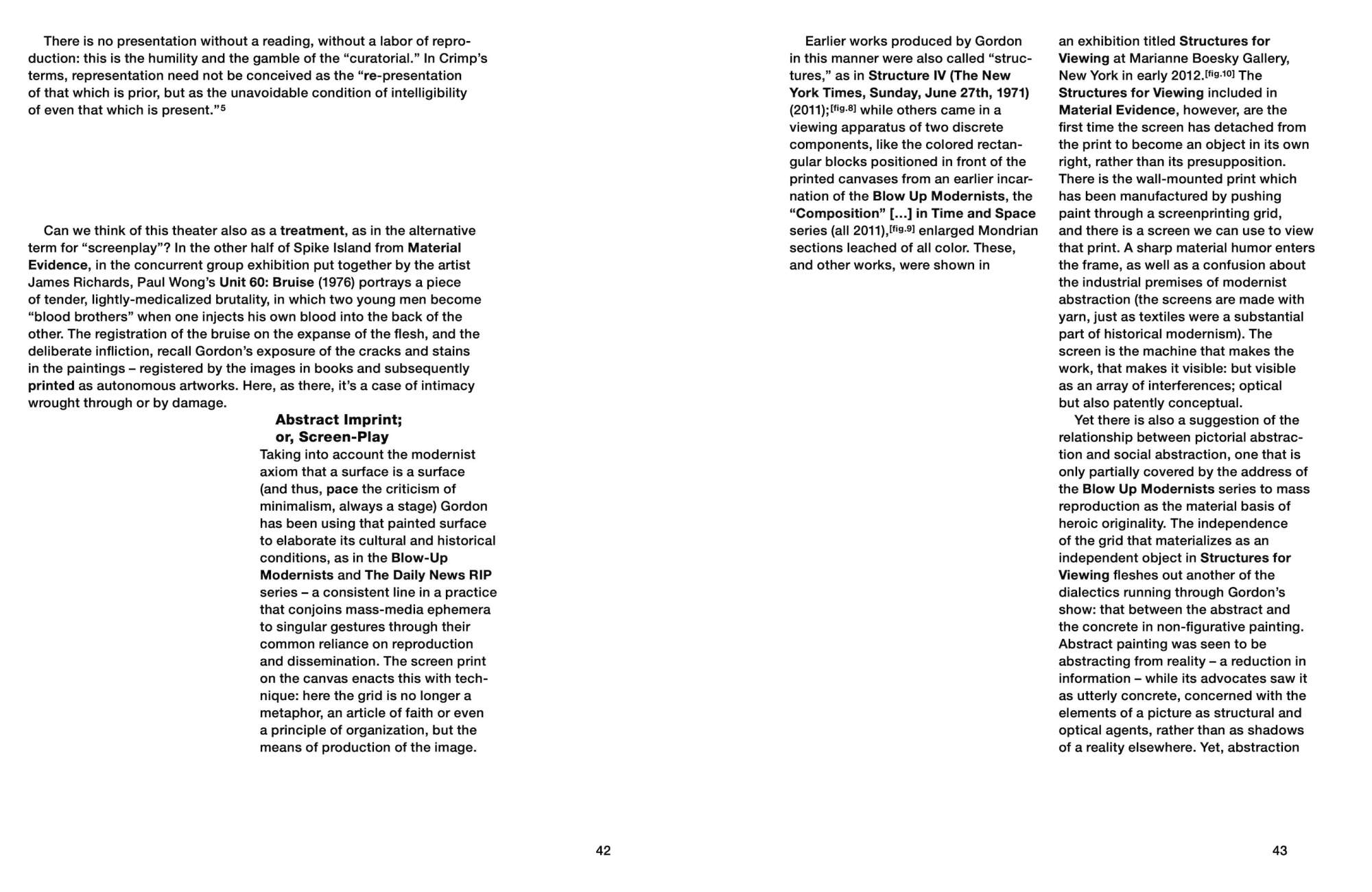 Material Evidence expands on the formal concerns and critical debates developed through Melissa Gordon’s exhibition of the same name, following a joint residency with Spike Island and Spike Island Print Studio in Bristol, in the summer of 2013. Gordon’s work as a painter and printmaker follows the relationship between representation and abstraction; she often enlarges details to reveal hidden structures, zooming in until textual or pictorial information is reduced to dots and lines. The publication navigates through four concurrently exhibited and ongoing series (Structures for Viewing, Blow Up Modernists, The Daily News RIP, and Material Evidence) installed at Spike Island.