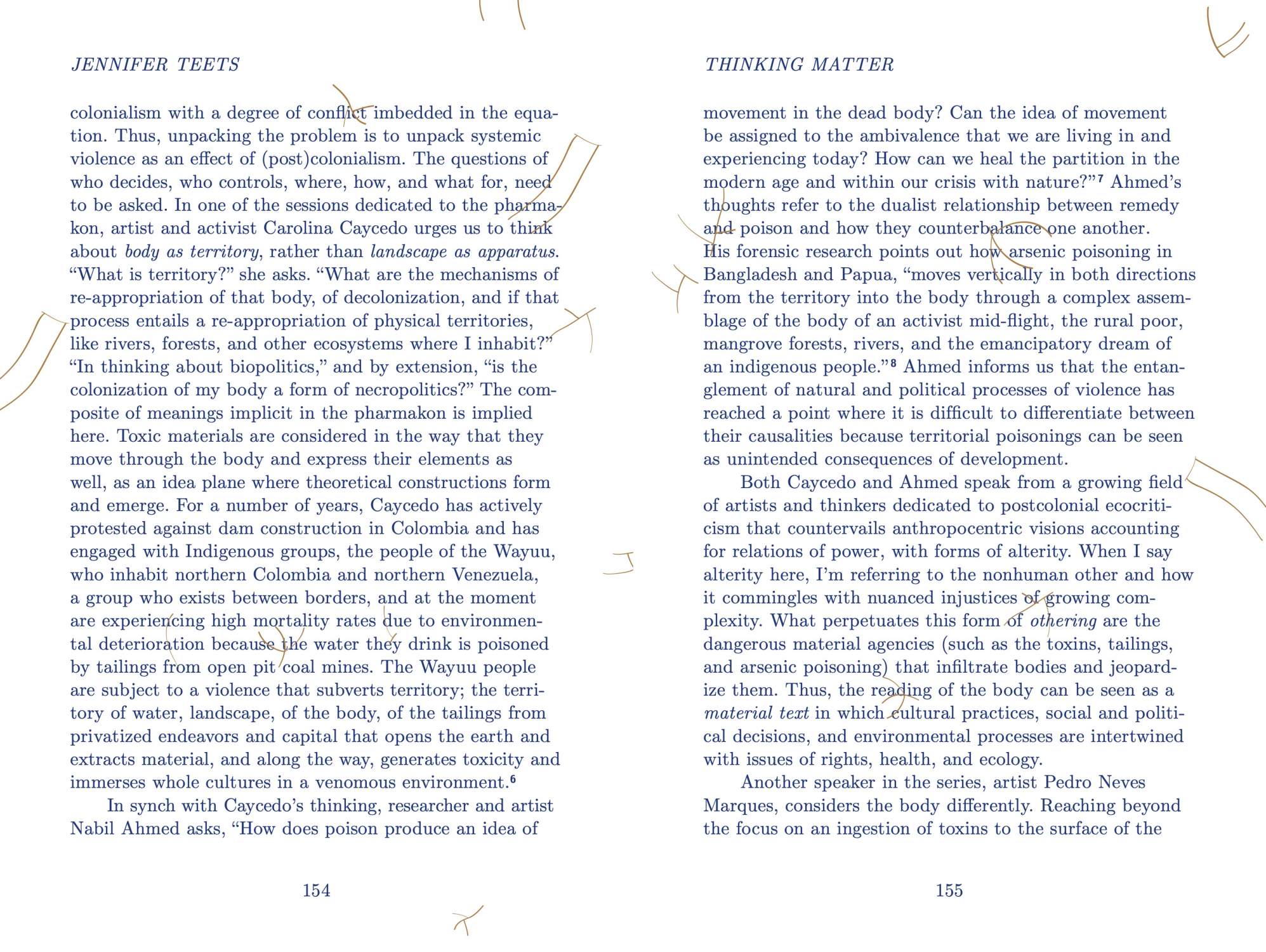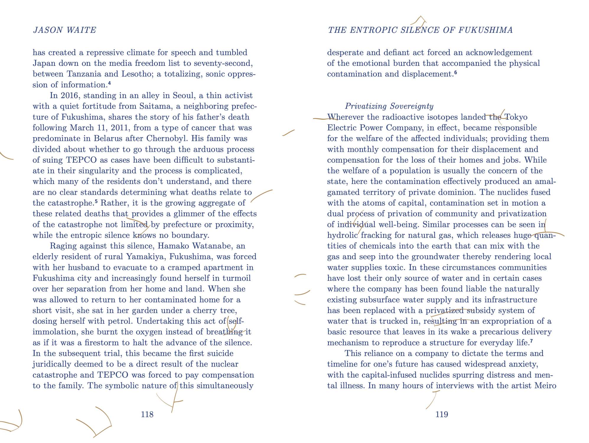 The texts are oriented around the four threads that structured the exhibition. The science-fiction approach to the ethics of code and digital space is addressed in the texts by Kodwo Eshun of the Otolith Group, Ccru (Cybernetic culture resource unit), and N. Katherine Hayles, and the excerpt from 0(rphan)d(rift>)’s 1995 novel Cyberpositive. Contemporary psychogeophysics and the material realities of the digital are explored by Jussi Parikka’s text and printed drawings throughout the book based on Joana Escoval’s sculptures on electromagnetic conduction. The hybridity of contemporary bodies and rituals is contextualized by Margarida Mendes’s essay on agribusiness and GMOs. And the critique of technocratic and extractionist environmental policies is represented by Jason Waite’s text on Fukushima and artist statements by Ursula Biemann and Mariana Silva. The contributions from Jennifer Teets and Francis McKee straddle all four threads—Teets’s through a reflection on the ongoing series at Museu Berardo, The World in Which We Occur, which she organizes with Mendes, and McKee’s through a newly commissioned work of fiction.