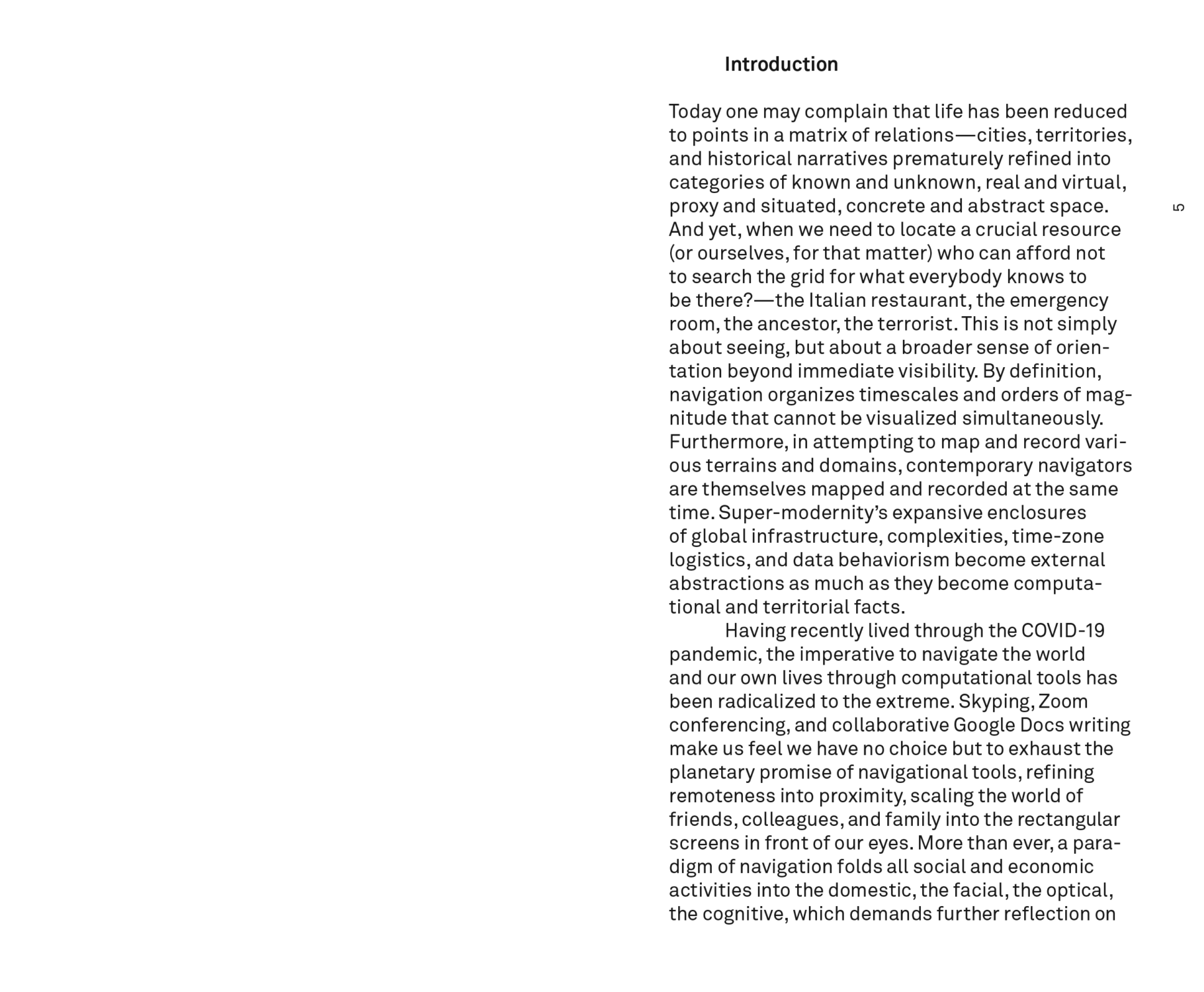 Navigation begins where the map becomes indecipherable. Navigation operates on a plane of immanence in constant motion. Instead of framing or representing the world, the art of navigation continuously updates and adjusts multiple frames from viewpoints within and beyond the world. Navigation is thus an operational practice of synthesizing various orders of magnitude.