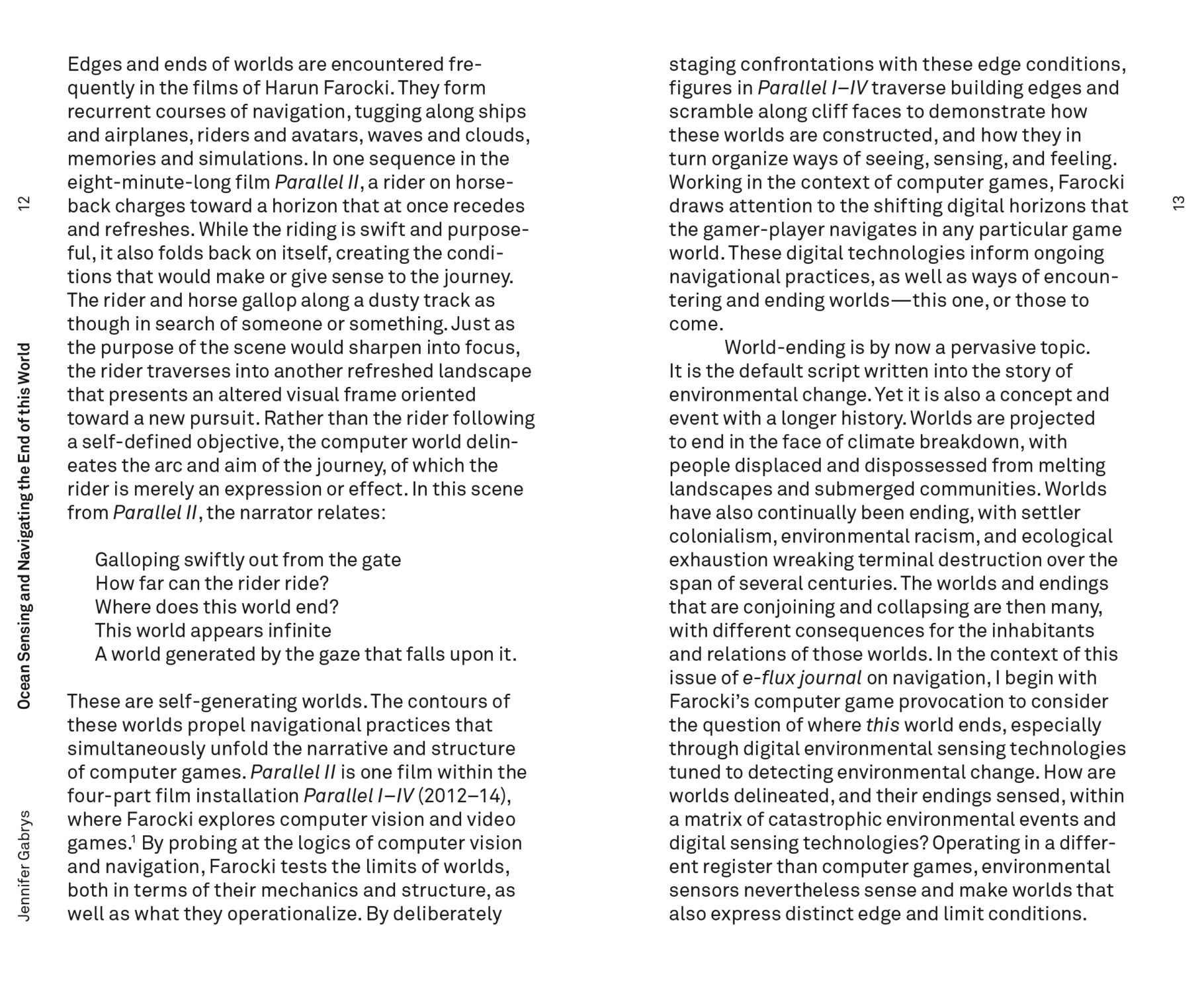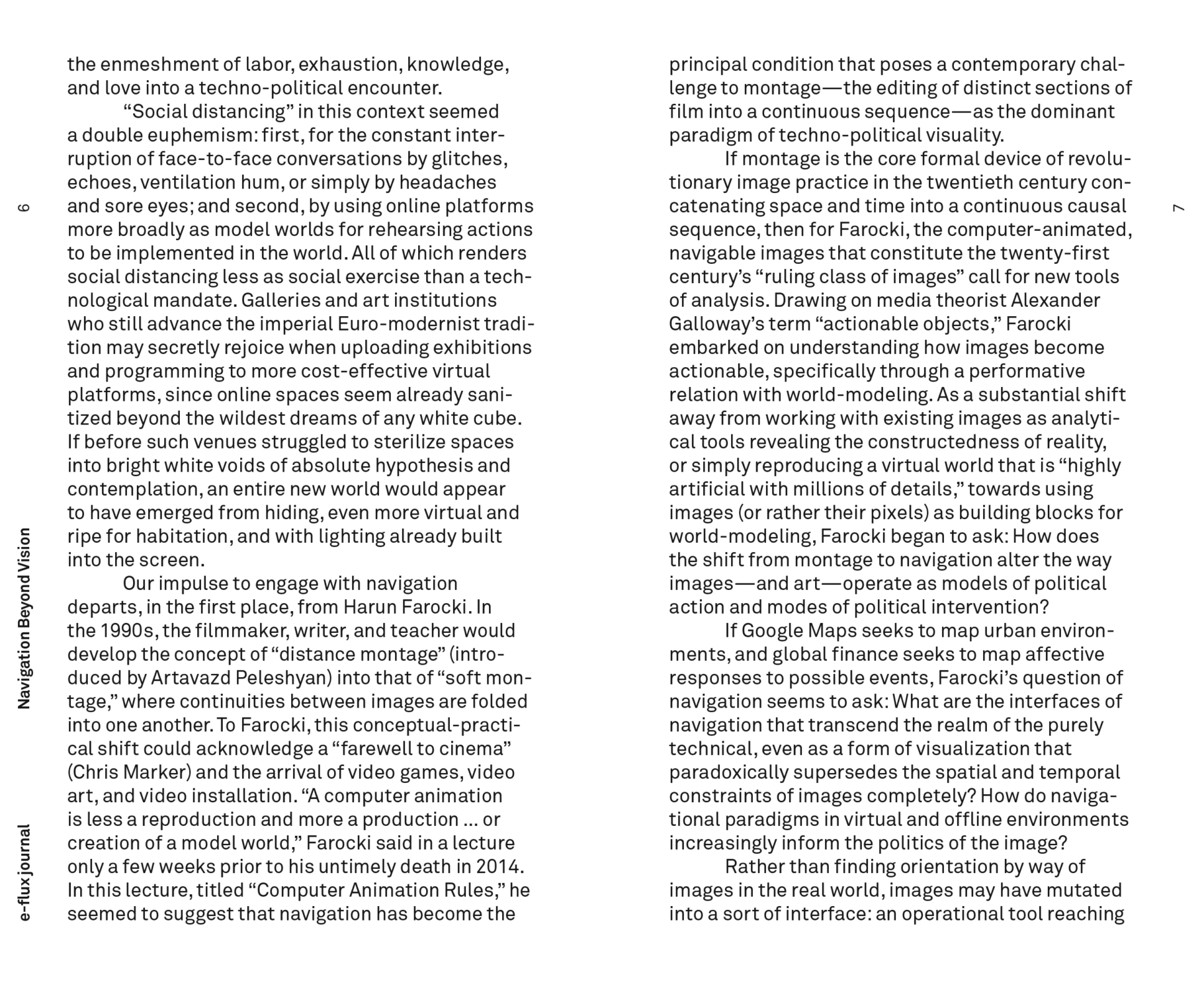 Only a few weeks prior to his untimely death in 2014, Harun Farocki briefly referred to navigation as a contemporary challenge to montage—editing distinct sections of film into a continuous sequence—as the dominant paradigm of techno-political visuality. For Farocki, the computer-animated, navigable images that constitute the twenty-first century’s “ruling class of images” call for new tools of analysis, prompting him to ask: How does the shift from montage to navigation alter the way images—and art—operate as models of political action and modes of political intervention?