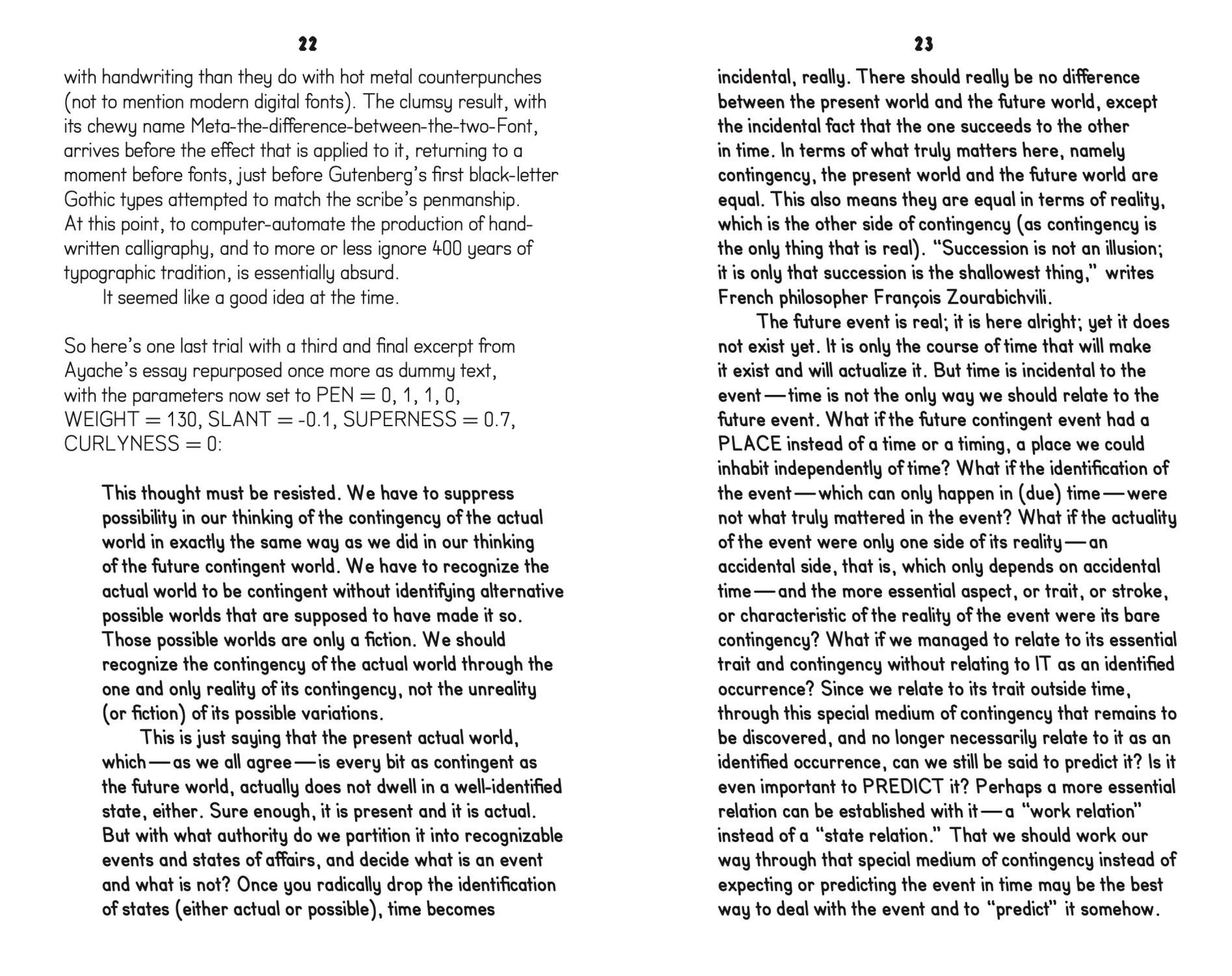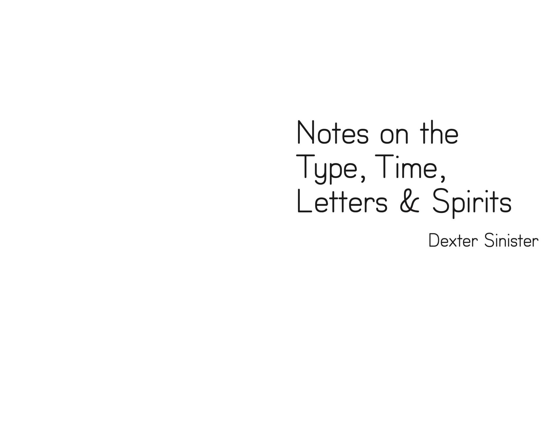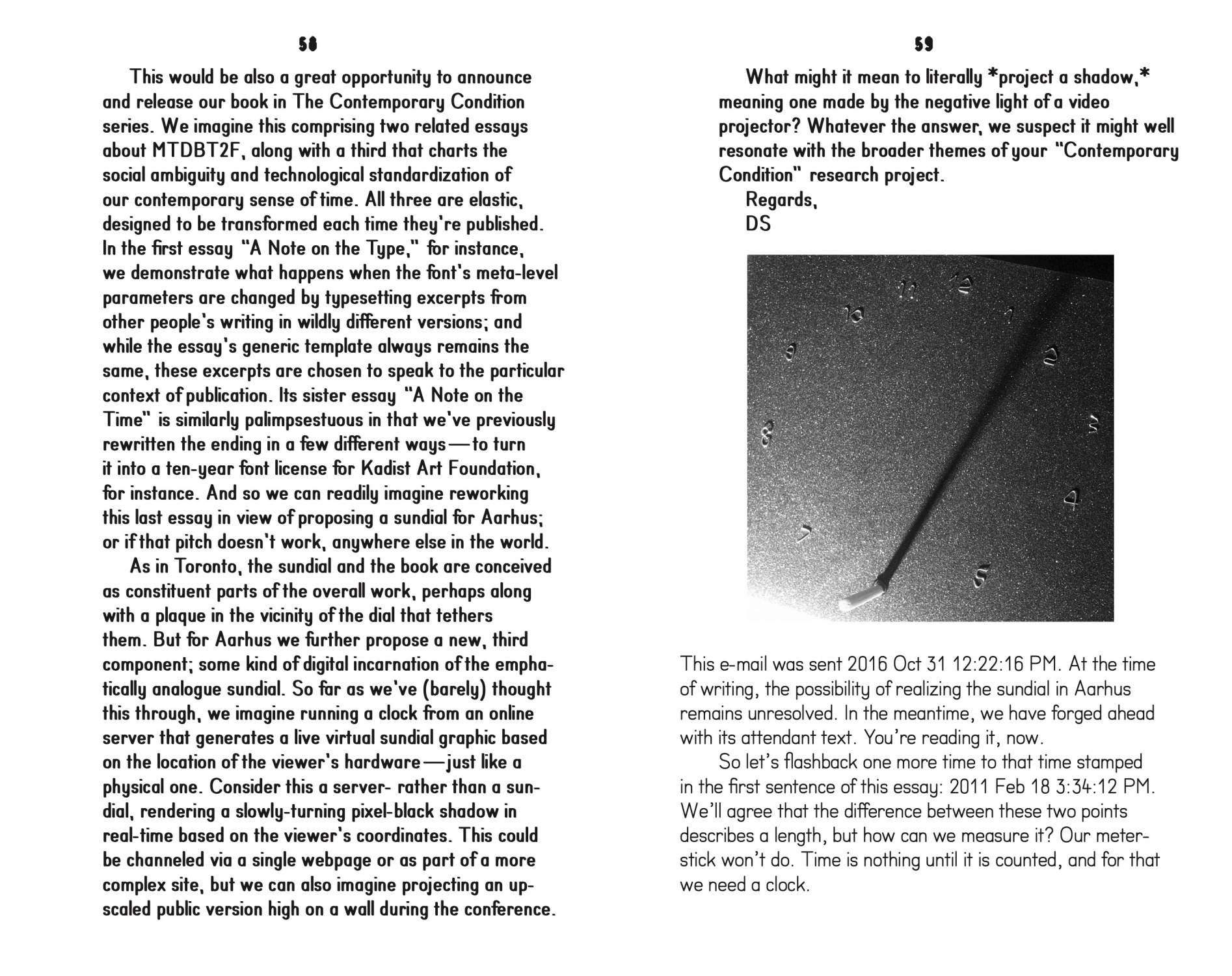 Three interconnected palimpsest essays recount (1) the backstory of a “meta” font recently updated by Dexter Sinister and used to typeset the Contemporary Condition book series, (2) a broad history of the rationalization of letterforms that considers the same typeface from “a higher point of disinterest,” and (3) a pending proposal for a sundial designed to operate in parallel physical and digital realms. Along the way they contemplate the ambiguous nature of our shared idea of *time* itself.